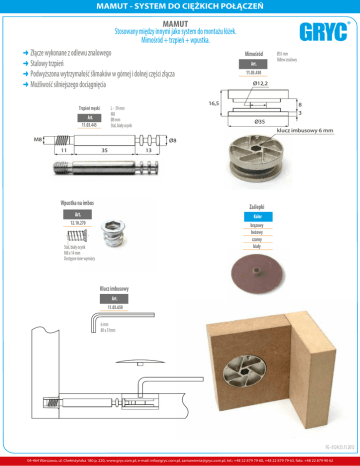 MAMUT - SYSTEM DO CIĘŻKICH POŁĄCZEŃ MAMUT Stosowany między innymi jako system do montażu łóżek. Mimośród + trzpień + wpustka. ‹ Złącze wykonane z odlewu znalowego ‹ Stalowy trzpień ‹ Podwyższona wytrzymałość ślimaków w górnej i dolnej części złącza ‹ Możliwość silniejszego dociągnięcia Trzpień męski Art. Ø35 mm Odlew znalowy 11.03.430 Ø12,2 16,5 L - 59 mm M8 Ø8 mm Stal, biały ocynk Art. 11.03.445 Mimośród 8 3 Ø35 klucz imbusowy 6 mm M8 Ø8 11 35 13 Wpustka na imbus Zaślepki Art. Kolor 12.10.270 brązowy beżowy czarny biały Stal, biały ocynk M8 x 14 mm Dostępne inne wymiary Ø40 Klucz imbusowy Art. 11.03.650 6 mm 80 x 31mm FG - 0124/23.11.2012 04-464 Warszawa, ul. Chełmżyńska 180 p. 220, www.gryc.com.pl, e-mail: [email protected], [email protected], tel.: +48 22 879 79 60, +48 22 879 79 63, faks: +48 22 879 90 62