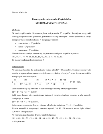 Marian Maciocha Rozwiązanie zadania dla Czytelników MATEMATYCZNY STRZAŁ Zadanie: W turnieju piłkarskim dla matematyków wzięło udział 24 zespołów. Turniejowe rozgrywki zostały przeprowadzone systemem „jeden mecz – każdy z każdym”. Premie punktowe za każdy rozegrany mecz zostały ustalone w następujący sposób: zwycięstwo – 23 punktów, remis – 21 punktów, przegrana – 20 punktów. Na zakończenie turnieju okazało się, że punktowe zdobycze zespołów wynoszą: 101, 88, 81, 75, 74, 68, 61, 60, 59, 45, 39, 32, 31, 31, 30, 30. Ile meczów zakończyło się remisem ? Rozwiązanie: W turnieju piłkarskim dla matematyków wzięło udział 24 = 16 zespołów. Turniejowe rozgrywki zostały przeprowadzone systemem „jeden mecz – każdy z każdym”, więc liczba wszystkich rozegranych meczów wynosi: 16 ( 16! 16! 16 * 15 * 14! 16 * 15 ) = –––––––––––– = –––––––– = –––––––––––– = –––––––– = 8 * 15 = 120. 2 2! * (16 – 2)! 2! * 14! 2 * 1 * 14! 2 Jeśli mecz kończy się remisem, to oba remisujące zespoły zdobywają w sumie (21 + 21) = (2 + 2) = 4 punkty. Jeśli mecz kończy się zwycięstwem jednego i porażką drugiego zespołu, to oba zespoły zdobywają w sumie (23 + 20) = (8 + 1) = 9 punktów. Jeden remis oznacza, że drużyny biorące udział w turnieju tracą (9 – 4) = 5 punktów. Liczba wszystkich rozegranych meczów wynosi 120. W 120 meczach można było zdobyć 120 * 9 = 1080 punktów. W tym turnieju piłkarskim drużyny zdobyły łącznie: 101 + 88 + 81 + 75 + 74 + 68 + 61 + 60 + 59 + 45 + 39 + 32 + 31 + 31 + 30 + 30 = = 905 punktów. Ponieważ można było zdobyć 1080 punktów, to poprzez remisy drużyny straciły (1080 – 905) = (80 + 1000 – 905) = (80 + 95) = 175 punktów. Każdy remis oznacza, że drużyny biorące udział w turnieju tracą 5 punktów. Zatem liczba meczów, które zakończyły się remisem wynosi: 175 : 5 = 35. Odpowiedź: Liczba meczów, które zakończyły się remisem wynosi 35.