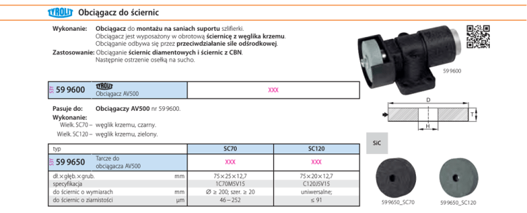Obciągacz do ściernic Wykonanie: Obciągacz do montażu na saniach suportu szlifierki. Obciągacz jest wyposażony w obrotową ściernicę z węglika krzemu. Obciąganie odbywa się przez przeciwdziałanie sile odśrodkowej. Zastosowanie: Obciąganie ściernic diamentowych i ściernic z CBN. Następnie ostrzenie osełką na sucho. 53Y 59 9600 59 9600 XXX Obciągacz AV500 D Pasuje do: Obciągaczy AV500 nr 59 9600. Wykonanie: Wielk. SC70 – węglik krzemu, czarny. Wielk. SC120 – węglik krzemu, zielony. 53Y typ 59 9650 Tarcze do obciągacza AV500 dł.×głęb.×grub. specyfikacja do ściernic o wymiarach do ściernic o ziarnistości mm mm µm T H SC70 SC120 XXX XXX 75×25×12,7 1C70M5V15 ⌀ ≥ 200; szer. ≥ 20 46 − 252 75×20×12,7 C120J5V15 uniwersalne; ≤ 91 SiC 59 9650_SC70 59 9650_SC120