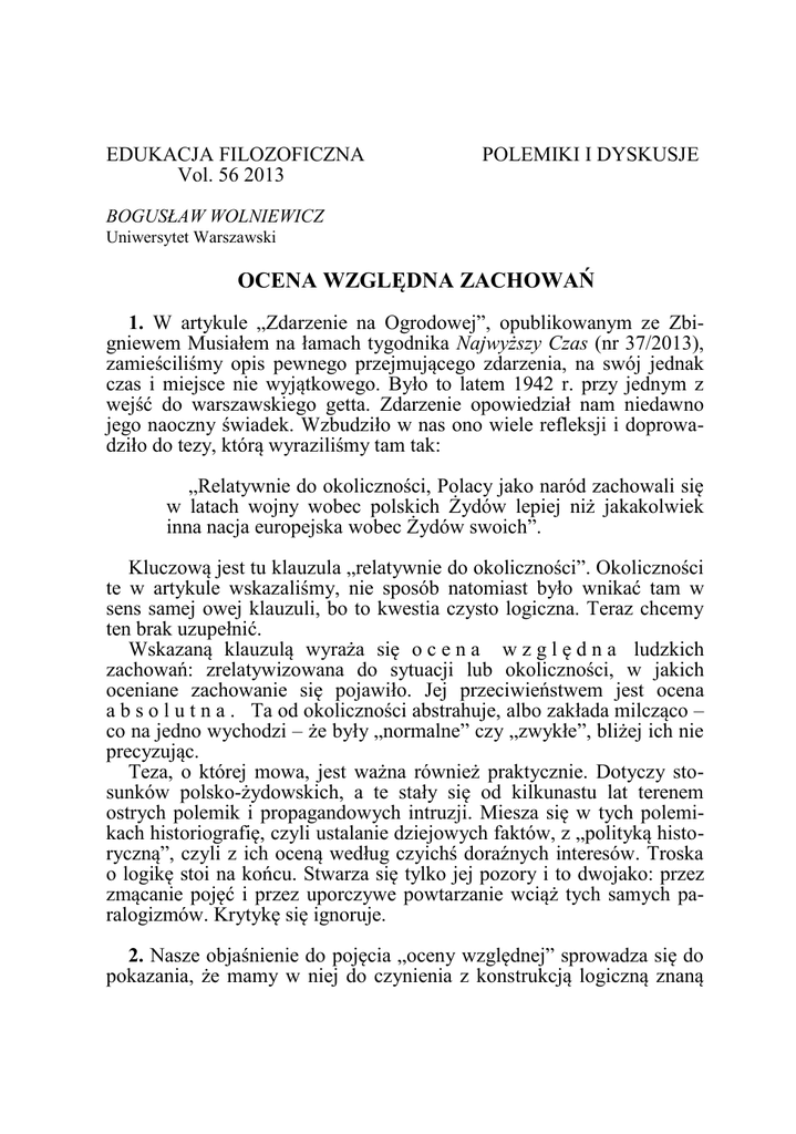 EDUKACJA FILOZOFICZNA Vol. 56 2013 POLEMIKI I DYSKUSJE BOGUSŁAW WOLNIEWICZ Uniwersytet Warszawski OCENA WZGLĘDNA ZACHOWAŃ 1. W artykule „Zdarzenie na Ogrodowej”, opublikowanym ze Zbigniewem Musiałem na łamach tygodnika Najwyższy Czas (nr 37/2013), zamieściliśmy opis pewnego przejmującego zdarzenia, na swój jednak czas i miejsce nie wyjątkowego. Było to latem 1942 r. przy jednym z wejść do warszawskiego getta. Zdarzenie opowiedział nam niedawno jego naoczny świadek. Wzbudziło w nas ono wiele refleksji i doprowadziło do tezy, którą wyraziliśmy tam tak: „Relatywnie do okoliczności, Polacy jako naród zachowali się w latach wojny wobec polskich Żydów lepiej niż jakakolwiek inna nacja europejska wobec Żydów swoich”. Kluczową jest tu klauzula „relatywnie do okoliczności”. Okoliczności te w artykule wskazaliśmy, nie sposób natomiast było wnikać tam w sens samej owej klauzuli, bo to kwestia czysto logiczna. Teraz chcemy ten brak uzupełnić. Wskazaną klauzulą wyraża się o c e n a w z g l ę d n a ludzkich zachowań: zrelatywizowana do sytuacji lub okoliczności, w jakich oceniane zachowanie się pojawiło. Jej przeciwieństwem jest ocena a b s o l u t n a . Ta od okoliczności abstrahuje, albo zakłada milcząco – co na jedno wychodzi – że były „normalne” czy „zwykłe”, bliżej ich nie precyzując. Teza, o której mowa, jest ważna również praktycznie. Dotyczy stosunków polsko-żydowskich, a te stały się od kilkunastu lat terenem ostrych polemik i propagandowych intruzji. Miesza się w tych polemikach historiografię, czyli ustalanie dziejowych faktów, z „polityką historyczną”, czyli z ich oceną według czyichś doraźnych interesów. Troska o logikę stoi na końcu. Stwarza się tylko jej pozory i to dwojako: przez zmącanie pojęć i przez uporczywe powtarzanie wciąż tych samych paralogizmów. Krytykę się ignoruje. 2. Nasze objaśnienie do pojęcia „oceny względnej” sprowadza się do pokazania, że mamy w niej do czynienia z konstrukcją logiczną znaną Bogusław Wolniewicz 94 jako „iloczyn prosty dwóch porządków częściowych”. Niech Z będzie ogółem ludzkich z a c h o w a ń fizycznie możliwych; i niech S będzie ogółem ludzkich s y t u a c j i możliwych życiowo. Przyjmujemy, że oba te zbiory – każdy z osobna – są uporządkowane częściowo pewną relacją preferencji. Mamy więc dwa porządki częściowe (Z, ≥) i (S, ≥). Znak ≥ znaczy oczywiście w obu razach coś innego. Tworzymy następnie iloczyn kartezjański obu zbiorów Z × S i przez ich porządki określamy na nim porządek nowy: dla wszelkich z Z, s S, (*) (z1, s1) ≥ (z2, s2) z1 ≥ z2 ∧ s1 ≥ s2. Mówi się wtedy, że porządek (Z × S, ≥) jest iloczynem prostym tamtych dwóch. Na koniec formalizm ten interpretujemy. Formuła z1 ≥ z2 mówi, że pierwsze zachowanie jest bardziej chwalebne (albo mniej naganne) niż drugie. Formuła s1 ≥ s2 mówi, że sytuacja pierwsza jest dla podmiotu trudniejsza życiowo niż druga. Jak zawsze w porządku częściowym, znajdą się też zachowania co do swej chwalebności (albo naganności) n i e p o r ó w n y w a l n e ; i tak samo sytuacje co do swej życiowej trudności. Piszemy wtedy z1 // z2, s1 // s2. Przewaga danej pary nad inną zachodzi, gdy przynajmniej jedna z jej składowych jest większa od odpowiedniczki (zachowanie chwalebniejsze albo sytuacja trudniejsza), a druga co najmniej równa. Inaczej pary takie są nieporównywalne: (z1, s1) // (z2, s2). Parę o postaci c = (z, s) nazwijmy c z y n e m podmiotu (albo jego „działaniem”). Formułę c1 ≥ c2 czytamy „czyn c1 należy c e n i ć bardziej (albo p o t ę p i a ć mniej) niż czyn c2. Mówiąc ściślej: należy go cenić co najmniej na równi z tamtym (albo co najwyżej na równi z nim potępiać). Niech ponadto formuła c1 = c2 wyraża jedynie r ó w n o c e n n o ś ć obu czynów, nie tożsamość; podobnie formuła z1 = z2 – równochwalebność albo równonaganność obu zachowań; a formuła s1= s2 – równotrudność obu sytuacji. Tak więc cenimy czyn c1 wyżej niż czyn c2, gdy tkwiące w nim zachowanie z1 występuje w sytuacji dla jego podmiotu co najmniej równie trudnej (s1 = s2) albo nawet trudniejszej (s1 > s2) w porównaniu z sytuacją, która towarzyszy zachowaniu z2 tkwiącemu w czynie c2. W przeciwnym razie są one pod oceną nieporównywalne: c1 // c2. W ocenie trzeba zawsze mieć na uwadze obie składowe czynu. Tym kończą się nasze objaśnienia do pojęcia oceny względnej. Dodajmy parę słów komentarza. Ocena względna zachowań 95 3. Ocena czynu, która pomija w nim składową sytuacyjną, jest oceną nierzetelną. W propagandzie dzieje się tak często: porównuje się zachowania dwóch podmiotów, pomijając ich nierówne sytuacje. Klasyczny przykład stanowią oceny zachowań polskich i duńskich w latach wojny. Mówi się: „patrzcie, Duńczycy większość swoich Żydów ocalili, a Polacy swoich nie”. Zestawia się tutaj zachowania dwóch podmiotów zbiorowych i feruje na tej podstawie ich ocenę: zd > zp,, zatem cd> cp. Inaczej mówiąc, Duńczycy postąpili szlachetnie, Polacy postąpili nikczemnie. A w zatartym tle pozostaje nieme założenie, że postąpili tak w podobnej sytuacji: sp = sd. Otóż nie, już pierwsza przesłanka – „Duńczycy ocalili” – jest mylna. W rzeczywistości ocalili nie oni, tylko niemiecki wielkorządca Danii SS-Gruppenführer Werner Best. Duńczycy byli jedynie narzędziem zakulisowej gry politycznej wyższych kół SS, jaką te prowadziły wtedy – jesień 1943! – w obliczu wyraźnie się już rysującej klęski III Rzeszy. Ruchem w tej grze była aranżacja „ucieczki” duńskich Żydów do Szwecji; faktycznie ich tam wypuszczono. (Omawialiśmy już tę sprawę szczegółowo na łamach Najwyższego Czasu, nr 46/2012.) Przyjmijmy jednak contra factum, że przesłanka pierwsza jest prawdziwa. Błędna jest przede wszystki