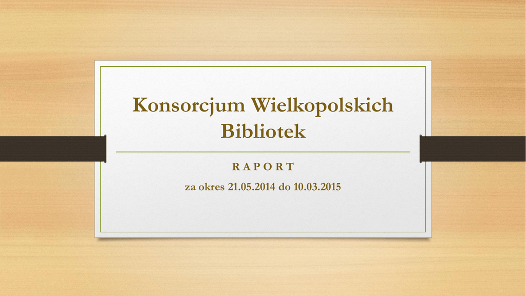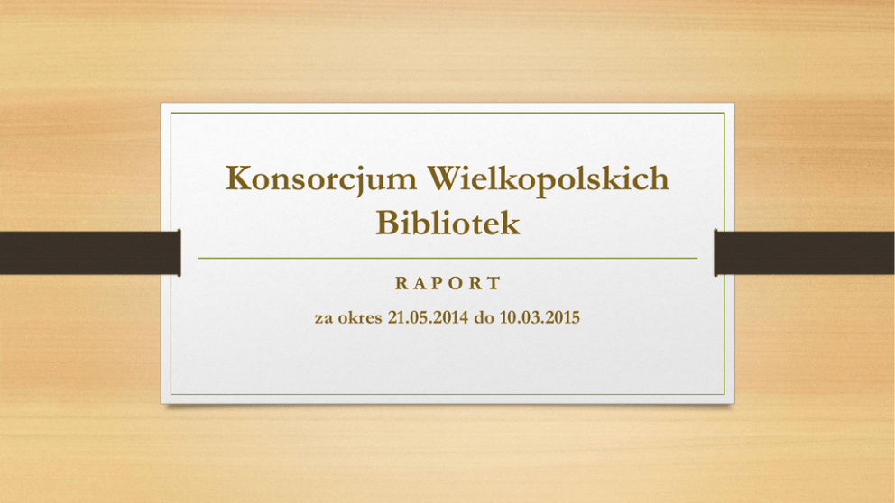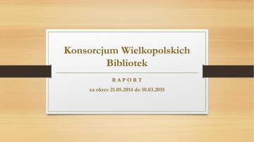 Konsorcjum Wielkopolskich Bibliotek RAPORT za okres 21.05.2014 do 10.03.2015 Konsorcjum Wielkopolskich Bibliotek • 15 bibliotek z Gniezna, Jarocina, Kalisza, Krotoszyna, Leszna, Lwówka, Nowego Tomyśla, Obornik, Opalenicy, Ostrowa Wielkopolskiego, Piły, Pleszewa Poznania, Wolsztyna i Zdun ; z tego 12 bibliotek powiatowych i 2 biblioteki miejsko-gminne i wojewódzka • • • • 486 tytułów książek x 5 jednoczesnych dostępów do danego tytułu 22.500 PLN netto +23% VAT Zdalne kody dostępu online w wysokości 100 000 http://www.wbp.poznan.pl/udostepnianie/ksiazki-cyfrowe-i-linki/platforma-ibuklibra-juz-dziala/ Platforma PWN IBUK Libra www.ibuk.info.pl Liczba sesji w serwisie 2766 Platforma PWN IBUK Libra www.ibuk.info.pl • Logowanie do konta my IBUK 457 Platforma PWN IBUK Libra www.ibuk.info.pl • Aktywność adresów IP wyrażona poprzez: 1. liczbę pobranych książek 4657 2. liczbę otwartych stron 108.383 Platforma PWN IBUK Libra www.ibuk.info.pl • Ranking przeglądanych książek i czasopism: 1. liczba otwarć książek i czasopism 5870 2. liczba otwartych stron 113. 077 3. czas czytania 556 godzin 34 minuty Platforma PWN IBUK Libra www.ibuk.info.pl • Wyszukiwanie tytułów według kategorii 1368 : 1. 2. 3. 4. 5. 6. 7. 8. Literatura piękna 104 Czasopisma naukowe 88 Literatura kobieca 58 Literatura faktu 46 Literatura dla dzieci i młodzieży 38 Literatura popularno-naukowa 31 Kryminał, informatyka 22 Literatura naukowa 16 Platforma PWN IBUK Libra www.ibuk.info.pl • Zgłoszenie propozycji zakupu przez czytelnika serwisu 259 pozycji Konsorcjum Wielkopolskich Bibliotek • Umowa z wydawnictwem PWN kończy się 20 maja 2015 roku i co dalej? Dziękuję za uwagę Krystyna Dąbrowska Koordynator