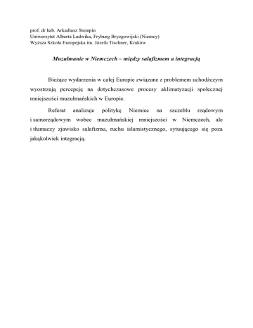prof. dr hab. Arkadiusz Stempin Uniwersytet Alberta Ludwika, Fryburg Bryzgowijski (Niemcy) Wyższa Szkoła Europejska im. Józefa Tischner, Kraków Muzułmanie w Niemczech – między salafizmem a integracją Bieżące wydarzenia w całej Europie związane z problemem uchodźczym wyostrzają percepcję na dotychczasowe procesy aklimatyzacji społecznej mniejszości muzułmańskich w Europie. Referat analizuje politykę Niemiec na szczeblu rządowym i samorządowym wobec muzułmańskiej mniejszości w Niemczech, ale i tłumaczy zjawisko salafizmu, ruchu islamistycznego, sytuującego się poza jakąkolwiek integracją.