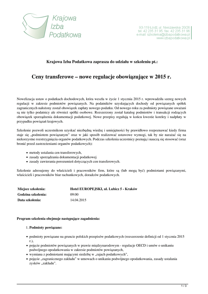Krajowa Izba Podatkowa zaprasza do udziału w szkoleniu pt.: Ceny transferowe – nowe regulacje obowiązujące w 2015 r. Nowelizacja ustaw o podatkach dochodowych, która weszła w życie 1 stycznia 2015 r. wprowadziła szereg nowych regulacji w zakresie podmiotów powiązanych. Na podatników uzyskujących dochody od powiązanych spółek zagranicznych nałożony został obowiązek zapłaty nowego podatku. Od nowego roku za podmioty powiązane uważani są nie tylko podatnicy ale również spółki osobowe. Rozszerzony został katalog podmiotów i transakcji rodzących obowiązek sporządzenia dokumentacji podatkowej. Nowe przepisy regulują w końcu kwestie korekty i nadpłaty w przypadku powiązań krajowych. Szkolenie pozwoli uczestnikom uzyskać niezbędną wiedzę i umiejętności by prawidłowo rozpoznawać kiedy firma staje się „podmiotem powiązanym” oraz w jaki sposób realizować ustawowe wymogi, tak by nie narażać się na niekorzystne rozstrzygnięcia organów podatkowych. Podczas szkolenia uczestnicy poznają i nauczą się stosować (oraz bronić przed zastrzeżeniami organów podatkowych): metody ustalania cen transferowych, zasady sporządzania dokumentacji podatkowej zasady zawierania porozumień dotyczących cen transferowych. Szkolenie adresujemy do właścicieli i pracowników firm, które są (lub mogą być) podmiotami powiązanymi, właścicieli i pracowników biur rachunkowych, doradców podatkowych. Miejsce szkolenia: Hotel EUROPEJSKI, ul. Lubicz 5 - Kraków Godzina szkolenia: 09:00 Data szkolenia: 14.04.2015 Program szkolenia obejmuje następujące zagadnienia: 1. Podmioty powiązane: podmioty powiązane na gruncie polskich przepisów podatkowych (rozszerzenie definicji od 1 stycznia 2015 r.), pojęcie podmiotów powiązanych w prawie międzynarodowym - regulacje OECD i umów o unikaniu podwójnego opodatkowania w zakresie podmiotów powiązanych, wymiana z podmiotami mającymi siedzibę w „rajach podatkowych”, pojęcie „zagranicznego zakładu” w umowach o unikaniu podwójnego opodatkowania, zasady ustalania zysków „zakładu”. 1/3 2. Opodatkowanie zysków zagranicznej spółki kontrolowanej (CFC) – regulacje obowiązujące od 1.1.2015 r. 3. Metody szacowania cen transferowych: metoda porównywalnej ceny niekontrolowanej, metoda ceny odsprzedaży, metoda rozsądnej marży (koszt plus), metody zysku transakcyjnego, szczególne zasady dotyczące ustalania wartości rynkowej dóbr niematerialnych i usług, uprawnienia organów podatkowych w zakresie szacowania cen. 4. Zawieranie porozumień w sprawach ustalania cen transakcyjnych: rodzaje porozumień, dokumenty załączane do wniosku, postępowanie w sprawie porozumienia, decyzja w sprawie porozumienia. 5. Obowiązujące od 18 lipca 2013 r. regulacje rozporządzeń w sprawie cen transferowych: obowiązek dokonywania analizy porównywalności transakcji przez organy podatkowe, ustalanie cen i dokumentowanie „usług o niskiej wartości dodanej”, ocena warunków restrukturyzacji przedsiębiorstw. 6. Dokumentacja podatkowa w zakresie cen transferowych podmioty zobowiązane do sporządzenia dokumentacji – zmiany wchodzące w życie 1 stycznia 2015 r., funkcje jakie spełniać będą podmioty uczestniczące w transakcji, koszty związane z transakcją, metody i sposób kalkulacji ceny i zysków, strategia gospodarcza, inne czynniki majace wpływ na transakcję, oczekiwane korzysci w zakreie usług niematerialnych, załączniki do dokumentacji. 7. Dokumentacja podatkowa dla wybranych rodzajów transakcji dostawa towarów, świadczenie usług niematerialnych, świadczenie usług finansowych – pożyczki, zawarcie umowy spółki osobowej – regulacja wchodzące w życie 1 stycznia 2015 r. 8. Sankcje wynikające z niedopełnienia obowiązków w zakresie dokumentacji podatkowej: nieuznanie części kosztów, 50% podatek dochodowy, sankcje związane z korektą podatku VAT, odpowiedzialność karna skarbowa. 2/3 Cena szkolenia obejmuje: zajęcia dydaktyczne, materiały szkoleniowe przygotowane przez eksperta, dyplom ukończenia szkolenia, lunch, serwis kawowy. Rezerwacja wg kolejności zgłoszeń. Ilość miejsc ograniczona. W celu zgłoszenia udziału w szkoleniu należy wypełnić formularz zgłoszeniowy i przesłać go faksem na numer: (042) 235-31-96. Po otrzymaniu zgłoszenia odeślemy Państwu potwierdzenie przyjęcia rezerwacji. Dodatkowe informacje można uzyskać pod numerem (042) 235-31-95. Serdecznie zapraszamy. Rozpoczęcie szkolenia: 14.04.2015 09:00 Ilość godzin: 5 Miejsce szkolenia: Hotel EUROPEJSKI, ul. Lubicz 5 - Kraków Cena regularna uczestnictwa jednej osoby netto: 490,00 zł Cena regularna uczestnictwa jednej osoby brutto: 602,70 zł Rezerwacja wg kolejności zgłoszeń. Ilość miejsc ograniczona. W celu zgłoszenia udziału w szkoleniu należy wypełnić formularz zgłoszeniowy i przesłać go faksem na numer: (42) 235 31 96 Po otrzymaniu zgłoszenia odeślemy Państwu potwierdzenie przyjęcia rezerwacji. Dodatkowe informacje można uzyskać pod numerem (42) 235 31 95. Serdecznie zapraszamy. 3/3 Powered by TCPDF (www.tcpdf.org)