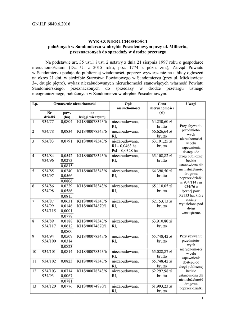 GN.II.P.6840.6.2016 WYKAZ NIERUCHOMOŚCI położonych w Sandomierzu w obrębie Poscaleniowym przy ul. Milberta, przeznaczonych do sprzedaży w drodze przetargu Na podstawie art. 35 ust.1 i ust. 2 ustawy z dnia 21 sierpnia 1997 roku o gospodarce nieruchomościami (Dz. U. z 2015 roku, poz. 1774 z późn. zm.), Zarząd Powiatu w Sandomierzu podaje do publicznej wiadomości, poprzez wywieszenie na tablicy ogłoszeń na okres 21 dni, w siedzibie Starostwa Powiatowego w Sandomierzu (przy ul. Mickiewicza 34, drugie piętro), wykaz niezabudowanych nieruchomości stanowiących własność Powiatu Sandomierskiego, przeznaczonych do sprzedaży w drodze przetargu ustnego nieograniczonego, położonych w Sandomierzu w obrębie Poscaleniowym. Lp. Oznaczenie nieruchomości Nr działki pow. (ha) nr księgi wieczystej Opis nieruchomości Cena nieruchomości (zł) niezabudowana, RI, niezabudowana, RI, niezabudowana, RI – 0,0463 ha PsI – 0,0328 ha niezabudowana, RI, 64.230,60 zł brutto 66.626,64 zł brutto 63.191,25 zł brutto KI1S/00078343/6 niezabudowana, RI, 64.390,50 zł brutto KI1S/00078343/6 niezabudowana, RI, 65.110,05 zł brutto KI1S/00078343/6 KI1S/00074870/1 niezabudowana, RI, 62.153,13 zł brutto KI1S/00078343/6 KI1S/00074870/1 niezabudowana, RI, 63.910,80 zł brutto KI1S/00078343/6 niezabudowana, RI, 65.748,42 zł brutto KI1S/00078343/6 niezabudowana, RI, niezabudowana, RI, niezabudowana, RI, 65.028,87 zł brutto 65.748,42 zł brutto 62.292,98 zł brutto niezabudowana, RI, 61.993,23 zł brutto 1 934/77 0,0804 KI1S/00078343/6 2 934/78 0,0834 KI1S/00078343/6 3 934/83 0,0791 KI1S/00078343/6 4 934/84 934/96 KI1S/00078343/6 5 934/85 934/97 6 934/86 934/98 7 934/87 934/99 934/115 8 934/89 934/117 9 934/94 934/100 10 934/101 0,0542 0,0273 0,0815 0,0240 0,0566 0,0806 0,0229 0,0586 0,0815 0,0631 0,0146 0,0001 0,0778 0,0188 0,0612 0,0800 0,0509 0,0314 0,0823 0,0814 11 934/102 0,0823 KI1S/00078343/6 12 934/103 934/93 KI1S/00078343/6 13 934/120 0,0714 0,0067 0,0781 0,0776 KI1S/00074870/1 65.108,82 zł brutto Uwagi Przy zbywaniu przedmiotowych nieruchomości w celu zapewnienia dostępu do drogi publicznej będzie ustanowiona dla nich służebność drogowa poprzez działki nr 934/114 i nr 934/76 o łącznej pow. 0,2333 ha, które zostały wydzielone pod drogi wewnętrzne. Przy zbywaniu przedmiotowych nieruchomości w celu zapewnienia dostępu do drogi publicznej będzie ustanowiona dla nich służebność drogowa poprzez działki 1 14 934/109 0,0805 KI1S/00078343/6 15 934/110 0,0784 KI1S/00078343/6 16 934/111 0,0869 KI1S/00078343/6 17 934/112 934/123 KI1S/00078343/6 KI1S/00074870/1 18 934/124 0,0939 0,0202 0,1141 0,1110 19 934/125 934/113 0,1046 0,0045 0,1091 KI1S/00074870/1 KI1S/00078343/6 KI1S/00074870/1 niezabudowana, RI, niezabudowana, RI, niezabudowana, RI, niezabudowana, RI, 64.310,55 zł brutto 62.632,83 zł brutto 69.423,66 zł brutto 91.152,84 zł brutto niezabudowana, RI, niezabudowana, RI, 88.676,85 zł brutto 87.159,03 zł brutto nr 934/122 i nr 934/105 i nr 934/95 o łącznej pow. 0,2202 ha, które zostały wydzielone pod drogi wewnętrzne. Teren, na którym usytuowane są w/w działki, nie posiada obowiązującego miejscowego planu zagospodarowania przestrzennego. Zgodnie z decyzją o warunkach zabudowy znak: UA.6730.51.2015 z dnia 24 czerwca 2015 r. wydaną przez Burmistrza Miasta Sandomierza, teren przeznaczony jest pod zabudowę mieszkaniową jednorodzinną: „funkcja mieszkaniowa 28 domów mieszkalnych jednorodzinnych wolnostojących z garażami, ze zjazdami indywidualnymi na każda działkę. Infrastruktura techniczna związana z budynkami zapewniająca użytkowanie zgodne z przeznaczeniem, jak zjazdy z drogi gminnej nr ewid. dz. 934/69 oraz poprzez komunikację wewnętrzną położoną na wydzielonych działkach pod dojazdy, sieci i urządzenia instalacyjne, dojazdy, dojścia, ogrodzenia, śmietniki, zieleń ozdobna.” Zgodnie z obowiązującym Studium uwarunkowań i kierunków zagospodarowania przestrzennego miasta Sandomierza, uchwalonym uchwałą Nr XL/344/2009 Rady Miasta Sandomierza z dnia 28.10.2009 r. zmienionym uchwałą Rady Miasta Sandomierza Nr XLI/419/2014 z dnia 25.06.2014 r. obszar, na którym położone są w/w nieruchomości określony jest symbolem 13 MN – kierunki zagospodarowania – wprowadzenie i uzupełnienie zabudowy jednorodzinnej ekstensywnej, proponowane uzbrojenie terenu w sieć kanalizacji sanitarnej, wprowadzenie obsługi komunikacyjnej, rozbudowa, przebudowa i remont w rozumieniu przepisów budowlanych, funkcja dominująca – mieszkalnictwo jednorodzinne, funkcja uzupełniająca – usługi nieuciążliwe. Przez nieruchomość oznaczoną w ewidencji gruntów działką nr 934/83 wzdłuż granicy z ul. Schinzla biegnie linia wodociągowa ø 100, część nieruchomości nr 934/117 przy granicy z działką nr 934/118 i 934/120 zajęta jest przez podziemną linię kablową wysokiego napięcia, przy granicy działki 934/120 z działką 934/119 biegnie podziemna linia kablowa wysokiego napięcia, część nieruchomości nr 934/124 wzdłuż południowej i zachodniej granicy zajęta jest przez podziemną linię kablową wysokiego napięcia, przez północnozachodni róg działki nr 934/125, a także wzdłuż jej południowej granicy z ul. Milberta biegnie podziemna linia kablowa wysokiego napięcia, która umiejscowiona jest również wzdłuż południowej granicy działek 934/112, 934/111, 934/110 i 934/109. Osoby, którym przysługuje pierwszeństwo w nabyciu nieruchomości na podstawie art. 34 ust.1 pkt 1 i pkt 2 ustawy o gospodarce nieruchomościami, mogą składać wnioski o nabycie nieruchomości do tut. Starostwa, w terminie 6 tygodni, licząc od dnia wywieszenia wykazu. 2
