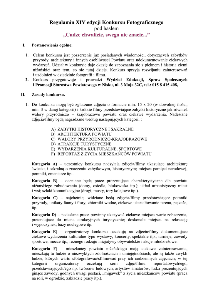 Regulamin XIV edycji Konkursu Fotograficznego pod hasłem „Cudze chwalicie, swego nie znacie...” I. Postanowienia ogólne: 1. 2. II. Celem konkursu jest poszerzenie już posiadanych wiadomości, dotyczących zabytków przyrody, architektury i innych osobliwości Powiatu oraz udokumentowanie ciekawych wydarzeń. Udział w konkursie daje okazję do zapoznania się z pięknem i historią ziemi niżańskiej oraz tym, co się tutaj dzieje. Konkurs sprzyja rozwijaniu zainteresowań i uzdolnień w dziedzinie fotografii i filmu. Konkurs przygotowuje i prowadzi Wydział Edukacji, Spraw Społecznych i Promocji Starostwa Powiatowego w Nisku, ul. 3 Maja 32C, tel.: 015 8 415 408, Zasady konkursu. 1. Do konkursu mogą być zgłaszane zdjęcia o formacie min. 15 x 20 (w dowolnej ilości, min. 3 w danej kategorii) i krótkie filmy przedstawiające zabytki historyczne jak również walory przyrodniczo – krajobrazowe powiatu oraz ciekawe wydarzenia. Nadesłane zdjęcia/filmy będą nagradzane według następujących kategorii : A) B) C) D) E) F) ZABYTKI HISTORYCZNE I SAKRALNE ARCHITEKTURA POWIATU WALORY PRZYRODNICZO-KRAJOBRAZOWE ATRAKCJE TURYSTYCZNE WYDARZENIA KULTURALNE, SPORTOWE REPORTAŻ Z ŻYCIA MIESZKAŃCÓW POWIATU Kategoria A) – uczestnicy konkursu nadsyłają zdjęcia/filmy ukazujące architekturę świecką i sakralną o znaczeniu zabytkowym, historycznym; miejsca pamięci narodowej, pomniki, cmentarze itp.. Kategoria B) – oceniane będą prace prezentujące charakterystyczne dla powiatu niżańskiego zabudowania (domy, osiedla, blokowiska itp.); układ urbanistyczny miast i wsi; szlaki komunikacyjne (drogi, mosty, tory kolejowe itp.). Kategoria C) – najchętniej widziane będą zdjęcia/filmy przedstawiające pomniki przyrody, unikaty fauny i flory, zbiorniki wodne, ciekawe ukształtowanie terenu, pejzaże, itp. Kategoria D) – nadesłane prace powinny ukazywać ciekawe miejsca warte zobaczenia, pretendujące do miana atrakcyjnych turystycznie; doskonałe miejsca na rekreację i wypoczynek; bazy noclegowe itp. Kategoria E) – organizatorzy konkursu oczekują na zdjęcia/filmy dokumentujące ciekawe wydarzenia kulturalne typu wystawy, koncerty, spektakle itp., turnieje, zawody sportowe, mecze itp.; różnego rodzaju inicjatywy obywatelskie i akcje młodzieżowe. Kategoria F) – mieszkańcy powiatu niżańskiego mają ciekawe zainteresowania, mieszkają tu ludzie o niezwykłych zdolnościach i umiejętnościach, ale są także zwykli ludzie, których warto sfotografować/sfilmować przy ich codziennych zajęciach; w tej kategorii organizatorzy oczekują serii zdjęć/filmu reportażowych/ego, przedstawiających/ego np. twórców ludowych, artystów amatorów, ludzi prezentujących ginące zawody, godnych uwagi postaci, „migawek” z życia mieszkańców powiatu (praca na roli, w ogrodzie, zakładzie pracy itp.). Każdy uczestnik sam wybiera kategorię konkursową, w ramach której chce ubiegać się o nagrodę. 1. Każde zdjęcie/film powinno zawierać opis związany z prezentacją na zdjęciu oraz informację dotyczącą wydarzenia, miejsca, osoby, historii danego obiektu itp. 2. Uczestnikiem konkursu może być każdy, kto nadeśle minimum 3 zdjęcia (w danej kategorii) lub film max 10 min (na płycie DVD) dotyczące/cy Powiatu Niżańskiego. 3. W konkursie mogą brać udział jedynie te prace, które nie zdobyły głównej nagrody w żadnym konkursie. 4. Osoby wykonujące zdjęcia aparatem cyfrowym proszone są o dołączenie do zdjęć płyty CD-ROM zawierającej prezentowane zdjęcia, a w przypadku zdjęć robionych aparatem analogowym – kliszę. 5. Zgłoszenie do konkursu jest jednoznaczne z przyjęciem warunków niniejszego regulaminu i oświadczeniem, że fotografie/film złożone na konkurs zostały wykonane osobiście. 6. Udział w konkursie jest jednoznaczny z nieodpłatnym udzieleniem prawa na wykorzystanie zdjęć/filmu (umowa o przeniesienie praw autorskich). 7. Osoby niepełnoletnie dołączają pisemną zgodę rodziców lub opiekunów na udział w konkursie (umowę o przeniesienie praw autorskich podpisują rodzice lub opiekunowie wraz z osobą niepełnoletnią). 8. Prace należy przesłać w terminie do 30 września 2013 roku (data stempla pocztowego) lub doręczyć osobiście do Starostwa Powiatowego w Nisku – Wydział Edukacji, Spraw Społecznych i Promocji, ul. 3 Maja 32C, pok. nr 17, tel. 015 8 415 408. 9. Do koperty zawierającej zdjęcia/film wraz z opisem, godłem (znakiem) Twórcy oraz wybraną przez siebie kategorią konkursową, należy dołączyć drugą zamkniętą kopertę opatrzoną tym samym godłem, zawierającą dane osobowe (imię, nazwisko, adres, wiek, tel. kontaktowy). III. Rozstrzygnięcie konkursu 1. Rozstrzygnięcie konkursu nastąpi w drugiej połowie października 2013 r. 2. Nadesłane przez uczestników konkursu zdjęcia/filmy stają się własnością Starostwa Powiatowego w Nisku i będą prezentowane na wystawie pokonkursowej. 3. Najlepsze prace zostaną nagrodzone. Nagrody przyznawane będą po jednej w każdej kategorii. Jeżeli nadesłane prace nie będą spełniać wymagań konkursowych i oczekiwań Komisji Konkursowej na tyle, by pretendować do nagrody głównej, wówczas Komisja przyzna wyróżnienie lub jedynie uhonoruje uczestnika konkursu dyplomem z podziękowaniem za udział w konkursie. Organizator zastrzega sobie prawo do nie nagradzania nadesłanych prac w ramach wybranej kategorii, jeśli te nie spełnią wymagań zapisanych w regulaminie konkursu. 4. Przy ocenie zdjęć będą brane pod uwagę: 5. artyzm ujęć fotografowanego/filmowanego obiektu odkrywczość (nieznane dotychczas lub nie prezentowane miejsca i obiekty) dobra jakość techniczna ciekawy opis (może być nawet kilka stron) zdjęcia/filmy muszą przedstawiać miejsca, wydarzenia i osoby charakterystyczne dla powiatu Prace konkursowe oceniać będzie powołana w tym celu Komisja Konkursowa.