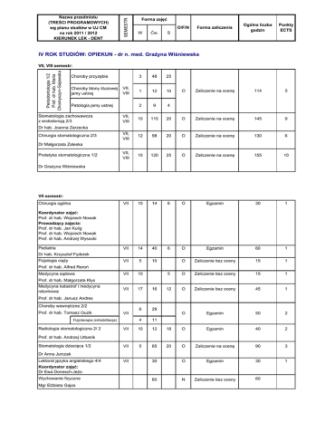 SEMESTR Nazwa przedmiotu (TREŚCI PROGRAMOWYCH) wg planu studiów w UJ CM na rok 2011 / 2012 KIERUNEK LEK - DENT Forma zajęć O/F/N W Ćw. Forma zaliczenia S Ogólna liczba godzin Punkty ECTS IV ROK STUDIÓW: OPIEKUN - dr n. med. Grażyna Wiśniewska Periodontologia 1/2 Prof. dr hab. Maria Chomyszyn-Gajewska VII, VIII semestr: Choroby przyzębia Choroby błony śluzowej jamy ustnej 3 48 25 1 12 10 2 9 4 VII, VIII 10 115 VII, VIII 12 VII, VIII VII, VIII O Zaliczenie na ocenę 114 5 20 O Zaliczenie na ocenę 145 9 98 20 O Zaliczenie na ocenę 130 6 10 120 25 O Zaliczenie na ocenę 155 10 VII 10 14 6 O Egzamin 30 1 VII 14 40 6 O Egzamin 60 1 VII 5 10 O Zaliczenie bez oceny 15 1 VII 10 5 O Zaliczenie bez oceny 15 1 VII 17 16 12 O Zaliczenie bez oceny 45 1 6 29 O Egzamin 50 2 4 11 VII 10 12 18 O Egzamin 40 2 VII 5 65 20 O Zaliczenie na ocenę 90 3 30 O Egzamin 30 1 60 N Zaliczenie bez oceny 60 Patologia jamy ustnej Stomatologia zachowawcza z endodoncją 2/3 Dr hab. Joanna Zarzecka Chirurgia stomatologiczna 2/3 Dr Małgorzata Zaleska Protetyka stomatologiczna 1/2 Dr Grażyna Wiśniewska VII semestr: Chirurgia ogólna Koordynator zajęć: Prof. dr hab. Wojciech Nowak Prowadzący zajęcia: Prof. dr hab. Jan Kulig Prof. dr hab. Wojciech Nowak Prof. dr hab. Andrzej Wysocki Pediatria Dr hab. Krzysztof Fyderek Fizjologia ciąży Prof. dr hab. Alfred Reroń Medycyna sądowa Prof. dr hab. Małgorzata Kłys Medycyna katastrof i medycyna ratunkowa Prof. dr hab. Janusz Andres Choroby wewnętrzne 2/2 Prof. dr hab. Tomasz Guzik VII Fizjoterapia (rehabilitacja) Radiologia stomatologiczna 2/ 2 Prof. dr hab. Andrzej Urbanik Stomatologia dziecięca 1/2 Dr Anna Jurczak Lektorat języka angielskiego 4/4 Koordynator zajęć: Dr Ewa Donesch-Jeżo Wychowanie fizyczne Mgr Elżbieta Gajos VII VIII semestr: Choroby zakaźne VIII 10 10 10 O Egzamin 30 1 25 O Egzamin 80 2 16 O Zaliczenie na ocenę 60 4 O Egzamin 30 1 6 O Zaliczenie na ocenę 30 1 30 O Zaliczenie na ocenę 30 2 160 6 1399 60 Choroby narządów zmysłów Dr hab. Aleksander Garlicki Okulistyka Otorynolaryngologia 5 VIII Neurologia 10 25 5 10 VIII 4 40 VIII 10 20 VIII 12 12 Koordynator zajęć: Prof. dr hab. Jacek Składzień Prowadzący zajęcia: Prof. dr hab. Jacek Składzień Prof. dr hab. Andrzej Szczudlik Prof. dr hab. Bożena RomanowskaDixon Ortodoncja 2/3 Dr hab. Bartłomiej W. Loster Dermatologia z wenerologią Prof. dr hab. Anna Wojas-Pelc Biochemia jamy ustnej Prof. dr hab. Piotr Laidler Koordynator zajęć: Prof. dr hab. Maria Wróbel Zajęcia fakultatywne (do wyboru): Środowiskowe i żywieniowe uwarunkowania zdrowia Prof. dr hab. Emilia Kolarzyk Metodologia badań naukowych w medycynie Dr Aleksander Gałaś Dr Agnieszka Pac E-learning Prof. dr hab. Irena Roterman-Konieczna Problemy graniczne: samobójstwo, samobójstwo wspomagane, eutanazja Dr Barbara Maroszyńska-Jeżowska Rodzaj i częstośc występowania zmian chorobowych na blonie śluzowej jamy ustnej u pacjentów w podeszłym wieku Prof. dr hab. Maria Chomyszyn-Gajewska Przeszczepienie komórek macierzystych z zastosowaniem w medycynie regeneracyjnej Prof. dr hab. Marcin Majka Praktyka wakacyjna: Praktyka kliniczna - procedury kliniczne 160 O RAZEM: Sekwencyjność przedmiotów - warunki dopuszczenia do egzaminu, zaliczenia lub zajęć roku V: Przedmiot z V roku Warunkiem dopuszczenia do egzaminu lub zaliczenia jest pozytywny wynik egzaminu z: Stomatologia zachowawcza z endodoncją 3/3 Stomatologia zachowawcza z endodoncją 2/3 Stomatologia dziecięca 2/2 Stomatologia dziecięca 1/2 Chirurgia stomatologiczna 3/3 Chirurgia stomatologiczna 2/3 Chirurgia szczękowo - twarzowa Chirurgia stomatologiczna 2/3, choroby narządów zmysłów, chirurgia ogólna, choroby wewnętrzne 2/2 Periodontologia 2/2 Periodontologia 1/2 Protetyka stomatologiczna 2/2 Protetyka stomatologiczna 1/2 Ortodoncja 3/3 Ortodoncja 2/3