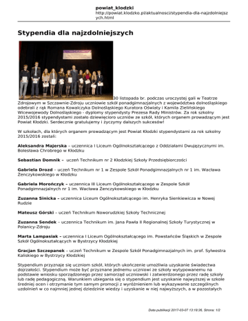 powiat_klodzki http://powiat.klodzko.pl/aktualnosci/stypendia-dla-najzdolniejsz ych.html Stypendia dla najzdolniejszych 30 listopada br. podczas uroczystej gali w Teatrze Zdrojowym w Szczawnie-Zdroju uczniowie szkół ponadgimnazjalnych z województwa dolnośląskiego odebrali z rąk Romana Kowalczyka Dolnośląskiego Kuratora Oświaty i Kamila Zielińskiego Wicewojewody Dolnośląskiego - dyplomy stypendysty Prezesa Rady Ministrów. Za rok szkolny 2015/2016 stypendystami zostało dziewięcioro uczniów ze szkół, których organem prowadzącym jest Powiat Kłodzki. Serdecznie gratulujemy i życzymy dalszych sukcesów! W szkołach, dla których organem prowadzącym jest Powiat Kłodzki stypendystami za rok szkolny 2015/2016 zostali: Aleksandra Majerska – uczennica I Liceum Ogólnokształcącego z Oddziałami Dwujęzycznymi im. Bolesława Chrobrego w Kłodzku Sebastian Domnik – uczeń Technikum nr 2 Kłodzkiej Szkoły Przedsiębiorczości Gabriela Drozd – uczeń Technikum nr 1 w Zespole Szkół Ponadgimnazjalnych nr 1 im. Wacława Żenczykowskiego w Kłodzku Gabriela Morończyk – uczennica III Liceum Ogólnokształcącego w Zespole Szkół Ponadgimnazjalnych nr 1 im. Wacława Żenczykowskiego w Kłodzku Zuzanna Sinicka – uczennica Liceum Ogólnokształcącego im. Henryka Sienkiewicza w Nowej Rudzie Mateusz Górski – uczeń Technikum Noworudzkiej Szkoły Technicznej Zuzanna Sendek – uczennica Technikum im. Jana Pawła II Regionalnej Szkoły Turystycznej w Polanicy-Zdroju Marta Lampasiak – uczennica I Liceum Ogólnokształcącego im. Powstańców Śląskich w Zespole Szkół Ogólnokształcących w Bystrzycy Kłodzkiej Gracjan Szczepanek – uczeń Technikum w Zespole Szkół Ponadgimnazjalnych im. prof. Sylwestra Kaliskiego w Bystrzycy Kłodzkiej Stypendium przyznaje się uczniom szkół, których ukończenie umożliwia uzyskanie świadectwa dojrzałości. Stypendium może być przyznane jednemu uczniowi ze szkoły wytypowanemu na podstawie wniosku sporządzonego przez samorząd uczniowski i zatwierdzonego przez radę szkoły lub radę pedagogiczną. Warunkiem ubiegania się o stypendium jest uzyskanie najwyższej w szkole średniej ocen i otrzymanie tym samym promocji z wyróżnieniem lub wykazywanie szczególnych uzdolnień w co najmniej jednej dziedzinie wiedzy i uzyskanie w niej najwyższych, a w pozostałych Data publikacji 2017-03-07 13:18:36, Strona: 1/2 powiat_klodzki http://powiat.klodzko.pl/aktualnosci/stypendia-dla-najzdolniejsz ych.html dziedzinach co najmniej dobrych wyników. Złożony przez dyrektora szkoły do kuratora oświaty wniosek, po sporządzeniu listy zbiorczej, jest przedstawiany za pośrednictwem ministra właściwego do spraw oświaty i wychowania – Prezesowi Rady Ministrów w terminie do 31 lipca poprzedzającego rok szkolny, w którym ma być przyznane stypendium. Stypendium przyznane przez Prezesa Rady Ministrów w oparciu o art. 90 h ustawy z dnia 7 września o systemie oświaty (Dz. U. z 2004 r. Nr 256, poz.2572, z późniejszymi zmianami) oraz Rozporządzenie Rady Ministrów z dnia 14 czerwca 2005 r. w sprawie stypendiów Prezesa Rady Ministrów, ministra właściwego do spraw oświaty i wychowania oraz ministra właściwego do spraw kultury i ochrony dziedzictwa narodowego ( Dz. U. z 2005 r., nr 108, poz. 905) wynosi 2 580 złotych i wypłacane jest w dwóch ratach przez wojewodę. Data publikacji 2017-03-07 13:18:36, Strona: 2/2