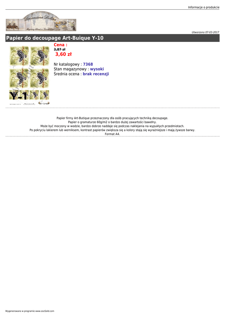 Informacje o produkcie Utworzono 07-03-2017 Papier do decoupage Art-Buique Y-10 Cena : 3,87 zł 3,60 zł Nr katalogowy : 7368 Stan magazynowy : wysoki Średnia ocena : brak recenzji Papier firmy Art-Butique przeznaczony dla osób pracujących techniką decoupage. Papier o gramaturze 60g/m2 o bardzo dużej zawartości bawełny. Może być moczony w wodzie, bardzo dobrze naddaje się podczas naklejania na wypukłych przedmiotach. Po pokryciu lakierem lub werniksem, kontrast papierów zwiększa się a kolory stają się wyrażniejsze i mają żywsze barwy. Format A4. Wygenerowano w programie www.oscGold.com