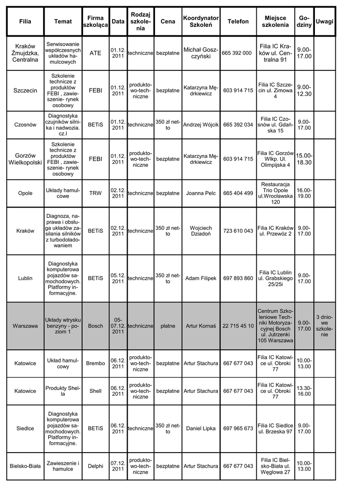 Rodzaj Firma Data szkoleszkoląca nia Telefon Miejsce szkolenia GoUwagi dziny Temat Kraków Żmujdzka, Centralna Serwisowanie współczesnych układów hamulcowych ATE Szczecin Szkolenie technicze z produktów FEBI , zawieszenie- rynek osobowy FEBI produktoFilia IC Szcze9.0001.12. Katarzyna Męwo-tech- bezpłatne 603 914 715 cin ul. Zimowa 2011 drkiewicz 12.30 niczne 4 Czosnów Diagnostyka czujników silnika i nadwozia. cz.I BETiS Filia IC Czo01.12. 350 zł net9.00techniczne Andrzej Wójcik 665 392 034 snów ul. Gdań2011 to 17.00 ska 15 FEBI produktoFilia IC Gorzów 15.0001.12. Katarzyna Męwo-tech- bezpłatne 603 914 715 Wlkp. Ul. 2011 drkiewicz niczne Olimpijska 4 18.30 Opole Układy hamulcowe TRW 02.12. techniczne bezpłatne 2011 Joanna Pelc Kraków Diagnoza, naprawa i obsługa układów zasilania silników z turbodoładowaniem BETiS 02.12. 350 zł nettechniczne 2011 to Wojciech Dziadoń Lublin Diagnostyka komputerowa pojazdów samochodowych. Platformy informacyjne. BETiS 05.12. 350 zł nettechniczne Adam Filipek 2011 to Filia IC Lublin 9.00697 893 860 ul. Grabskiego 17.00 25/25i 0507.12. techniczne 2011 Centrum Szkoleniowe Tech3 dnioniki Motoryza- 9.00we 22 715 45 10 cyjnej Bosch 17.00 szkoleul. Jutrzenki nie 105 Warszawa Szkolenie technicze z Gorzów produktów Wielkopolski FEBI , zawieszenie- rynek osobowy Cena Koordynator Szkoleń Filia Filia IC Kra- Michał Gosz9.0001.12. techniczne bezpłatne 665 392 000 ków ul. Cen2011 czyński 17.00 tralna 91 Restauracja Trio Opole 16.00665 404 499 ul.Wrocławska 19.00 120 723 610 043 Filia IC Kraków 9.00ul. Przewóz 2 17.00 Warszawa Układy wtrysku benzyny - poziom 1 Bosch Katowice Układ hamulcowy Brembo produktoFilia IC Katowi06.12. 10.00wo-tech- bezpłatne Artur Stachura 667 677 043 ce ul. Obroki 2011 13.00 niczne 77 Katowice Produkty Shella Shell produktoFilia IC Katowi06.12. 13.30wo-tech- bezpłatne Artur Stachura 667 677 043 ce ul. Obroki 2011 16.00 niczne 77 Siedlce Diagnostyka komputerowa pojazdów samochodowych. Platformy informacyjne. BETiS 06.12. 350 zł nettechniczne 2011 to Bielsko-Biała Zawieszenie i hamulce Delphi produkto07.12. wo-tech- bezpłatne Artur Stachura 667 677 043 2011 niczne płatne Artur Kornaś Daniel Lipka 697 965 673 Filia IC Siedlce 9.00ul. Brzeska 97 17.00 Filia IC Bielsko-Biała ul. Węglowa 27 10.0013.00 Szczecin EDC-4 elektroniczne sterowanie silnikami Common Rail EDC7 + HDOBD dla rynku ciężarowego. Inter Cars 062691,70 zł Filia IC Szcze9.00Katarzyna Mę09.12. techniczne netto/os/4 603 914 715 cin ul. Zimowa drkiewicz 17.00 2011 dni 4 Bielsko-Biała Produkty Shella Shell produkto07.12. wo-tech- bezpłatne Artur Stachura 667 677 043 2011 niczne Filia IC Bielsko-Biała ul. Węglowa 27 produkto07.12. wo-tech- bezpłatne 2011 niczne „U Taty" Za- 17.00- Zawiercie Układ hamulBrembo cowy BREMBO Warszawa Układy ESP i SBC Opole Zarządzanie serwisem samochodowym Nowy Sącz Common Rail 13.3016.00 Marcin Ksoń 665 391 874 Artur Kornaś Warszawa 3 dnioCentrum Szko9.00we 22 715 45 10 leniowe Tech17.00 szkoleniki Motoryzanie cyjnej Bosch Joanna Pelc Restauracja Trio Opole 9.00665 404 499 ul.Wrocławska 17.00 120 wiercie, ul. Strumień 55 19.30 Bosch 0709.12. techniczne 2011 BETiS 09.12. 350 zł nettechniczne 2011 to BETiS Zajazd Wę09.12. 350 zł netgierski ul. Wę- 9.00techniczne Krzysztof Brdej 694 404 476 2011 to gierska 146 17.00 Nowy Sącz płatne