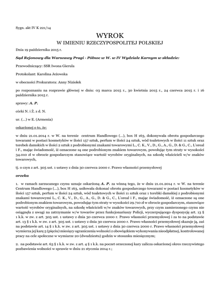 Sygn. akt IV K 221/14 WYROK W IMIENIU RZECZYPOSPOLITEJ POLSKIEJ Dnia 19 października 2015 r. Sąd Rejonowy dla Warszawy Pragi - Północ w W. w IV Wydziale Karnym w składzie: Przewodniczący: SSR Iwona Gierula Protokolant: Karolina Jeżowska w obecności Prokuratora: Anny Niziołek po rozpoznaniu na rozprawie głównej w dniu: 03 marca 2015 r., 30 kwietnia 2015 r., 24 czerwca 2015 r. i 16 października 2015 r. sprawy: A. P. córki N. i Ż. z d. N. ur. (...) w E. (Armenia) oskarżonej o to, że: w dniu 21.01.2014 r. w W. na terenie centrum Handlowego (...), box H 163, dokonywała obrotu gospodarczego towarami w postaci kosmetyków w ilości 157 sztuk, perfum w ilości 24 sztuk, wód toaletowych w ilości 11 sztuk oraz torebek damskich w ilości 2 sztuk z podrobionymi znakami towarowymi L., C. K., V., D., G., A., G., D. & G., C., L’oreal i F., mając świadomość, iż oznaczone są one podrobionym znakiem towarowym, powołując tym straty w wysokości 34.010 zł w obrocie gospodarczym stanowiące wartość wyrobów oryginalnych, na szkodę właścicieli w/w znaków towarowych, tj. o czyn z art. 305 ust. 1 ustawy z dnia 30 czerwca 2000 r. Prawo własności przemysłowej orzeka 1. w ramach zarzucanego czynu uznaje oskarżoną A. P. za winną tego, że w dniu 21.01.2014 r. w W. na terenie Centrum Handlowego (...), box H 163, usiłowała dokonać obrotu gospodarczego towarami w postaci kosmetyków w ilości 157 sztuk, perfum w ilości 24 sztuk, wód toaletowych w ilości 11 sztuk oraz 1 torebki damskiej z podrobionymi znakami towarowymi L., C. K., V., D., G., A., G., D. & G., C., L’oreal i F., mając świadomość, iż oznaczone są one podrobionym znakiem towarowym, powodując tym straty w wysokości 29.710 zł w obrocie gospodarczym, stanowiące wartość wyrobów oryginalnych, na szkodę właścicieli w/w znaków towarowych, przy czym zamierzonego czynu nie osiągnęła z uwagi na zatrzymanie w/w towarów przez funkcjonariuszy Policji, wyczerpującego dyspozycję art. 13 § 1 k.k. w zw. z art. 305 ust. 1 ustawy z dnia 30 czerwca 2000 r. Prawo własności przemysłowej i za to na podstawie art. 13 § 1 k.k. w zw. z art. 305 ust. 1 ustawy z dnia 30 czerwca 2000 r. Prawo własności przemysłowej skazuje ją, zaś na podstawie art. 14 § 1 k.k. w zw. z art. 305 ust. 1 ustawy z dnia 30 czerwca 2000 r. Prawo własności przemysłowej wymierza jej karę 5 (pięciu) miesięcy ograniczenia wolności z obowiązkiem wykonywania nieodpłatnej, kontrolowanej pracy na cele społeczne w wymiarze 20 (dwudziestu) godzin w stosunku miesięcznym; 2. na podstawie art. 63 § 1 k.k. w zw. z art. 4 § 1 k.k. na poczet orzeczonej kary zalicza oskarżonej okres rzeczywistego pozbawienia wolności w sprawie w dniu 21 stycznia 2014 r.; 3. na podstawie art. 306 ust. 2 ustawy z dnia 30 czerwca 2000 r. Prawo własności przemysłowej orzeka przepadek dowodów rzeczowych zarejestrowanych w wykazie dowodów rzeczowych Drz nr 105/14 pod poz. 1-33 (k. 83-85) poprzez zniszczenie; 4. na podstawie art. 230 § 2 k.p.k. nakazuje zwrot dowodu rzeczowego zarejestrowanego w wykazie dowodów rzeczowych DRZ nr 105/14 pod poz. 34 (k. 85) A. P. jako osobie uprawnionej; 5. na podstawie art. 627 k.p.k. w zw. z art. 113 § 1 k.k.s. zasądza od oskarżonej na rzecz oskarżycieli posiłkowych C. K., V., D., G., G., D. & G., C. i F. – reprezentowanych przez adw. Ł. B., Kancelaria (...). (...) Spółka Komandytowa w W. - kwoty po 310 zł (trzysta dziesięć złotych), tytułem zwrotu wydatków poniesionych w związku z ustanowieniem w sprawie pełnomocnika; 6. na podstawie art. 624 § 1 k.p.k. w zw. z art. 113 § 1 k.k.s. zwalnia oskarżoną od obowiązku zwrotu kosztów sądowych w całości, w tym od opłaty.