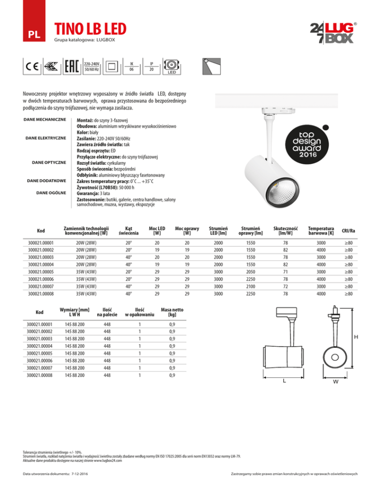 PL TINO LB LED Grupa katalogowa: LUGBOX Nowoczesny projektor wnętrzowy wyposażony w źródło światła LED, dostępny w dwóch temperaturach barwowych, oprawa przystosowana do bezpośredniego podłączenia do szyny trójfazowej, nie wymaga zasilacza. DANE MECHANICZNE DANE ELEKTRYCZNE DANE OPTYCZNE DANE DODATKOWE DANE OGÓLNE Montaż: do szyny 3-fazowej Obudowa: aluminium wtryskiwane wysokociśnieniowo Kolor: biały Zasilanie: 220-240V 50/60Hz Zawiera źródło światła: tak Rodzaj osprzętu: ED Przyłącze elektryczne: do szyny trójfazowej Rozsył światła: cyrkularny Sposób świecenia: bezpośredni Odbłyśnik: aluminiowy błyszczący fasetonowany Zakres temperatury pracy: 0˚C ... +35˚C Żywotność (L70B50): 50 000 h Gwarancja: 3 lata Zastosowanie: butiki, galerie, centra handlowe, salony samochodowe, muzea, wystawy, ekspozycje Kod Zamiennik technologii konwencjonalnej [W] Kąt świecenia Moc LED [W] Moc oprawy [W] Strumień LED [lm] Strumień oprawy [lm] Skuteczność [lm/W] Temperatura barwowa [K] CRI/Ra 300021.00001 300021.00002 300021.00003 300021.00004 300021.00005 300021.00006 300021.00007 300021.00008 20W (28W) 20W (28W) 20W (28W) 20W (28W) 35W (43W) 35W (43W) 35W (43W) 35W (43W) 20° 20° 40° 40° 20° 20° 40° 40° 20 19 20 19 29 29 29 29 20 19 20 19 29 29 29 29 2000 2000 2000 2000 3000 3000 3000 3000 1550 1550 1550 1550 2050 2250 2100 2250 78 82 78 82 71 78 72 78 3000 4000 3000 4000 3000 4000 3000 4000 ≥80 ≥80 ≥80 ≥80 ≥80 ≥80 ≥80 ≥80 Kod Wymiary [mm] LWH Ilość na palecie Ilość w opakowaniu Masa netto [kg] 300021.00001 300021.00002 300021.00003 300021.00004 300021.00005 300021.00006 300021.00007 300021.00008 145 88 200 145 88 200 145 88 200 145 88 200 145 88 200 145 88 200 145 88 200 145 88 200 448 448 448 448 448 448 448 448 1 1 1 1 1 1 1 1 0,9 0,9 0,9 0,9 0,9 0,9 0,9 0,9 Tolerancja strumienia świetlnego +/- 10%. Strumień światła, rozkład natężenia światła i wydajność świetlna zostały zbadane według normy EN ISO 17025:2005 dla serii norm EN13032 oraz normy LM-79. Aktualne dane produktu dostępne na naszej stronie www.lugbox24.com Data utworzenia dokumentu: 7-12-2016 Zastrzegamy sobie prawo zmian konstrukcyjnych w oprawach oświetleniowych PL TINO LB LED Grupa katalogowa: LUGBOX KRZYWE ŚWIATŁOŚCI 300021.00001 300021.00003 PRZYKŁADOWE REALIZACJE Supermarket Intermarche, Czarnków, Polska Tolerancja strumienia świetlnego +/- 10%. Strumień światła, rozkład natężenia światła i wydajność świetlna zostały zbadane według normy EN ISO 17025:2005 dla serii norm EN13032 oraz normy LM-79. Aktualne dane produktu dostępne na naszej stronie www.lugbox24.com Data utworzenia dokumentu: 7-12-2016 Zastrzegamy sobie prawo zmian konstrukcyjnych w oprawach oświetleniowych
