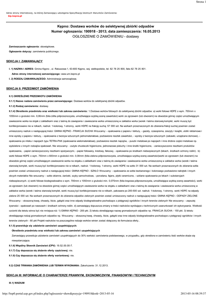 Strona 1 Adres strony internetowej, na której Zamawiający udostępnia Specyfikację Istotnych Warunków Zamówienia: bip.kepno.pl Kępno: Dostawa worków do selektywnej zbiórki odpadów Numer ogłoszenia: 190918 - 2013; data zamieszczenia: 16.05.2013 OGŁOSZENIE O ZAMÓWIENIU - dostawy Zamieszczanie ogłoszenia: obowiązkowe. Ogłoszenie dotyczy: zamówienia publicznego. SEKCJA I: ZAMAWIAJĄCY I. 1) NAZWA I ADRES: Gmina Kępno , ul. Ratuszowa 1, 63-600 Kępno, woj. wielkopolskie, tel. 62 78 25 800, faks 62 78 25 801. Adres strony internetowej zamawiającego: www.um.kepno.pl I. 2) RODZAJ ZAMAWIAJĄCEGO: Administracja samorządowa. SEKCJA II: PRZEDMIOT ZAMÓWIENIA II.1) OKREŚLENIE PRZEDMIOTU ZAMÓWIENIA II.1.1) Nazwa nadana zamówieniu przez zamawiającego: Dostawa worków do selektywnej zbiórki odpadów. II.1.2) Rodzaj zamówienia: dostawy. II.1.4) Określenie przedmiotu oraz wielkości lub zakresu zamówienia: 1.Dostawa worków foliowych do selektywnej zbiórki odpadów: a) worki foliowe HDPE o wym. 700mm x 1050mm o grubości min. 0,06mm (folia żółta półprzezroczysta, umożliwiająca szybką ocenę zawartości) worki ze zgrzewem (lub otworami) na obwodzie górnej części umożliwiającym zawieszenie worka na stojak z zakładkami oraz z taśmą do zawiązania i zawieszania worka umieszczoną w zakładce worka (worek i taśma stanowią komplet, worki muszą być konfekcjonowane nie w rolkach, nadruk: 1-kolorowy, 1-stronny, worki HDPE na frakcję suchą: 57 000 szt. Na workach przeznaczonych do zbierania frakcji suchej powinien zostać umieszczony nadruk o następującej treści: GMINA KĘPNO - FRAKCJA SUCHA Wrzucamy: - opakowania z papieru i tektury, - gazety, czasopisma, zeszyty i książki, ulotki reklamowe i inne wyroby z papieru i tektury, - opakowania z tworzyw sztucznych jednomateriałowe, pozbawione resztek zawartości, - wyroby z tworzyw sztucznych (zabawki, urządzane domowe), opakowania po mleku i napojach typu TETRA-PAK (opakowania wielomateriałowe), pozbawione resztek napojów, - puszki metalowe po napojach i inne drobne części metalowe np. wydzielone z innych rodzajów opakowań. Nie wrzucamy: - zużyte chusteczki higieniczne, jednorazowe pieluchy i inne środki higieniczne, - zanieczyszczone resztkami produktów opakowania, - papier zanieczyszczony resztkami spożywczymi, - papier foliowany, kredowy, faksowy, - opakowania po środkach niebezpiecznych (lekach, środkach ochrony roślin) . b) worki foliowe HDPE o wym. 750mm x 600mm o grubości min. 0,08mm (folia zielona półprzezroczysta, umożliwiająca szybką ocenę zawartości)worki ze zgrzewem (lub otworami) na obwodzie górnej części umożliwiającym zawieszenie worka na stojaku z zakładkami oraz z taśmą do zawiązania i zawieszania worka umieszczoną w zakładce worka (worek i taśma stanowią komplet, worki muszą być konfekcjonowane nie w rolkach, nadruk: 1-kolorowy, 1-stronny, worki HDPE na szkło 31 000 szt. Na workach przeznaczonych do zbierania szkła powinien zostać umieszczony nadruk o następującej treści: GMINA KĘPNO - SZKŁO Wrzucamy: - opakowania ze szkła bezbarwnego i kolorowego pozbawione nakrętek i innych obcych materiałów Nie wrzucamy: - szkło okienne, żarówki, szyby samochodowe, - porcelana, fajans, płytki ceramiczne, - szklane opakowania po lekach i substancjach niebezpiecznych. c) worki foliowe biodegradowalne o wym. 700mm x 1050mm o grubości min. 0,075mm (folia brązowa półprzezroczysta, umożliwiająca szybką ocenę zawartości), worki ze zgrzewem (lub otworami) na obwodzie górnej części umożliwiającym zawieszenie worka na stojaku z zakładkami oraz z taśmą do zawiązania i zawieszania worka umieszczoną w zakładce worka (worek i taśma stanowią komplet, worki muszą być konfekcjonowane nie w rolkach, pakowane po 200-500 szt. nadruk: 1-kolorowy, 1-stronny. worki HDPE na odpady zielone 25 000 szt. Na workach przeznaczonych do zbierania odpadów zielonych powinien zostać umieszczony nadruk o następującej treści: GMINA KĘPNO - ODPADY ZIELONE Wrzucamy: - skoszoną trawę, chwasty, liście, gałązki oraz inne odpady biodegradowalne pochodzące z pielęgnacji ogródków i innych terenów zielonych Nie wrzucamy: - zepsutej żywności - opakowań po nawozach i środkach ochrony roślin. d) zamawiający dopuszcza zmiany w treści nadruków wynikające z technicznych uwarunkowań ich wykonywania. Wielkość czcionki dla tekstu winna być nie mniejsza niż: 1) GMINA KĘPNO - 200 pkt. 2) tekstu określającego nazwę gromadzonych odpadów np. FRAKCJA SUCHA - 150 pkt. 3) tekstu określającego rodzaj gromadzonych odpadów np. Wrzucamy: - skoszoną trawę, chwasty, liście, gałązki oraz inne odpady biodegradowalne pochodzące z pielęgnacji ogródków i innych terenów zielonych - 80 pkt Projekt nadruków na poszczególne rodzaje worków winien zostać dołączony do formularza oferty.. II.1.5) przewiduje się udzielenie zamówień uzupełniających: Określenie przedmiotu oraz wielkości lub zakresu zamówień uzupełniających Zamawiający przewiduje udzielenie zamówień uzupełniających do 30% wartości zamówienia podstawowego, w przypadku, gdy określona w zamówieniu ilość worków okaże się niewystarczająca. II.1.6) Wspólny Słownik Zamówień (CPV): 19.52.00.00-7. II.1.7) Czy dopuszcza się złożenie oferty częściowej: nie. II.1.8) Czy dopuszcza się złożenie oferty wariantowej: nie. II.2) CZAS TRWANIA ZAMÓWIENIA LUB TERMIN WYKONANIA: Zakończenie: 31.12.2013. SEKCJA III: INFORMACJE O CHARAKTERZE PRAWNYM, EKONOMICZNYM, FINANSOWYM I TECHNICZNYM III.1) WADIUM http://bzp0.portal.uzp.gov.pl/index.php?ogloszenie=show&pozycja=190918&rok=2013-05-16 2013-05-16 08:39:37 Strona 2 Informacja na temat wadium: 1. Wykonawca zobowiązany jest do wniesienia przed upływem terminu składania ofert wadium w wysokości: 1 800,00 złotych (pięć tysięcy 00/100 złotych) 2. Wadium w formie pieniężnej (PLN) należy wnieść przelewem na konto Urzędu Miasta