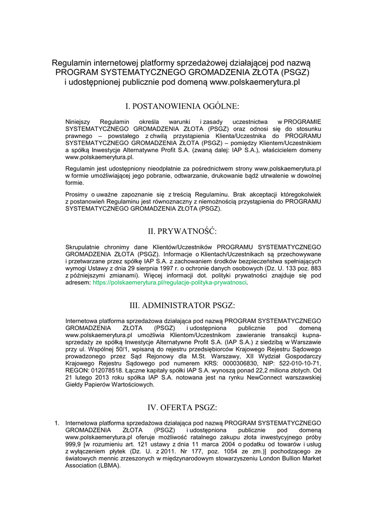 Regulamin internetowej platformy sprzedażowej działającej pod nazwą PROGRAM SYSTEMATYCZNEGO GROMADZENIA ZŁOTA (PSGZ) i udostępnionej publicznie pod domeną www.polskaemerytura.pl I. POSTANOWIENIA OGÓLNE: Niniejszy Regulamin określa warunki i zasady uczestnictwa w PROGRAMIE SYSTEMATYCZNEGO GROMADZENIA ZŁOTA (PSGZ) oraz odnosi się do stosunku prawnego – powstałego z chwilą przystąpienia Klienta/Uczestnika do PROGRAMU SYSTEMATYCZNEGO GROMADZENIA ZŁOTA (PSGZ) – pomiędzy Klientem/Uczestnikiem a spółką Inwestycje Alternatywne Profit S.A. (zwaną dalej: IAP S.A.), właścicielem domeny www.polskaemerytura.pl. Regulamin jest udostępniony nieodpłatnie za pośrednictwem strony www.polskaemerytura.pl w formie umożliwiającej jego pobranie, odtwarzanie, drukowanie bądź utrwalenie w dowolnej formie. Prosimy o uważne zapoznanie się z treścią Regulaminu. Brak akceptacji któregokolwiek z postanowień Regulaminu jest równoznaczny z niemożnością przystąpienia do PROGRAMU SYSTEMATYCZNEGO GROMADZENIA ZŁOTA (PSGZ). II. PRYWATNOŚĆ: Skrupulatnie chronimy dane Klientów/Uczestników PROGRAMU SYSTEMATYCZNEGO GROMADZENIA ZŁOTA (PSGZ). Informacje o Klientach/Uczestnikach są przechowywane i przetwarzane przez spółkę IAP S.A. z zachowaniem środków bezpieczeństwa spełniających wymogi Ustawy z dnia 29 sierpnia 1997 r. o ochronie danych osobowych (Dz. U. 133 poz. 883 z późniejszymi zmianami). Więcej informacji dot. polityki prywatności znajduje się pod adresem: https://polskaemerytura.pl/regulacje-polityka-prywatnosci. III. ADMINISTRATOR PSGZ: Internetowa platforma sprzedażowa działająca pod nazwą PROGRAM SYSTEMATYCZNEGO GROMADZENIA ZŁOTA (PSGZ) i udostępniona publicznie pod domeną www.polskaemerytura.pl umożliwia Klientom/Uczestnikom zawieranie transakcji kupnasprzedaży ze spółką Inwestycje Alternatywne Profit S.A. (IAP S.A.) z siedzibą w Warszawie przy ul. Wspólnej 50/1, wpisaną do rejestru przedsiębiorców Krajowego Rejestru Sądowego prowadzonego przez Sąd Rejonowy dla M.St. Warszawy, XII Wydział Gospodarczy Krajowego Rejestru Sądowego pod numerem KRS: 0000306830, NIP: 522-010-10-71, REGON: 012078518. Łączne kapitały spółki IAP S.A. wynoszą ponad 22,2 miliona złotych. Od 21 lutego 2013 roku spółka IAP S.A. notowana jest na rynku NewConnect warszawskiej Giełdy Papierów Wartościowych. IV. OFERTA PSGZ: 1. Internetowa platforma sprzedażowa działająca pod nazwą PROGRAM SYSTEMATYCZNEGO GROMADZENIA ZŁOTA (PSGZ) i udostępniona publicznie pod domeną www.polskaemerytura.pl oferuje możliwość ratalnego zakupu złota inwestycyjnego próby 999,9 [w rozumieniu art. 121 ustawy z dnia 11 marca 2004 o podatku od towarów i usług z wyłączeniem płytek (Dz. U. z 2011. Nr 177, poz. 1054 ze zm.)] pochodzącego ze światowych mennic zrzeszonych w międzynarodowym stowarzyszeniu London Bullion Market Association (LBMA). 2. Przystąpienie do PROGRAMU SYSTEMATYCZNEGO GROMADZENIA ZŁOTA (PSGZ) jest dobrowolne i może nastąpić drogą elektroniczną lub osobiście w oddziałach spółki IAP S.A. 3. Warunkiem przystąpienia do PROGRAMU SYSTEMATYCZNEGO GROMADZENIA ZŁOTA (PSGZ) jest dokonanie prawidłowej rejestracji oraz zapoznanie się i akceptacja postanowień Regulaminu. 4. Do PROGRAMU SYSTEMATYCZNEGO GROMADZENIA ZŁOTA (PSGZ) mogą przystąpić jedynie osoby pełnoletnie. 5. Dane wprowadzane przez Klienta/Uczestnika podczas rejestracji muszą być pełne i aktualne. Zakazane jest posługiwanie się fałszywymi danymi personalnymi lub należącymi do osób trzecich, podszywanie się pod inne osoby bądź wprowadzanie w błąd co do swojej tożsamości. 6. Dane wprowadzone podczas rejestracji – w razie zaistnienia zmian – powinny zostać niezwłocznie zaktualizowane przez Klienta/Uczestnika. 7. Uczestnictwo w PROGRAMIE SYSTEMATYCZNEGO GROMADZENIA ZŁOTA (PSGZ) jest bezpłatne. 8. Jednostką rozliczeniową (JR) w PROGRAMIE SYSTEMATYCZNEGO GROMADZENIA ZŁOTA (PSGZ) jest 5-gramowa sztabka złota próby 999,9 z akredytacją LBMA. 9. Zakupu złota za pośrednictwem PROGRAMU SYSTEMATYCZNEGO GROMADZENIA ZŁOTA (PSGZ) można dokonać jednorazowo lub ratalnie, kupując dowolną liczbę jednostek rozliczeniowych (JR) lub ich części, które liczone są z dokładnością do trzech miejsc po przecinku. 10. Za dzień zaksięgowania uznaje się datę wpłynięcia środków na rachunek bankowy spółki IAP S.A. Cena jednostki rozliczeniowej (JR) lub jej części ustalana jest w oparciu o ostatni fixing poranny LBMA na dzień zaksięgowania przelewu, ostatni średni kurs dolara wg NBP (tabela A) na dzień zaksięgowania przelewu oraz koszt bicia sztabki (do 13 USD) i marżę spółki IAP S.A. dla sztabki 5-gramowej (do 4 proc.). 11. Z chwilą ustanowienia parametrów deklarowanych wpłat w PROGRAMIE SYSTEMATYCZNEGO GROMADZENIA ZŁOTA (PSGZ), Klient/Uczestnik powinien niezwłocznie dokonać wpłaty na konto bankowe spółki IAP S.A. 12. Minimalna wpłata dokonana przez Klienta/Uczestnika w ramach SYSTEMATYCZNEGO GROMADZENIA ZŁOTA (PSGZ) wynosi 50 złotych. PROGRAMU 13. Niezwłocznie po zaksięgowaniu wpłaty na rachunku bankowym spółki IAP S.A., zostanie ona przeksięgowywana na jednostki rozliczeniowe (JR) lub ich część. Klient/Uczestnik każdorazowo otrzyma wiadomość e-mail z potwierdzeniem dokonanej operacji, a także z informacją o kursach księgowania (kurs dolara i kurs złota) oraz o aktualnym stanie konta w ułamkowych częściach grama złota do trzech miejsc po przecinku. 14. Klient/Uczestnik ma swobodny dostęp do panelu Klienta, w którym w dowolnym momencie może sprawdzić ilość gramów złota zakupionych za każdą wpłatę, zweryfikować całkowitą ilość posiadanego złota inwestycyjnego i jego bieżącą wartość oraz sprzedać zgromadzone złoto lub zlecić jego wypłatę. 15. W przypadku nieotrzymania przez spółkę IAP S.A. deklarowanej wpłaty, na adres e-mail Klienta/Uczestnika będą wysyłane przypomnienia. V. CZYNN