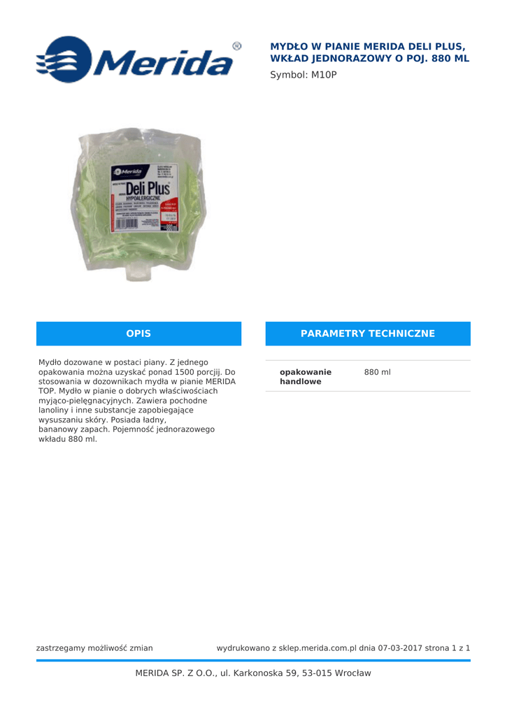 MYDŁO W PIANIE MERIDA DELI PLUS, WKŁAD JEDNORAZOWY O POJ. 880 ML Symbol: M10P OPIS PARAMETRY TECHNICZNE Mydło dozowane w postaci piany. Z jednego opakowania można uzyskać ponad 1500 porcjij. Do stosowania w dozownikach mydła w pianie MERIDA TOP. Mydło w pianie o dobrych właściwościach myjąco-pielęgnacyjnych. Zawiera pochodne lanoliny i inne substancje zapobiegające wysuszaniu skóry. Posiada ładny, bananowy zapach. Pojemność jednorazowego wkładu 880 ml. zastrzegamy możliwość zmian opakowanie handlowe 880 ml wydrukowano z sklep.merida.com.pl dnia 07-03-2017 strona 1 z 1 MERIDA SP. Z O.O., ul. Karkonoska 59, 53-015 Wrocław