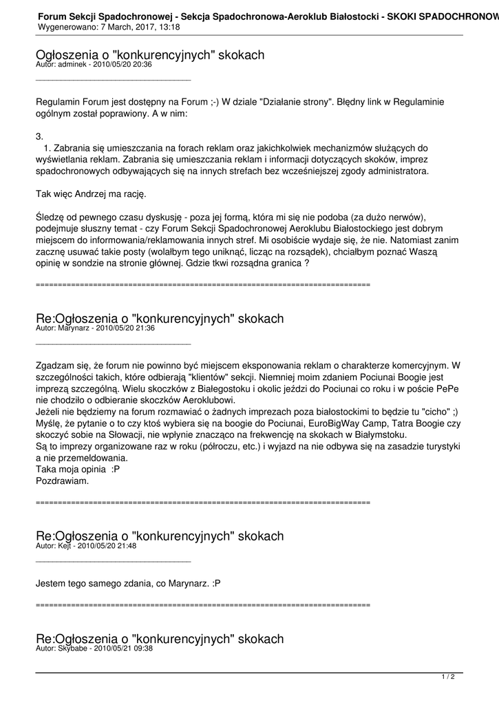 Forum Sekcji Spadochronowej - Sekcja Spadochronowa-Aeroklub Białostocki - SKOKI SPADOCHRONOW Wygenerowano: 7 March, 2017, 13:18 Ogłoszenia o "konkurencyjnych" skokach Autor: adminek - 2010/05/20 20:36 _____________________________________ Regulamin Forum jest dostępny na Forum ;-) W dziale "Działanie strony". Błędny link w Regulaminie ogólnym został poprawiony. A w nim: 3. 1. Zabrania się umieszczania na forach reklam oraz jakichkolwiek mechanizmów służących do wyświetlania reklam. Zabrania się umieszczania reklam i informacji dotyczących skoków, imprez spadochronowych odbywających się na innych strefach bez wcześniejszej zgody administratora. Tak więc Andrzej ma rację. Śledzę od pewnego czasu dyskusję - poza jej formą, która mi się nie podoba (za dużo nerwów), podejmuje słuszny temat - czy Forum Sekcji Spadochronowej Aeroklubu Białostockiego jest dobrym miejscem do informowania/reklamowania innych stref. Mi osobiście wydaje się, że nie. Natomiast zanim zacznę usuwać takie posty (wolałbym tego uniknąć, licząc na rozsądek), chciałbym poznać Waszą opinię w sondzie na stronie głównej. Gdzie tkwi rozsądna granica ? ============================================================================ Re:Ogłoszenia o "konkurencyjnych" skokach Autor: Marynarz - 2010/05/20 21:36 _____________________________________ Zgadzam się, że forum nie powinno być miejscem eksponowania reklam o charakterze komercyjnym. W szczególności takich, które odbierają "klientów" sekcji. Niemniej moim zdaniem Pociunai Boogie jest imprezą szczególną. Wielu skoczków z Białegostoku i okolic jeździ do Pociunai co roku i w poście PePe nie chodziło o odbieranie skoczków Aeroklubowi. Jeżeli nie będziemy na forum rozmawiać o żadnych imprezach poza białostockimi to będzie tu "cicho" ;) Myślę, że pytanie o to czy ktoś wybiera się na boogie do Pociunai, EuroBigWay Camp, Tatra Boogie czy skoczyć sobie na Słowacji, nie wpłynie znacząco na frekwencję na skokach w Białymstoku. Są to imprezy organizowane raz w roku (półroczu, etc.) i wyjazd na nie odbywa się na zasadzie turystyki a nie przemeldowania. Taka moja opinia :P Pozdrawiam. ============================================================================ Re:Ogłoszenia o "konkurencyjnych" skokach Autor: Kejt - 2010/05/20 21:48 _____________________________________ Jestem tego samego zdania, co Marynarz. :P ============================================================================ Re:Ogłoszenia o "konkurencyjnych" skokach Autor: Skybabe - 2010/05/21 09:38 1/2 Forum Sekcji Spadochronowej - Sekcja Spadochronowa-Aeroklub Białostocki - SKOKI SPADOCHRONOW Wygenerowano: 7 March, 2017, 13:18 _____________________________________ Zgadzam się z Marynarzem. ============================================================================ Re:Ogłoszenia o "konkurencyjnych" skokach Autor: cichy - 2010/05/21 11:18 _____________________________________ 3. 1. Zabrania się umieszczania na forach reklam oraz jakichkolwiek mechanizmów służących do wyświetlania reklam. Zabrania się umieszczania reklam i informacji dotyczących skoków, imprez spadochronowych odbywających się na innych strefach bez wcześniejszej zgody administratora. O zmianie tego punktu ( wg. pkt. 5 regulaminu )będzie decydował tylko i wyłącznie Zarząd Sekcji A.B. W zarządzie sekcji znajdują się instr. spad. pracujący w klubie. Jak na na razie, nie podjeliśmy takiej decyzji, aczkolwiek przedstawie sprawę na dzisiejszych skokach. O zmianach na pewno zostaniecie poinformowani. Do tej pory proszę reklame przeniesc na fora ogólno dostępne np.www.freefly.pl ze spadochronowym pozdrowieniem andrzej manowski p.s. zapraszamy na skoki dziś od 15.30 ============================================================================ Re:Ogłoszenia o "konkurencyjnych" skokach Autor: PePe - 2010/05/21 14:54 _____________________________________ Nie żebym podkopywał czyjkolwiek autorytet, a tym bardziej postanowienia regulaminu, ale ja to widzę w skrócie ujmując tak: Jeśli umieszczona przeze mnie informacja o skokach na konkurencyjnej strefie nie powoduje, że dzięki temu zarabiam (w jakikolwiek sposób), to nie jest to żadna reklama ;) A już na pewno nie porównujcie tego do banerów reklamowych... Chciałem dobrze, tak w ramach Naszej wewnątrz-sekcyjnej integracji, ale chyba nie wyszło... Pozdrawiam! ============================================================================ 2/2