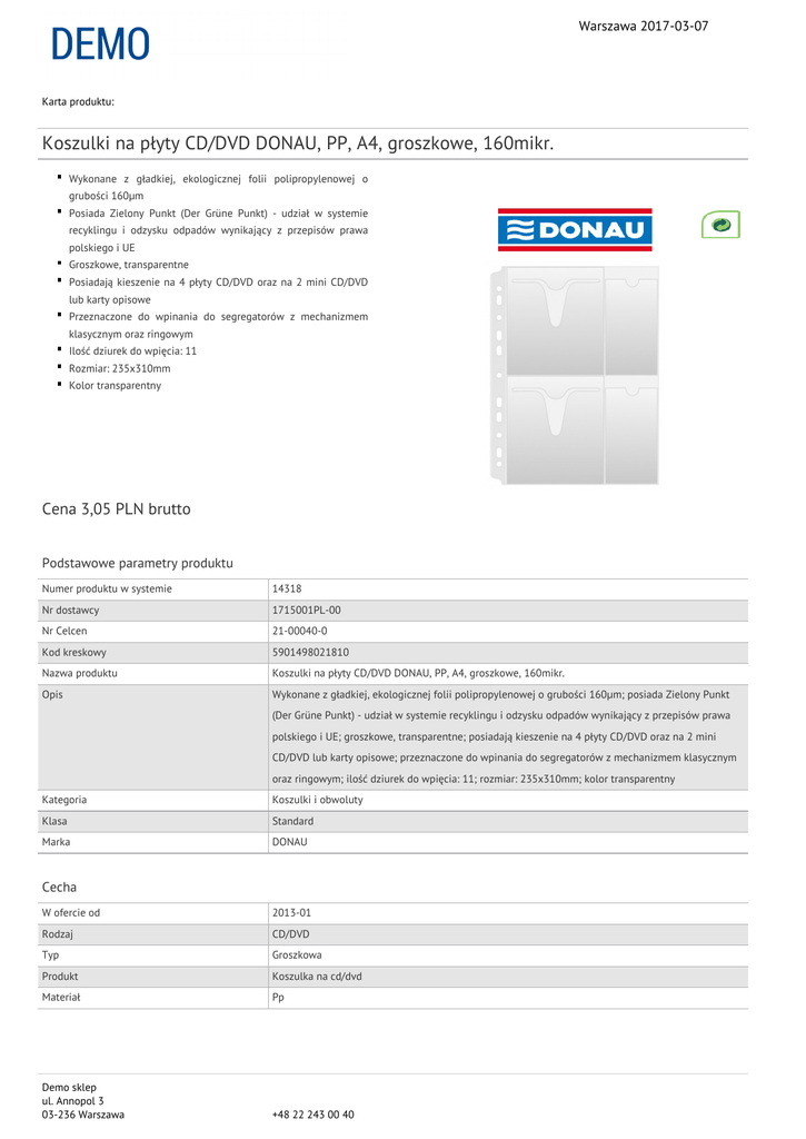 Warszawa 2017-03-07 Karta produktu: Koszulki na płyty CD/DVD DONAU, PP, A4, groszkowe, 160mikr. Wykonane z gładkiej, ekologicznej folii polipropylenowej o grubości 160μm Posiada Zielony Punkt (Der Grüne Punkt) - udział w systemie recyklingu i odzysku odpadów wynikający z przepisów prawa polskiego i UE Groszkowe, transparentne Posiadają kieszenie na 4 płyty CD/DVD oraz na 2 mini CD/DVD lub karty opisowe Przeznaczone do wpinania do segregatorów z mechanizmem klasycznym oraz ringowym Ilość dziurek do wpięcia: 11 Rozmiar: 235x310mm Kolor transparentny Cena 3,05 PLN brutto Podstawowe parametry produktu Numer produktu w systemie 14318 Nr dostawcy 1715001PL-00 Nr Celcen 21-00040-0 Kod kreskowy 5901498021810 Nazwa produktu Koszulki na płyty CD/DVD DONAU, PP, A4, groszkowe, 160mikr. Opis Wykonane z gładkiej, ekologicznej folii polipropylenowej o grubości 160μm; posiada Zielony Punkt (Der Grüne Punkt) - udział w systemie recyklingu i odzysku odpadów wynikający z przepisów prawa polskiego i UE; groszkowe, transparentne; posiadają kieszenie na 4 płyty CD/DVD oraz na 2 mini CD/DVD lub karty opisowe; przeznaczone do wpinania do segregatorów z mechanizmem klasycznym oraz ringowym; ilość dziurek do wpięcia: 11; rozmiar: 235x310mm; kolor transparentny Kategoria Koszulki i obwoluty Klasa Standard Marka DONAU Cecha W ofercie od 2013-01 Rodzaj CD/DVD Typ Groszkowa Produkt Koszulka na cd/dvd Materiał Pp Demo sklep ul. Annopol 3 03-236 Warszawa +48 22 243 00 40 Warszawa 2017-03-07 Karta katalogowa produktu cd. Koszulki na płyty CD/DVD DONAU, PP, A4, groszkowe, 160mikr. Wymiary Format A4 Grubość (mm) 160µm Wymiary (mm) 235x310 Wspólny słownik zamówień CPV 30192500-6 Okładki przezroczyste Certyfikaty Nowy produkt w ofercie Standard Hit Standard Ilość Ilość dziurek 11 Kolor Kolor Transparentny Pozostałe zdjęcia produktu Serdecznie zapraszamy do współpracy Demo sklep zespół. Demo sklep ul. Annopol 3 03-236 Warszawa +48 22 243 00 40