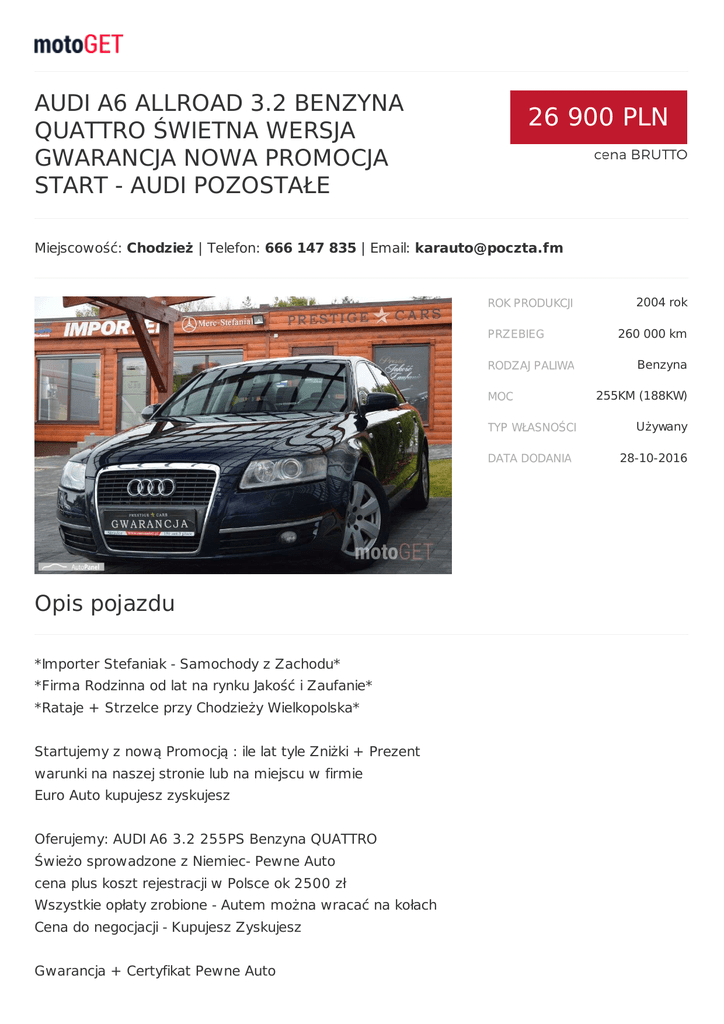 AUDI A6 ALLROAD 3.2 BENZYNA QUATTRO ŚWIETNA WERSJA GWARANCJA NOWA PROMOCJA START - AUDI POZOSTAŁE 26 900 PLN cena BRUTTO Miejscowość: Chodzież | Telefon: 666 147 835 | Email: [email protected] 2004 rok 260 000 km Benzyna 255KM (188KW) Używany 28-10-2016 Opis pojazdu *Importer Stefaniak - Samochody z Zachodu* *Firma Rodzinna od lat na rynku Jakość i Zaufanie* *Rataje + Strzelce przy Chodzieży Wielkopolska* Startujemy z nową Promocją : ile lat tyle Zniżki + Prezent warunki na naszej stronie lub na miejscu w firmie Euro Auto kupujesz zyskujesz Oferujemy: AUDI A6 3.2 255PS Benzyna QUATTRO Świeżo sprowadzone z Niemiec- Pewne Auto cena plus koszt rejestracji w Polsce ok 2500 zł Wszystkie opłaty zrobione - Autem można wracać na kołach Cena do negocjacji - Kupujesz Zyskujesz Gwarancja + Certyfikat Pewne Auto SUPER WYPOSAŻENIE: - Klimatyzacja 2-strefowa - Nawigacja - Podgrzewane przednie fotele - Sk�łrzana tapicerka o podwyższonej jakości - Sk�łrzana wielofunkcyjna kierownica - Światła przeciwmgielne - Światła XSENON - Tempomat/Limit - Czujniki parkowania prz�łd/tył - Podłokietniki prz�łd/tył - El. Szyby prz�łd/tył - El. Ustawiane/podgrzewane lusterka - Oryginalne Radio - Dzielona rozkładana tylna kanapa - Poduszki i kurtyny powietrzne - Wnętrze wykończone drewnem - Pakiet Chrom - Alufelgi AUDI - ABS - ESP - ASR + inne dodatki Technicznie prowadzi się perfekcyjnie Audi A6 - super do jazdy - fajnie zaprojektowany Skrzynia bieg�łw automatyczna- komfort i przyjemność z jazdy Super kolor dodatki chromowe Alufelgi - prezentuje się rewelacyjnie. Dołączyliśmy autentyczne zdjęcia + aktualny opis stworzony do oferty Gwarancja Mechaniczna + Prawna W skład gwarancji wchodzi Program Firmowy Pewne Auto Serwisowanie, auto zastępcze + Pakiet Korzyści Zdobyta wiedza i doświadczenie pozwalają nam na wystawienie fachowej opinii o danym samochodzie AUTO ROZLICZENIE - ZAMIANY - WYMIANY - Atrakcyjne warunki Możliwość pozostawienia swojego pojazdu w rozliczeniu RATY - KREDYT LEASING oferta kilku bank�łw jesteśmy AUTORYZOWANYM PARTNEREM Żaden szczeg�łłowy opis oraz zdjęcia nie zastąpią rzetelnej rozmowy Sprzedaż partnerska. Konsultacje , Doradztwo Mateusz 666 147 835 Karol Stefaniak 533 133 800 Biuro obsługi - Finansowanie 533 165 165 Magda, Dominika Kontakt mailowy mile widziany Oferta w kraju średnio 150 samochod�łw + oddział w Niemczech Własny import - wsp�łłpraca Polsko - Niemiecka Samochody sprzedajemy z gwarancją wymiany, zamiany, odkupu. #Ponosimy pełną prawną odpowiedzialność za zamieszczone ogłoszenie# Kr�łtko o nas: Firma rodzinna. Pasjonaci kt�łrzy kochają swoją pracę. Pełni ciepła, uwielbiamy dzielić się z innymi swoją pozytywną energią. �€�Wierzymy w to co robimy i uwielbiamy kiedy efekty naszej pracy są widoczne. Najważniejszy dla nas jest uśmiech na twarzy klienta.�€� Ciekawostki z życia firmy ''nie samą pracą człowiek żyje'' Videoprezentacja: relacje na żywo, filmiki, teledysk itp nowinki ciekawostki Polecamy zobaczyć nasz fanpage na Facebook'u Udzielamy się społecznie, bierzemy czynny udział w akcjach charytatywnych. Wspieramy Fundacje UKRYTE MARZENIA Wspieramy r�łżnego rodzaju szlachetne cele. Pomagamy sportowcom z powiatu Chodzieskiego. Wspieramy Zesp�łł piłki nożnej Polonia Chodzież Oldboje. Promujemy inne firmy. Organizujemy r�łżnego typy imprezy w regionie. Stajnia Strzelęcin - wprowadzamy naukę jazdy konnej. Szkoła nauki jazdy - nasza rodzina jest od 27 lat na rynku. Możemy pochwalić się wieloma sukcesami. Staramy się jak najlepiej - działamy dynamicznie. Firma Rodzinna Stefaniak z silną pozycją na rynku. Serdecznie Zapraszamy - ASR - kierownica wielofunkcyjna - czujnik parkowania - swiatla przeciwmglowe - skorzana tapicerka - podgrzewane fotele - ESP - ABS - alufelgi - centr. zamek - el. lusterka - el. szyby - immobiliser - klimatyzacja automatyczna - komputer - nawigacja - poduszki - radio z CD - skóra - wsp. kierownicy - ksenony - tempomat