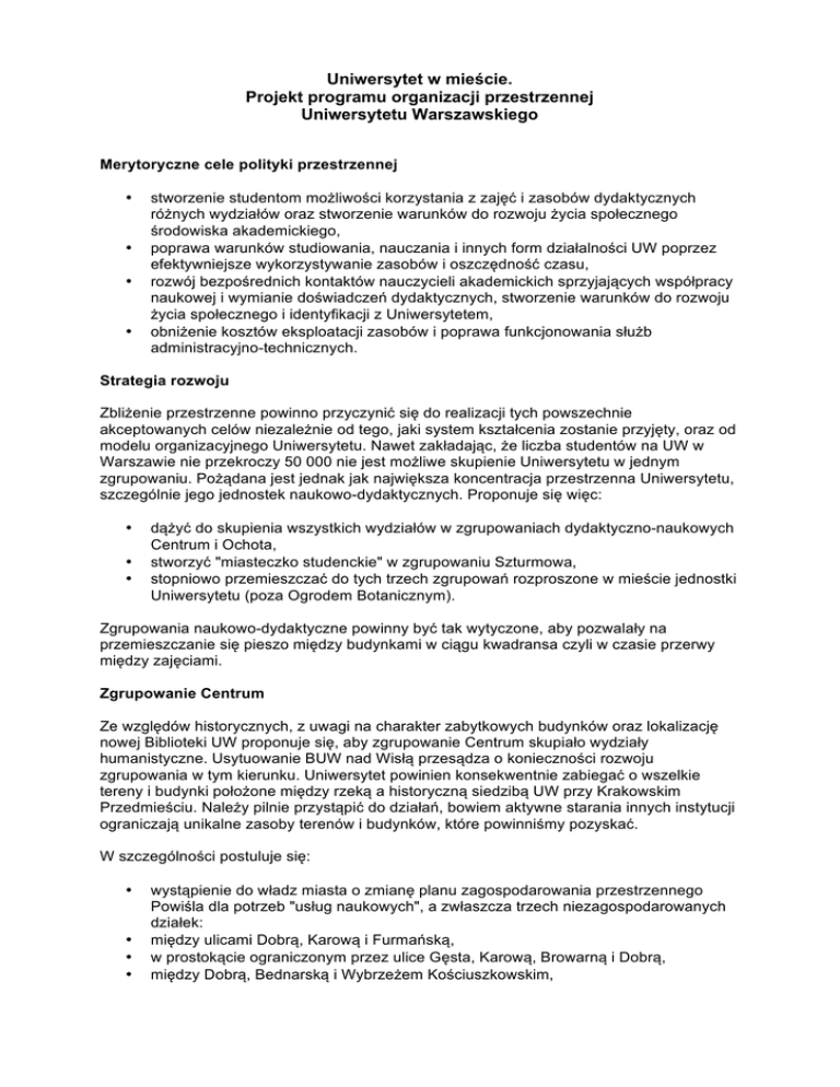 zgrupowaniu. Pożądana jest jednak jak największa koncentracja przestrzenna Uniwersytetu,