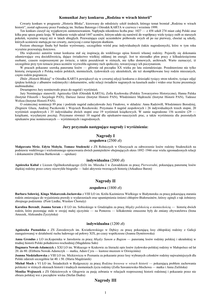 Komunikat Jury konkursu „Rodzina w wirach historii” Czwarty konkurs w programie „Historia Bliska”, kierowany do młodzieŜy szkół średnich, którego temat brzmiał „Rodzina w wirach historii”, został ogłoszony przez Fundację im. Stefana Batorego i Ośrodek KARTA w czerwcu i wrześniu 1999. Ten konkurs cieszył się wyjątkowym zainteresowaniem. Napłynęła rekordowa liczba prac: 1027 — z 458 szkół 274 miast całej Polski oraz kilka prac spoza granic kraju. W konkursie wzięło udział 1447 uczniów, którym udało się namówić do współpracy wiele tysięcy osób ze starszych pokoleń, wyraźnie więcej niŜ w latach ubiegłych. PrzewaŜająca część uczestników próbowała swych sił po raz pierwszy, chociaŜ są szkoły, których uczniowie startują po raz czwarty, zazwyczaj z coraz lepszym skutkiem. Poziom obecnego finału był bardzo wyrównany, szczególnie wśród prac indywidualnych (takŜe nagrodzonych), które w tym roku wyraźnie przewaŜają ilościowo. Dla większości autorów temat konkursu stał się inspiracją do wnikliwego opisu historii własnej rodziny. Pojawiły się dokonania zdumiewające swą dociekliwością, dające świadectwo wielkiej oddanej im energii. Jest to nierzadko plon pracy z kilkudziesięcioma osobami, czasem rozproszonymi po świecie, a takŜe poszukiwań w róŜnych, nie tylko domowych, archiwach. Warto zaznaczyć, iŜ szczególnie przy tym temacie praca uczniów wyzwoliła ogromny ruch społeczny, towarzyszący ich poczynaniom. W pracach pokazano szeroką panorama losów — głównie od początku XX wieku po lata osiemdziesiąte. Przedstawiono nie tylko historię związanych z Polską rodzin polskich, niemieckich, Ŝydowskich czy ukraińskich, ale teŜ skomplikowane losy rodzin mieszanych, często rodzin pogranicza. Zbiór „Historii Bliskiej” w Ośrodku KARTA powiększył się w czwartej edycji konkursu o dziesiątki tysięcy stron tekstów, tysiące zdjęć (piękne kolekcje z albumów rodzinnych) i dokumentów, setki relacji świadków nagranych na kasetach audio i wideo oraz liczne prezentacje multimedialne. Dwuetapowe Jury nominowało prace do nagród i wyróŜnień. Jury Nominujące stanowili: Agnieszka Gleb (Ośrodek KARTA), Zofia Kozłowska (Polskie Towarzystwo Historyczne), Hanna Palska (Instytut Filozofii i Socjologii PAN), Dariusz Jarosz (Instytut Historii PAN), Włodzimierz Mędrzecki (Instytut Historii PAN), Tadeusz Wolsza (Instytut Historii PAN). O ostatecznej nominacji 89 prac i podziale nagród zadecydowało Jury Finałowe, w składzie: Anna Radziwiłł, Włodzimierz Borodziej, Zbigniew Gluza, Andrzej Paczkowski i Wojciech Roszkowski. Przyznano 8 nagród zespołowych i 26 indywidualnych trzech stopni, 20 wyróŜnień zespołowych i 35 indywidualne dwóch stopni oraz 19 wyróŜnień ksiąŜkowych. W sumie nagrodzono 156 uczniów (29 — ksiąŜkami, wysyłanymi pocztą). Przyznano równieŜ 10 nagród dla opiekunów-nauczycieli prac, a takŜe wyróŜnienia dla pozostałych opiekunów prac nominowanych — wyróŜnionych i nagrodzonych. Jury przyznało następujące nagrody i wyróŜnienia: Nagrody I zespołowa (2500 zł) Małgorzata Mróz, Edyta Mohyła, Tomasz Studencki z ZS Rolniczych w Oleszycach za odtworzenie losów rodziny Studenckich na podstawie wnikliwego i wielostronnego opracowania dwóch pamiętników obejmujących okres 1892–1946 oraz wielu zgromadzonych relacji i dokumentów (Helena Bartkowiak — opiekun) indywidualna (2000 zł) Agnieszka Kubal z Liceum Ogólnokształcącego (LO) im. Mieszka I w Zawadzkiem za pracę Pierworodni, pokazującą panoramę losów śląskiej rodziny przez cztery niezwykłe biografie — ludzi aktywnie tworzących historię (Arkadiusz Baron) Nagrody II zespołowa (1800 zł) Barbara Sołowiej, Kinga Makarczuk-Jackowska z VIII LO im. Króla Kazimierza Wielkiego w Białymstoku za pracę pokazującą starania rodzin zmierzające do wyjaśnienia prawdy o wydarzeniach oraz upamiętnienia śmierci chłopów-Białorusinów, którzy zginęli z rąk Ŝołnierzy zbrojnego podziemia (Piotr Liedke, Wiesław ChoruŜy) Karolina Berendt, Joanna Szram z II LO im. Sobieskiego w Grudziądzu za pracę Między polskością a niemieckością — historię dwóch rodzin, które pozostając stale w swojej małej ojczyźnie — na Pomorzu — kilkakrotnie zmuszone były do zmiany obywatelstwa (Irena Anuszek, Aleksandra śyczyńska) indywidualna (1200 zł) Agnieszka Poznańska z ZS Zawodowych im. Kwiatkowskiego w Dębicy za pracę pokazującą losy chłopskiej rodziny z Galicji zaangaŜowanej w działalność ruchu ludowego od połowy XIX, po czasy współczesne (Joanna Dymitrowska) Anna Grendus z LO im.Kopernika w Jarosławiu za pracę Między Sanem a Bugiem — panoramę losów rodziny polskiej i ukraińskiej w trudnej historii Polski południowo-wschodniej (Magdalena Sało) Dagmara Nowak-Adamczyk z XXI LO im. Witkacego w Krakowie za literacki opis losów Ŝydowsko-polskiej rodziny w Małopolsce od lat 20. do 80. (ElŜbieta Nowak-Adamczyk — matka, Adam Cyra — kustosz muzeum w Oświęcimiu) Joanna Niedziałkowska z VIII LO im. Mickiewicza w Poznaniu za pokazanie przez losy wybranych członków rodziny najwaŜniejszych dla Polski zdarzeń szczególnie lat 40. i 50. (Maria Magdziarek) Michał Moch z VI LO im. Śniadeckich w Bydgoszczy za pracę Rodzina kresowa w wirach historii — pokazującą problem zachowania polskości w róŜnych okresach historii i trudnych momentach Ŝycia rodziny (Zofia Sawaniewska-Mochowa — matka i Anna Zielińska) Monika Wojtaszek z ZS OdzieŜowych w Głogowie za pasję zebrania w relacjach rozproszonej historii rodzinnej i pokazanie przez nie obrazu polskiej wsi z początków wieku (Stefan Dudra) Nagrody III 1 zespołowe (1100 zł) Ireneusz Prucnal, Ryszard Kubicki z ZS Ekonomicznych nr 2 w Szczecinie za pracę Kara jako nagroda za słuŜbę ojczyźnie o losach dwóch rodzin w okresie II wojny (Zofia Pióro) Anna Nawrocka, Małgorzata Nosal, Barbara 