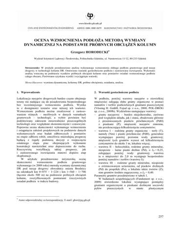 OCENA WZMOCNIENIA PODŁOŻA METODĄ WYMIANY DYNAMICZNEJ NA PODSTAWIE PRÓBNYCH OBCIĄŻEŃ KOLUMN Grzegorz HORODECKI∗ Wydział Inżynierii Lądowej i Środowiska, Politechnika Gdańska, ul. Narutowicza 11/12, 80-233 Gdańsk Streszczenie: W artykule przedstawiono analizę wykonanego wzmocnienia słabego podłoża gruntowego pod nasyp drogowy w technologii kolumn DR. Omówiono warunki geotechniczne podłoża i zastosowane rozwiązania. Wykonano analizę wsteczną na podstawie wyników próbnych obciążeń kolumn oraz pomiarów osiadań wzmocnionego podłoża całego obszaru. Porównano uzyskane wyniki i wyciągnięto wnioski. Słowa kluczowe: wymiana dynamiczna, kolumny DR, próbne obciążenia, osiadania, analiza. 1. Wprowadzenie 2. Warunki geotechniczne podłoża Lokalizacja nasypów drogowych bardzo często obejmuje tereny nie nadające się do posadowienia bezpośredniego bez wcześniejszego wzmocnienia podłoża. Wynika to z dostępności terenów oraz niższej ich wartości. Wzmocnienie podłoża można zrealizować z zastosowaniem różnych – możliwych w danych warunkach gruntowych – technologii, a wybór powinien być podyktowany zakresem stosowalności poszczególnych technologii oraz względami ekonomicznymi i czasowymi. Poprawna ocena skuteczności wykonanego wzmocnienia i osiągnięcia założeń projektowych na podstawie danych wykonawczych oraz badań odbiorczych i pomiarów na etapie odbioru robót, umożliwia miarodajną prognozę będącą z reguły podstawą decyzji o rozpoczęciu ostatniego etapu prac obejmujących wykonanie konstrukcji nawierzchni oraz dopuszczenie do ruchu. Rzeczywistą weryfikację takiej prognozy, jak i zastosowanego rozwiązania stanowi dopiero etap eksploatacji. W artykule przedstawiono inżynierską ocenę skuteczności wzmocnienia podłoża gruntowego wykonanego (w 2009 roku) metodą wymiany dynamicznej DR pod nasyp drogowy obwodnicy miasta Brodnicy na odcinkach km 0+875 ÷ 1+224 i km 1+560 ÷ 1+706 (łącznie około 500 m) na podstawie próbnych obciążeń kolumn, zweryfikowanych pomiarami rzeczywistych osiadań podłoża w trakcie budowy. W podłożu, poniżej warstwy nasypów o niewielkiej miąższości zalegają słabe grunty organiczne w postaci namułów i torfów podścielonych gruntami piaszczystymi (Vössing H. GmbH, Fojud sp. z o.o., 2008; POL-DRÓG sp. z o.o., 2009b). Wydzielono następujące warstwy: − grunty nasypowe – bardzo niejednorodne, zarówno pod względem składu, jak i stanu, zbudowane głównie z przemieszanych piasków próchnicznych (PdH) z piaskami (P); miąższość nasypów zmienna, nie przekraczająca kilkudziesięciu centymetrów; − warstwa I – rodzime grunty organiczne – torfy (T), namuły (Nm) i piaski próchniczne (PdH), generalnie występujące poniżej poziomu wody gruntowej; miąższość tych gruntów wynosi od kilkudziesięciu centymetrów do około 3 m, lokalnie więcej; − warstwa II – holoceńskie, rodzime grunty mineralne, niespoiste – luźne piaski drobne (Pd), o ID = 0,25, zalegające poniżej wody gruntowej; warstwa ta o miąższości do 2,0 m występuje bezpośrednio poniżej namułów i torfów (warstwy I); − warstwa III – rodzime grunty mineralne, niespoiste o zróżnicowanym uziarnieniu, od piasków drobnych (Pd) do pospółek (Po), a lokalnie także żwirów (Ż); stan gruntów średnio zagęszczony, o ID = 0,40. Parametry gruntów przedstawiono w tabeli 1. W badaniach uzupełniających (Fundament sp. z o.o., 2009) stwierdzono lokalnie występujące pomiędzy gruntami organicznymi a piaskami drobnymi soczewki pyłów piaszczystych w stanie plastycznym ∗ Autor odpowiedzialny za korespondencję. E-mail: [email protected] 257 Civil and Environmental Engineering / Budownictwo i Inżynieria Środowiska 4 (2013) 257-263 Tab. 1. Parametry geotechniczne (Vössing H. GmbH, Fojud sp. z o.o., 2008; POL-DRÓG sp. z o.o., 2009b) Nr warstwy Rodzaj gruntu I T, Nm, PdH ID / IL ρ(n) γ’ Φ(n) c (n) M0(n) [t/m3] [kN/m3] [°] [kPa] [MPa] 10,0 10 0,2 1,10 II Pd 0,25 1,70 9 29,2 39,5 III Pd, Po (+Ż) 0,4 1,75 9 30,0 53,0 i miękkoplastycznym o miąższości 0,3-0,9 m. W większości otworów na głębokości 0,9-1,2 m poniżej poziomu terenu nawiercono wodę gruntową, która stabilizowała się na głębokości 0,2-0,3 m poniżej poziomu terenu. 3. Wykonane wzmocnienie Na odcinkach km 0+875 ÷ 1+224 i km 1+560 ÷ 1+706 podłoże gruntowe wzmocniono metodą wymiany dynamicznej DR (Soletanche Polska sp. z o.o., 2009a i b), z zastosowaniem: − rozstawu kolumn w siatce trójkąta równobocznego 5 × 5 × 5 m, − założonej średnicy kolumn − około 2,5 m, − do wykonania kolumn użyto pospółki o zawartości frakcji żwirowej około 20%. Kolumny na odcinku km 1+560 ÷ 1+706 wykonano w okresie od 14-23.07.2009, na odcinku km 0+875 ÷ 1+224 w okresie 28.07-27.08.2009. Miąższość warstw gruntów organicznych na tych odcinkach wynosiła odpowiednio od 1 do 2 m, średnio 1,75 m oraz od 1 do 4 m, średnio 2,5 m. Przeprowadzono dwa próbne obciążenia wykonanych kolumn DR (Piletest sp. z o.o., 2009a i b): w km 1+560 ÷ 1+706 – kolumna numer 105 (rys. 1) oraz w km 0+875 ÷ 1+224 – kolumna numer 111 (rys. 2). Rys. 1. Schemat lokalizacji kolumn, reperów pomiarowych i kolumny próbnej na km 1+560 ÷ 1+706 (POL-DRÓG sp. z o.o., 2009a) 258 Grzegorz HORODECKI Rys. 2. Schemat lokalizacji kolumn, reperów pomiarowych i kolumny próbnej na km 0+875 ÷ 1+220 (POL-DRÓG sp. z o.o., 2009a) Podłoże po wzmocnieniu obciążono nasypem docelowym, zbrojonym jedną, dwoma lub trzema warstwami geotkaniny w zależności od wysokości nasypu, z przyjęciem większej liczby warstw geotkaniny przy wyższym nasypie. Wysokość nasypu na odcinku km 1+560 ÷ 1+706 wynosiła 1,8 ÷ 2,1 m, na odcinku km 0+875 ÷ 1+224 odpowiednio 1,4 ÷ 3,4 m. 4. Pomiary osiadań Po wykonaniu wzmocnienia na podłożu zainstalowano repery wgłębne do pomiarów osiadań (POL-DRÓG sp. z o.o., 2009c). Na odcinku km 1+560 ÷