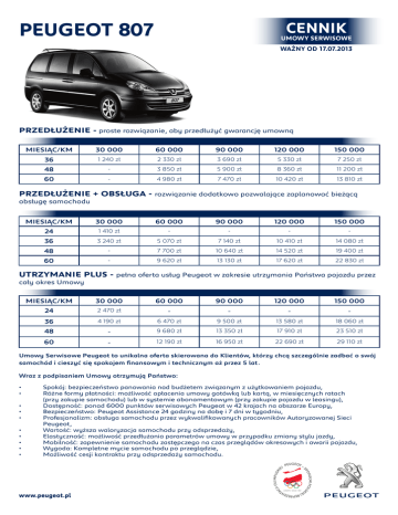 PEUGEOT 807 CENNIK UMOWY SERWISOWE WAŻNY OD 17.07.2013 PRZEDŁUŻENIE - proste rozwiązanie, aby przedłużyć gwarancję umowną MIESIĄC/KM 30 000 60 000 90 000 120 000 150 000 36 1 240 zł 2 330 zł 3 690 zł 5 330 zł 7 250 zł 48 - 3 850 zł 5 900 zł 8 360 zł 11 200 zł 60 - 4 980 zł 7 470 zł 10 420 zł 13 810 zł PRZEDŁUŻENIE + OBSŁUGA - rozwiązanie dodatkowo pozwalające zaplanować bieżącą obsługę samochodu MIESIĄC/KM 30 000 60 000 90 000 120 000 150 000 24 1 410 zł - - - - 36 3 240 zł 5 070 zł 7 140 zł 10 410 zł 14 080 zł 48 - 7 700 zł 10 640 zł 14 520 zł 19 400 zł 60 - 9 620 zł 13 130 zł 17 620 zł 22 830 zł UTRZYMANIE PLUS - pełna oferta usług Peugeot w zakresie utrzymania Państwa pojazdu przez cały okres Umowy MIESIĄC/KM 30 000 60 000 90 000 120 000 150 000 24 2 470 zł - - - - 36 4 190 zł 6 470 zł 9 500 zł 13 580 zł 18 060 zł 48 - 9 680 zł 13 350 zł 17 910 zł 23 510 zł 12 190 zł 16 950 zł 22 690 zł 29 110 zł 60 Umowy Serwisowe Peugeot to unikalna oferta skierowana do Klientów, którzy chcą szczególnie zadbać o swój samochód i cieszyć się spokojem finansowym i technicznym aż przez 5 lat. Wraz z podpisaniem Umowy otrzymują Państwo: • • • • • • • • • • Spokój: bezpieczeństwo panowania nad budżetem związanym z użytkowaniem pojazdu, Różne formy płatności: możliwość opłacenia umowy gotówką lub kartą, w miesięcznych ratach (przy zakupie samochodu) lub w systemie abonamentowym (przy zakupie pojazdu w leasingu), Dostępność: ponad 6000 punktów serwisowych Peugeot w 42 krajach na obszarze Europy, Bezpieczeństwo: Peugeot Assistance 24 godziny na dobę i 7 dni w tygodniu, Profesjonalizm: obsługa samochodu przez wykwalifikowanych pracowników Autoryzowanej Sieci Peugeot, Wartość: wyższa waloryzacja samochodu przy odsprzedaży, Elastyczność: możliwość przedłużania parametrów umowy w przypadku zmiany stylu jazdy, Mobilność: zapewnienie samochodu zastępczego na czas przeglądów okresowych i awarii pojazdu, Wygoda: Kompletne mycie samochodu po przeglądzie, Możliwość cesji kontraktu przy odsprzedaży samochodu. www.peugeot.pl