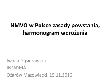 NMVO w Polsce zasady powstania, harmonogram wdrożenia Iwona Gąsiorowska INFARMA Ożarów Mazowiecki, 15.11.2016 System EMVO + NMVO Interesariusze systemu Terminy Status krajów w UE Status w PL PL na tle EU Status w UE – rozwiązanie blue print EU z poziomu EFPIA Dlaczego PL ma status „late follower” • W lutym’16 byliśmy jednym z pierwszych krajów w Europie, który uzyskał porozumienie MAHów reprezentujących 85% rynku, przygotował i podpisał statut i ustanowił fundację (akt notarialny), uzyskując przy tym oficjalne wsparcie MZ • W maju’16 została zarejestrowana fundacja NMVO • W czerwcu’16 – wpłynęło zażalenie Naczelnej Izby Aptekarskiej Wyzwania… • Charakterystyka organizacji zrzeszających MAHów, w tym podwójnego członkostwa • Charakterystyka organizacji zrzeszających pracodawców aptecznych i farmaceutów • Brak ostatecznych postanowień dotyczących charakteru udziału farmaceutów i hurtowników • Wszystkie obecne organizacje zadeklarowały chęć wdrożenia blueprintu w Polsce, bez określania szczegółów rozumienia tego pojęcia • Nie ma ostatecznych ustaleń dotyczących jaka forma prawna organizacji zostanie wybrana przez jej członków oraz dotyczących modelu finansowania