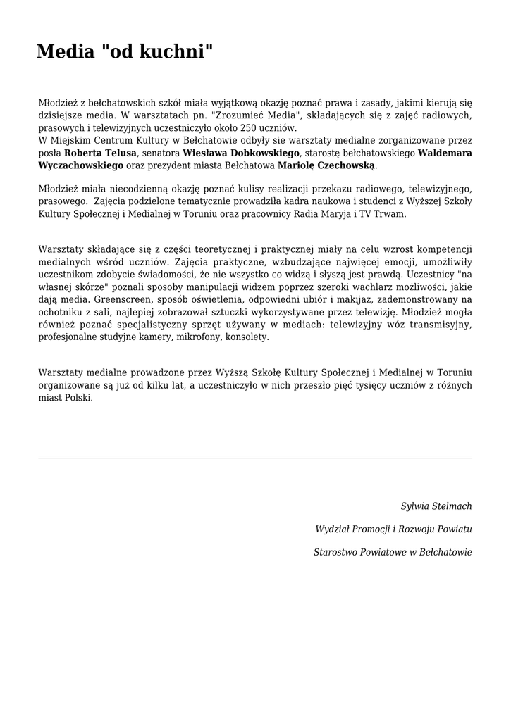 Media "od kuchni" Młodzież z bełchatowskich szkół miała wyjątkową okazję poznać prawa i zasady, jakimi kierują się dzisiejsze media. W warsztatach pn. "Zrozumieć Media", składających się z zajęć radiowych, prasowych i telewizyjnych uczestniczyło około 250 uczniów. W Miejskim Centrum Kultury w Bełchatowie odbyły sie warsztaty medialne zorganizowane przez posła Roberta Telusa, senatora Wiesława Dobkowskiego, starostę bełchatowskiego Waldemara Wyczachowskiego oraz prezydent miasta Bełchatowa Mariolę Czechowską. Młodzież miała niecodzienną okazję poznać kulisy realizacji przekazu radiowego, telewizyjnego, prasowego. Zajęcia podzielone tematycznie prowadziła kadra naukowa i studenci z Wyższej Szkoły Kultury Społecznej i Medialnej w Toruniu oraz pracownicy Radia Maryja i TV Trwam. Warsztaty składające się z części teoretycznej i praktycznej miały na celu wzrost kompetencji medialnych wśród uczniów. Zajęcia praktyczne, wzbudzające najwięcej emocji, umożliwiły uczestnikom zdobycie świadomości, że nie wszystko co widzą i słyszą jest prawdą. Uczestnicy "na własnej skórze" poznali sposoby manipulacji widzem poprzez szeroki wachlarz możliwości, jakie dają media. Greenscreen, sposób oświetlenia, odpowiedni ubiór i makijaż, zademonstrowany na ochotniku z sali, najlepiej zobrazował sztuczki wykorzystywane przez telewizję. Młodzież mogła również poznać specjalistyczny sprzęt używany w mediach: telewizyjny wóz transmisyjny, profesjonalne studyjne kamery, mikrofony, konsolety. Warsztaty medialne prowadzone przez Wyższą Szkołę Kultury Społecznej i Medialnej w Toruniu organizowane są już od kilku lat, a uczestniczyło w nich przeszło pięć tysięcy uczniów z różnych miast Polski. Sylwia Stelmach Wydział Promocji i Rozwoju Powiatu Starostwo Powiatowe w Bełchatowie