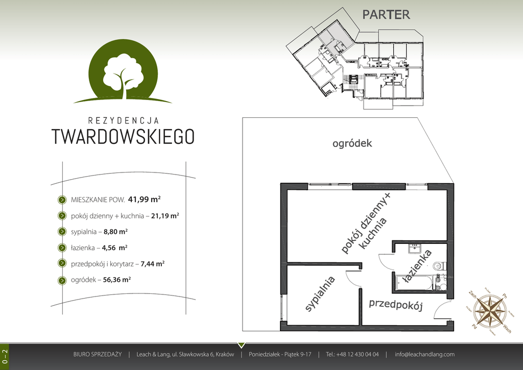 0–2 l MIESZKANIE POW. 41,99 m2 l pokój dzienny + kuchnia – 21,19 m2 l sypialnia – 8,80 m2 l łazienka – 4,56 m2 l przedpokój i korytarz – 7,44 m2 l ogródek – 56,36 m2 Biuro Sprzedaży | Leach & Lang, ul. Sławkowska 6, Kraków | Poniedziałek - Piątek 9-17 | Tel.: +48 12 430 04 04 | [email protected]