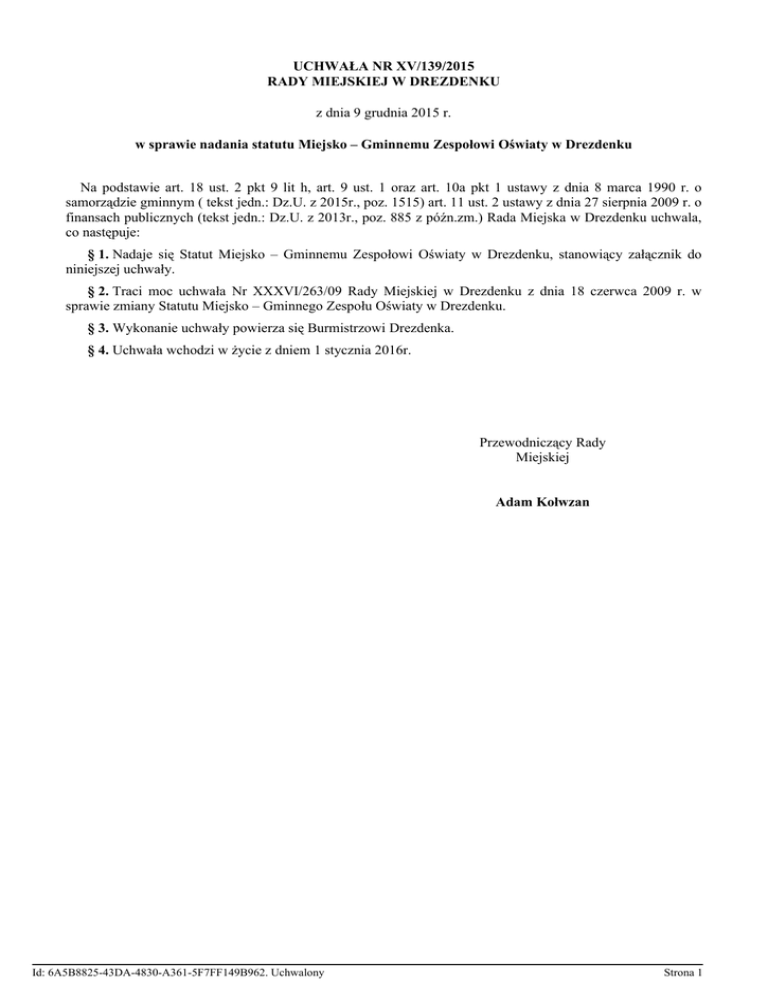 UCHWAŁA NR XV/139/2015 RADY MIEJSKIEJ W DREZDENKU z dnia 9 grudnia 2015 r. w sprawie nadania statutu Miejsko – Gminnemu Zespołowi Oświaty w Drezdenku Na podstawie art. 18 ust. 2 pkt 9 lit h, art. 9 ust. 1 oraz art. 10a pkt 1 ustawy z dnia 8 marca 1990 r. o samorządzie gminnym ( tekst jedn.: Dz.U. z 2015r., poz. 1515) art. 11 ust. 2 ustawy z dnia 27 sierpnia 2009 r. o finansach publicznych (tekst jedn.: Dz.U. z 2013r., poz. 885 z późn.zm.) Rada Miejska w Drezdenku uchwala, co następuje: § 1. Nadaje się Statut Miejsko – Gminnemu Zespołowi Oświaty w Drezdenku, stanowiący załącznik do niniejszej uchwały. § 2. Traci moc uchwała Nr XXXVI/263/09 Rady Miejskiej w Drezdenku z dnia 18 czerwca 2009 r. w sprawie zmiany Statutu Miejsko – Gminnego Zespołu Oświaty w Drezdenku. § 3. Wykonanie uchwały powierza się Burmistrzowi Drezdenka. § 4. Uchwała wchodzi w życie z dniem 1 stycznia 2016r. Przewodniczący Rady Miejskiej Adam Kołwzan Id: 6A5B8825-43DA-4830-A361-5F7FF149B962. Uchwalony Strona 1 Załącznik do Uchwały Nr XV/139/2015 Rady Miejskiej w Drezdenku z dnia 9 grudnia 2015 r. Rozdział 1. Postanowienia ogólne § 1. Miejsko – Gminny Zespół Oświaty w Drezdenku zwany dalej „Zespołem”, jest gminną jednostką organizacyjną. § 2. Zespół działa w szczególności na podstawie: 1) ustawy z dnia 8 marca 1990 r. o samorządzie gminnym (tekst jedn.: Dz. U. z 2015r., poz. 1515 z późn.zm.); 2) ustawy z dnia 7 września 1991 r. o systemie oświaty (tekst jedn.: Dz. U. z 2004 r. Nr 256, poz. 2572 z późn.zm.); 3) ustawy z dnia 27 sierpnia 2009r. o finansach publicznych (tekst jedn.: Dz. U. z 2013r., poz. 885 z późn.zm.); 4) ustawy z dnia 26 stycznia 1982 r. Karta Nauczyciela (tekst jedn.: Dz. U. z. 2014r., poz. 191 z późn.zm.); 5) ustawy z dnia 21 listopada 2008 Dz. U. z 2014r., poz. 1202 z późn.zm.); r. o pracownikach samorządowych (tekst jedn.: 6) ustawy z dnia 29 września 1994 r. o rachunkowości (tekst jedn.: Dz. U. z 2013 r., poz. 330 z późn.zm.); 7) niniejszego Statutu. § 3. Ilekroć w niniejszym Statucie mowa o: 1) Zespole należy przez to rozumieć jednostkę obsługującą tj. Miejsko – Gminny Zespół Oświaty w Drezdenku; 2) placówkach oświatowych należy przez to rozumieć jednostki obsługiwane tj.: a) Zespół Szkół im. H. Sienkiewicza w Drezdenku, ul. Portowa 1, 66-530 Drezdenko w skład którego wchodzą: - Szkoła Podstawowa Nr 3 w Drezdenku, - Gimnazjum Nr 2 w Drezdenku, b) Gimnazjum nr 1 im. Józefa Nojiego w Drezdenku, plac Wolności 8, 66-530 Drezdenko, c) Szkołę Podstawową nr 1 w Drezdenku, ul. Szkolna 11, 66 - 530 Drezdenko, d) Szkołę Podstawową w Drawinach, Drawiny 62, 66 - 530 Drezdenko, e) Szkołę Podstawową w Grotowie, Grotów 88, 66 - 530 Drezdenko, f) Szkołę Podstawową w Goszczanowie, Goszczanowo 18a, 66-530 Drezdenko, g) Szkołę Podstawową w Gościmiu, Gościm 141, 66-530 Drezdenko, h) Szkołę Podstawową w Niegosławiu, Niegosław 69, 66 - 530 Drezdenko, i) Szkołę Podstawową w Rąpinie, Rąpin 54,66 - 530 Drezdenko, j) Szkołę Podstawową w Starych Bielicach, Stare Bielice 13, 66 - 530 Drezdenko, k) Szkołę Podstawową w Trzebiczu, ul. Szkolna 1, 66-530 Drezdenko, l) Publiczne Przedszkole w Drezdenku, ul. Kopernika 16, 66-530 Drezdenko; 3) dyrektorze Zespołu należy przez to rozumieć kierownika jednostki obsługującej; 4) dyrektorze placówki oświatowej należy przez to rozumieć kierownika jednostki obsługiwanej. § 4. 1. Zespół jest jednostką budżetową Gminy Drezdenko, zapewniającą wspólną obsługę placówkom oświatowym prowadzonym przez Gminę Drezdenko. Id: 6A5B8825-43DA-4830-A361-5F7FF149B962. Uchwalony Strona 1 2. Zespół realizuje zadania własne i zlecone gminy w ramach oświaty poprzez obsługę finansową, rachunkową, prawną oraz administracyjno – organizacyjną placówek oświatowych. 3. Obszarem działania Zespołu jest obszar Gminy Drezdenko. 4. Siedzibą Zespołu jest budynek Miejsko – Gminnego Zespołu Oświaty w Drezdenku, znajdujący się przy ul. Ogrodowej 1. 5. Zespół używa pieczęci podłużnej o następującej treści: Miejsko–Gminny Zespół Oświaty ul. Ogrodowa 1, 66-530 Drezdenko 6. Zespół używa skrótu o następującej treści: MGZO. Rozdział 2. Przedmiot i zakres działania Zespołu § 5. Do podstawowych zadań Zespołu należy: 1) prowadzenie obsługi finansowej placówek oświatowych, a w szczególności: a) prowadzenie obsługi rachunków bankowych, b) prowadzenie kasy, c) opracowywanie na wniosek kierowników jednostek obsługiwanych planów finansowych i ich zmian, d) bieżący nadzór nad realizacją planu finansowego, e) bieżąca informacja o sytuacji finansowej i realizacji budżetu, f) sporządzanie list płac, g) dokonywanie wypłat wynagrodzeń oraz naliczanie i odprowadzanie związanych z tym świadczeń obligatoryjnych na rzecz ZUS itp., h) ewidencjonowanie danych o zatrudnieniu i wynagrodzeniach, i) rozliczanie średniego wynagrodzenia nauczycieli zgodnie z art.30a Karta Nauczyciela, j) sporządzanie sprawozdań budżetowych, sprawozdań w zakresie operacji finansowych, sprawozdań finansowych i innych wymaganych przepisami prawa; 2) prowadzenie obsługi rachunkowej placówek oświatowych, a w szczególności: a) określenie zasad (polityki) rachunkowości, b) przeprowadzenie inwentaryzacji aktywów i pasywów jednostek obsługiwanych, c) prowadzenie, na podstawie dowodów księgowych, ksiąg rachunkowych, ujmujących zapisy zdarzeń w porządku chronologicznym i systematycznym, d) gromadzenie i przechowywanie dowodów księgowych oraz pozostałej dokumentacji przewidzianej ustawą, e) prowadzenie ewidencji składników majątkowych; 3) obsługa prawna placówek oświatowych; 4) prowadzenie obsługi administracyjno-organizacyjnej placówek oświatowych, w szczególności: a) prowadzenie zasobów archiwalnych, b) prowadzenie teczek osobowych dyrektorów placówek oświatowych oraz pracowników Zespołu, c) prowadzenie spraw