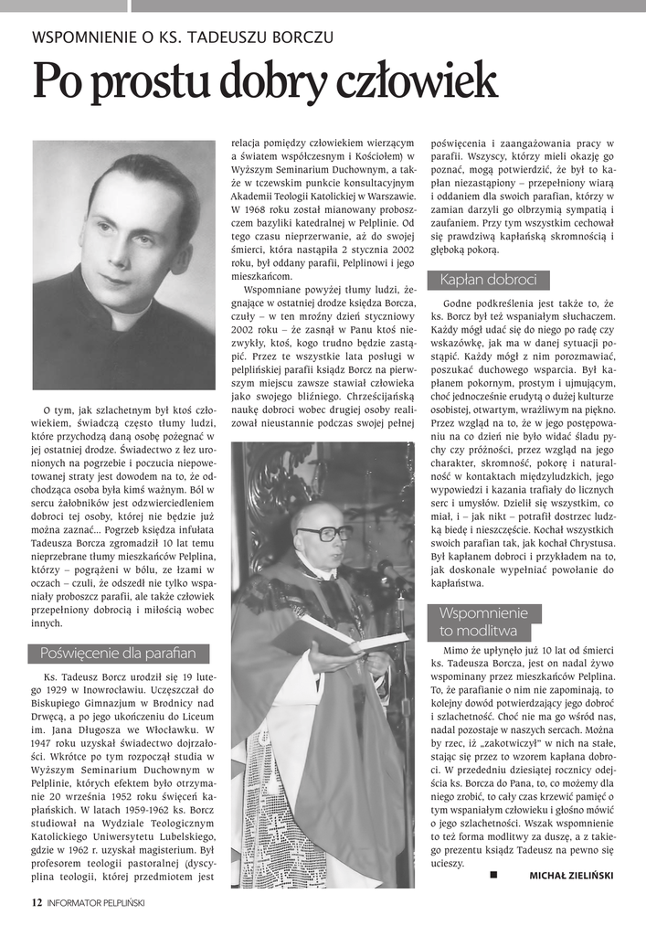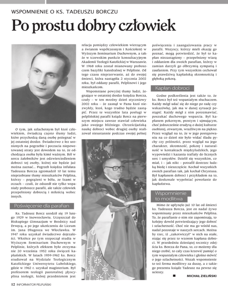 Wspomnienie o ks. Tadeuszu Borczu Po prostu dobry człowiek O tym, jak szlachetnym był ktoś człowiekiem, świadczą często tłumy ludzi, które przychodzą daną osobę pożegnać w jej ostatniej drodze. Świadectwo z łez uronionych na pogrzebie i poczucia niepowetowanej straty jest dowodem na to, że odchodząca osoba była kimś ważnym. Ból w sercu żałobników jest odzwierciedleniem dobroci tej osoby, której nie będzie już można zaznać... Pogrzeb księdza infułata Tadeusza Borcza zgromadził 10 lat temu nieprzebrane tłumy mieszkańców Pelplina, którzy – pogrążeni w bólu, ze łzami w oczach – czuli, że odszedł nie tylko wspaniały proboszcz parafii, ale także człowiek przepełniony dobrocią i miłością wobec innych. Poświęcenie dla parafian Ks. Tadeusz Borcz urodził się 19 lutego 1929 w Inowrocławiu. Uczęszczał do Biskupiego Gimnazjum w Brodnicy nad Drwęcą, a po jego ukończeniu do Liceum im. Jana Długosza we Włocławku. W 1947 roku uzyskał świadectwo dojrzałości. Wkrótce po tym rozpoczął studia w Wyższym Seminarium Duchownym w Pelplinie, których efektem było otrzymanie 20 września 1952 roku święceń kapłańskich. W latach 1959-1962 ks. Borcz studiował na Wydziale Teologicznym Katolickiego Uniwersytetu Lubelskiego, gdzie w 1962 r. uzyskał magisterium. Był profesorem teologii pastoralnej (dyscyplina teologii, której przedmiotem jest 12 INFORMATOR PELPLIŃSKI relacja pomiędzy człowiekiem wierzącym a światem współczesnym i Kościołem) w Wyższym Seminarium Duchownym, a także w tczewskim punkcie konsultacyjnym Akademii Teologii Katolickiej w Warszawie. W 1968 roku został mianowany proboszczem bazyliki katedralnej w Pelplinie. Od tego czasu nieprzerwanie, aż do swojej śmierci, która nastąpiła 2 stycznia 2002 roku, był oddany parafii, Pelplinowi i jego mieszkańcom. Wspomniane powyżej tłumy ludzi, żegnające w ostatniej drodze księdza Borcza, czuły – w ten mroźny dzień styczniowy 2002 roku – że zasnął w Panu ktoś niezwykły, ktoś, kogo trudno będzie zastąpić. Przez te wszystkie lata posługi w pelplińskiej parafii ksiądz Borcz na pierwszym miejscu zawsze stawiał człowieka jako swojego bliźniego. Chrześcijańską naukę dobroci wobec drugiej osoby realizował nieustannie podczas swojej pełnej poświęcenia i zaangażowania pracy w parafii. Wszyscy, którzy mieli okazję go poznać, mogą potwierdzić, że był to kapłan niezastąpiony – przepełniony wiarą i oddaniem dla swoich parafian, którzy w zamian darzyli go olbrzymią sympatią i zaufaniem. Przy tym wszystkim cechował się prawdziwą kapłańską skromnością i głęboką pokorą. kapłan dobroci Godne podkreślenia jest także to, że ks. Borcz był też wspaniałym słuchaczem. Każdy mógł udać się do niego po radę czy wskazówkę, jak ma w danej sytuacji postąpić. Każdy mógł z nim porozmawiać, poszukać duchowego wsparcia. Był kapłanem pokornym, prostym i ujmującym, choć jednocześnie erudytą o dużej kulturze osobistej, otwartym, wrażliwym na piękno. Przez wzgląd na to, że w jego postępowaniu na co dzień nie było widać śladu pychy czy próżności, przez wzgląd na jego charakter, skromność, pokorę i naturalność w kontaktach międzyludzkich, jego wypowiedzi i kazania trafiały do licznych serc i umysłów. Dzielił się wszystkim, co miał, i – jak nikt – potrafił dostrzec ludzką biedę i nieszczęście. Kochał wszystkich swoich parafian tak, jak kochał Chrystusa. Był kapłanem dobroci i przykładem na to, jak doskonale wypełniać powołanie do kapłaństwa. wspomnienie to modlitwa Mimo że upłynęło już 10 lat od śmierci ks. Tadeusza Borcza, jest on nadal żywo wspominany przez mieszkańców Pelplina. To, że parafianie o nim nie zapominają, to kolejny dowód potwierdzający jego dobroć i szlachetność. Choć nie ma go wśród nas, nadal pozostaje w naszych sercach. Można by rzec, iż „zakotwiczył” w nich na stałe, stając się przez to wzorem kapłana dobroci. W przededniu dziesiątej rocznicy odejścia ks. Borcza do Pana, to, co możemy dla niego zrobić, to cały czas krzewić pamięć o tym wspaniałym człowieku i głośno mówić o jego szlachetności. Wszak wspomnienie to też forma modlitwy za duszę, a z takiego prezentu ksiądz Tadeusz na pewno się ucieszy. MiChał zielińSki