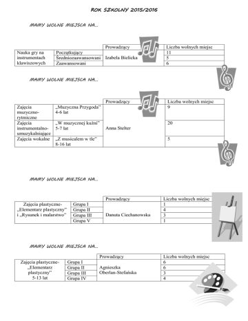 ROK SZKOLNY 2015/2016 MAMY WOLNE MIEJSCA NA… Prowadzący Nauka gry na instrumentach klawiszowych Początkujący Średniozaawansowani Izabela Bielicka Zaawansowani Liczba wolnych miejsc 11 5 6 MAMY WOLNE MIEJSCA NA… Prowadzący Zajęcia muzycznorytmiczne Zajęcia instrumentalnoumuzykalniające Zajęcia wokalne „Muzyczna Przygoda” 4-6 lat „W muzycznej kuźni” 5-7 lat Liczba wolnych miejsc 9 20 Anna Stelter „Z musicalem w tle” 8-16 lat 5 MAMY WOLNE MIEJSCA NA… Prowadzący Zajęcia plastyczne„Elementarz plastyczny” i „Rysunek i malarstwo” Grupa I Grupa II Grupa III Grupa V Danuta Ciechanowska Liczba wolnych miejsc 1 4 3 1 MAMY WOLNE MIEJSCA NA… Prowadzący Zajęcia plastyczne„Elementarz plastyczny” 5-13 lat Grupa I Grupa II Grupa III Grupa IV Agnieszka Oberlan-Stefańska Liczba wolnych miejsc 6 6 3 4 ROK SZKOLNY 2015/2016 MAMY WOLNE MIEJSCA NA… Prowadzący Zajęcia baletowe 4 - 6 lat Liczba wolnych miejsc 12 Grupa I Marta Pańka Grupa II 12 MAMY WOLNE MIEJSCA NA… Zajęcia plastycznotaneczne „Maluj i Tańcz” 5-6 lat 6-7 lat Prowadzący Agnieszka Oberlan-Stefańska i Marta Pańka Liczba wolnych miejsc 24 12 Prowadzący Liczba wolnych miejsc Justyna Popławska 20 MAMY WOLNE MIEJSCA NA… Zespół „Puenta” 7-12 lat Grupa V MAMY WOLNE MIEJSCA NA… Prowadzący Zajęcia szachowe Grupa I Grupa II Grupa IV Grupa V Grupa VI Grupa VII Grupa VIII Grupa IX Paweł Pawłowski Liczba wolnych miejsc 3 3 8 6 7 7 6 1 ROK SZKOLNY 2015/2016 MAMY WOLNE MIEJSCA NA… Prowadzący C++ Robotyka początkujący Robotyka zaawansowana Multimedia www Jadwiga Roguska Liczba wolnych miejsc 7 17 4 8 8 MAMY WOLNE MIEJSCA NA… Prowadzący Twórcza Akademia Małolata „Iskierka” Zajęcia plastycznozabawowe 3-4 lata Zajęcia twórcze 5-8 lat Laboratorium artystyczne 9-13 lat Liczba wolnych miejsc 30 13 Magdalena Noga 14