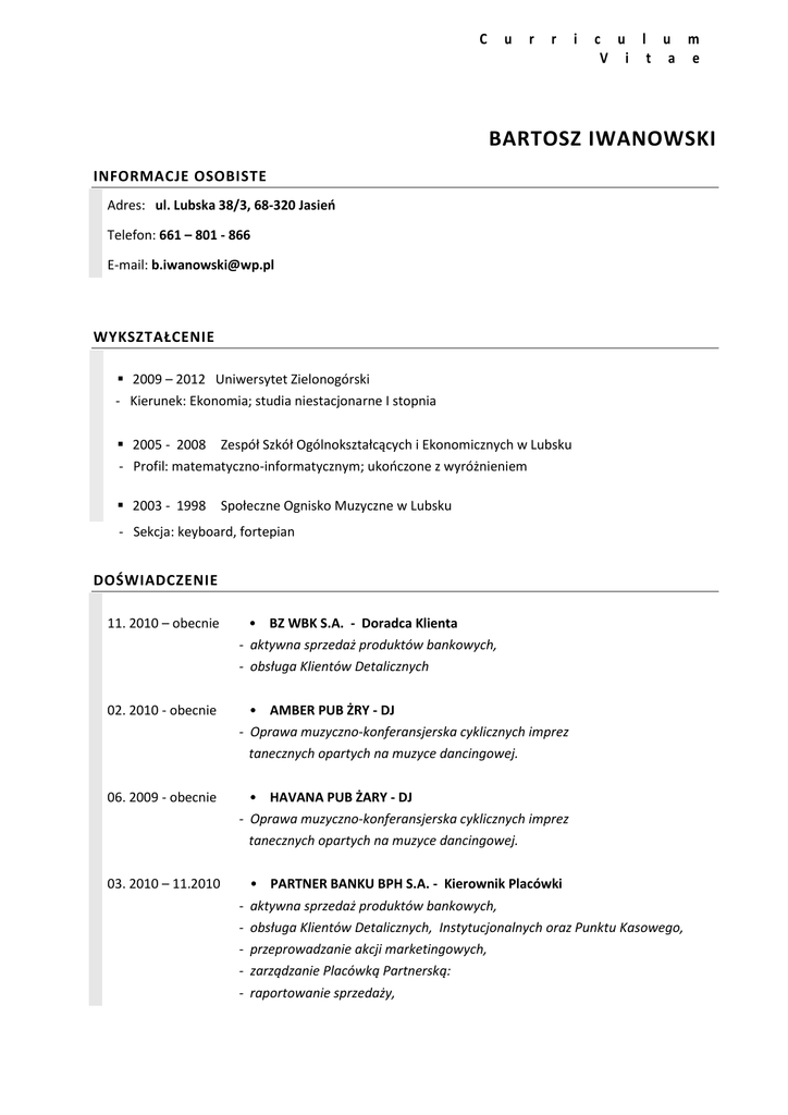 C u r r i c u l u m V i t a e BARTOSZ IWANOWSKI INFORMACJE OSOBISTE Adres: ul. Lubska 38/3, 68-320 Jasień Telefon: 661 – 801 - 866 E-mail: [email protected] WYKSZTAŁCENIE 2009 – 2012 Uniwersytet Zielonogórski - Kierunek: Ekonomia; studia niestacjonarne I stopnia 2005 - 2008 Zespół Szkół Ogólnokształcących i Ekonomicznych w Lubsku - Profil: matematyczno-informatycznym; ukooczone z wyróżnieniem 2003 - 1998 Społeczne Ognisko Muzyczne w Lubsku - Sekcja: keyboard, fortepian DOŚWIADCZENIE 11. 2010 – obecnie • BZ WBK S.A. - Doradca Klienta - aktywna sprzedaż produktów bankowych, - obsługa Klientów Detalicznych 02. 2010 - obecnie • AMBER PUB ŻRY - DJ - Oprawa muzyczno-konferansjerska cyklicznych imprez tanecznych opartych na muzyce dancingowej. 06. 2009 - obecnie • HAVANA PUB ŻARY - DJ - Oprawa muzyczno-konferansjerska cyklicznych imprez tanecznych opartych na muzyce dancingowej. 03. 2010 – 11.2010 - • PARTNER BANKU BPH S.A. - Kierownik Placówki aktywna sprzedaż produktów bankowych, obsługa Klientów Detalicznych, Instytucjonalnych oraz Punktu Kasowego, przeprowadzanie akcji marketingowych, zarządzanie Placówką Partnerską: raportowanie sprzedaży, 03.2009 - 03.2010 • BIURO KREDYTOWE LUKAS BANK S.A. – Doradca Klienta - aktywna sprzedaż kredytów gotówkowych i kart kredytowych, - obsługa Klientów Detalicznych, - obsługa Punktu Kasowego, - przeprowadzanie akcji marketingowych, - dbałośd o odpowiedni wizerunek placówki, - raportowanie sprzedaży, - telemarketing. 10. 2008 - 03.2009 • MAGNOLIA SP. Z O.O. W LUBSKU – Staż (pracownik biurowy) - obsługa poczty przychodzącej i wychodzącej, - segregacja i archiwizacja faktur: - klasyfikowanie dokumentacji zgodnie z numeracją, - sprawdzanie poprawności dokumentów. JĘZYK J. angielski: w mowie i piśmie - średniozaawansowany DODATKOWE INFORMACJE Uprawnienia do sprzedaży produktów: Bank BPH S.A., LUKAS Bank S.A., Euro Bank S.A.; Ukooczone szkolenia : „Nowoczesne metody rozpoznawania autentyczności dokumentów publicznych”; szkolenia sprzedaży bezpośredniej, szkolenia z zakresu autopromocji – (wystąpienia publiczne oraz organizacja prezentacji poza Oddziałem Banku) Prawo jazdy kategorii B; Biegła znajomośd obsługi komputera: - oprogramowanie: System Windows, MS Office, Internet, programy do obróbki grafiki i dźwięku; - biegła pisownia na klawiaturze (ok. 340 znaków/minutę). Niniejszy dokument jest skróconą wersją Curriculum Vitae, ponieważ sporządzono go w celu autopromocji w związku z ofertą współpracy przy organizacji imprez tanecznych. Z poważaniem,