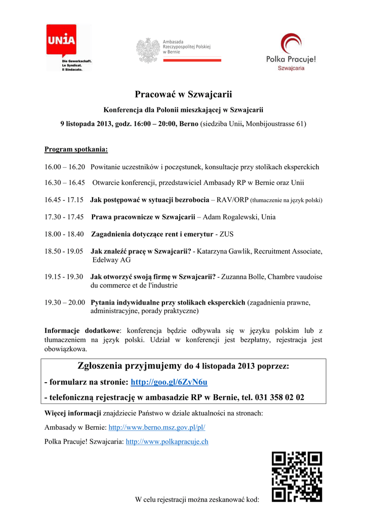 Pracować w Szwajcarii Konferencja dla Polonii mieszkającej w Szwajcarii 9 listopada 2013, godz. 16:00 – 20:00, Berno (siedziba Unii, Monbijoustrasse 61) Program spotkania: 16.00 – 16.20 Powitanie uczestników i poczęstunek, konsultacje przy stolikach eksperckich 16.30 – 16.45 Otwarcie konferencji, przedstawiciel Ambasady RP w Bernie oraz Unii 16.45 - 17.15 Jak postępować w sytuacji bezrobocia – RAV/ORP (tłumaczenie na język polski) 17.30 - 17.45 Prawa pracownicze w Szwajcarii – Adam Rogalewski, Unia 18.00 - 18.40 Zagadnienia dotyczące rent i emerytur - ZUS 18.50 - 19.05 Jak znaleźć pracę w Szwajcarii? - Katarzyna Gawlik, Recruitment Associate, Edelway AG 19.15 - 19.30 Jak otworzyć swoją firmę w Szwajcarii? - Zuzanna Bolle, Chambre vaudoise du commerce et de l'industrie 19.30 – 20.00 Pytania indywidualne przy stolikach eksperckich (zagadnienia prawne, administracyjne, porady praktyczne) Informacje dodatkowe: konferencja będzie odbywała się w języku polskim lub z tłumaczeniem na język polski. Udział w konferencji jest bezpłatny, rejestracja jest obowiązkowa. Zgłoszenia przyjmujemy do 4 listopada 2013 poprzez: - formularz na stronie: http://goo.gl/6ZyN6u - telefoniczną rejestrację w ambasadzie RP w Bernie, tel. 031 358 02 02 Więcej informacji znajdziecie Państwo w dziale aktualności na stronach: Ambasady w Bernie: http://www.berno.msz.gov.pl/pl/ Polka Pracuje! Szwajcaria: http://www.polkapracuje.ch W celu rejestracji można zeskanować kod: