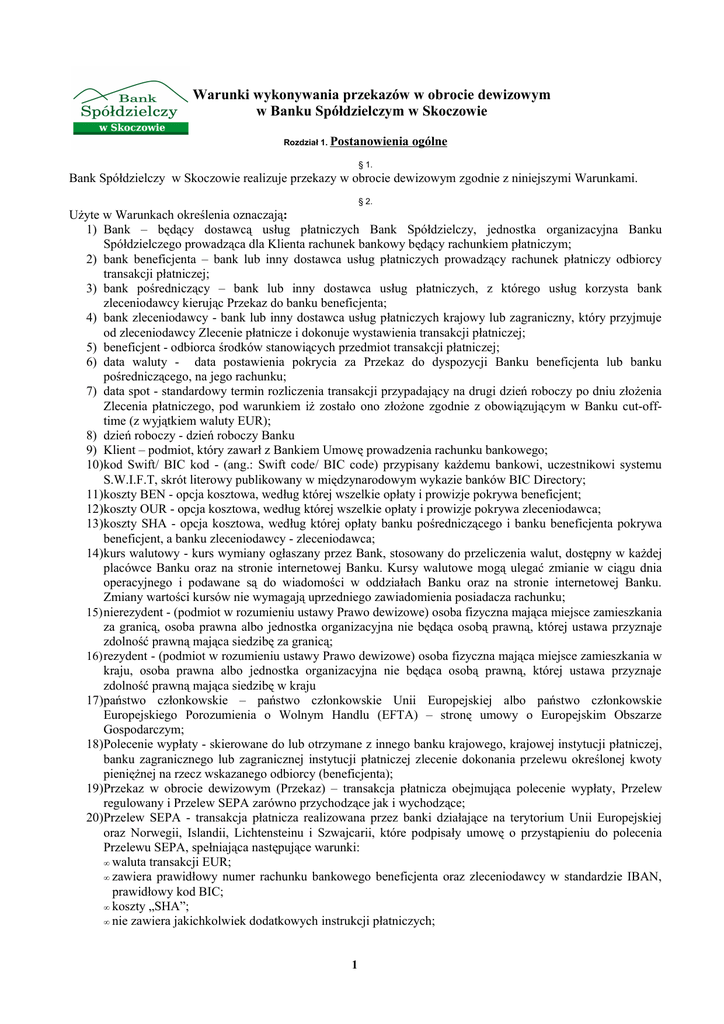 Warunki wykonywania przekazów w obrocie dewizowym w Banku Spółdzielczym w Skoczowie Rozdział 1. Postanowienia ogólne § 1. Bank Spółdzielczy w Skoczowie realizuje przekazy w obrocie dewizowym zgodnie z niniejszymi Warunkami. § 2. Użyte w Warunkach określenia oznaczają: 1) Bank – będący dostawcą usług płatniczych Bank Spółdzielczy, jednostka organizacyjna Banku Spółdzielczego prowadząca dla Klienta rachunek bankowy będący rachunkiem płatniczym; 2) bank beneficjenta – bank lub inny dostawca usług płatniczych prowadzący rachunek płatniczy odbiorcy transakcji płatniczej; 3) bank pośredniczący – bank lub inny dostawca usług płatniczych, z którego usług korzysta bank zleceniodawcy kierując Przekaz do banku beneficjenta; 4) bank zleceniodawcy - bank lub inny dostawca usług płatniczych krajowy lub zagraniczny, który przyjmuje od zleceniodawcy Zlecenie płatnicze i dokonuje wystawienia transakcji płatniczej; 5) beneficjent - odbiorca środków stanowiących przedmiot transakcji płatniczej; 6) data waluty - data postawienia pokrycia za Przekaz do dyspozycji Banku beneficjenta lub banku pośredniczącego, na jego rachunku; 7) data spot - standardowy termin rozliczenia transakcji przypadający na drugi dzień roboczy po dniu złożenia Zlecenia płatniczego, pod warunkiem iż zostało ono złożone zgodnie z obowiązującym w Banku cut-offtime (z wyjątkiem waluty EUR); 8) dzień roboczy - dzień roboczy Banku 9) Klient – podmiot, który zawarł z Bankiem Umowę prowadzenia rachunku bankowego; 10)kod Swift/ BIC kod - (ang.: Swift code/ BIC code) przypisany każdemu bankowi, uczestnikowi systemu S.W.I.F.T, skrót literowy publikowany w międzynarodowym wykazie banków BIC Directory; 11)koszty BEN - opcja kosztowa, według której wszelkie opłaty i prowizje pokrywa beneficjent; 12)koszty OUR - opcja kosztowa, według której wszelkie opłaty i prowizje pokrywa zleceniodawca; 13)koszty SHA - opcja kosztowa, według której opłaty banku pośredniczącego i banku beneficjenta pokrywa beneficjent, a banku zleceniodawcy - zleceniodawca; 14)kurs walutowy - kurs wymiany ogłaszany przez Bank, stosowany do przeliczenia walut, dostępny w każdej placówce Banku oraz na stronie internetowej Banku. Kursy walutowe mogą ulegać zmianie w ciągu dnia operacyjnego i podawane są do wiadomości w oddziałach Banku oraz na stronie internetowej Banku. Zmiany wartości kursów nie wymagają uprzedniego zawiadomienia posiadacza rachunku; 15) nierezydent - (podmiot w rozumieniu ustawy Prawo dewizowe) osoba fizyczna mająca miejsce zamieszkania za granicą, osoba prawna albo jednostka organizacyjna nie będąca osobą prawną, której ustawa przyznaje zdolność prawną mająca siedzibę za granicą; 16) rezydent - (podmiot w rozumieniu ustawy Prawo dewizowe) osoba fizyczna mająca miejsce zamieszkania w kraju, osoba prawna albo jednostka organizacyjna nie będąca osobą prawną, której ustawa przyznaje zdolność prawną mająca siedzibę w kraju 17)państwo członkowskie – państwo członkowskie Unii Europejskiej albo państwo członkowskie Europejskiego Porozumienia o Wolnym Handlu (EFTA) – stronę umowy o Europejskim Obszarze Gospodarczym; 18)Polecenie wypłaty - skierowane do lub otrzymane z innego banku krajowego, krajowej instytucji płatniczej, banku zagranicznego lub zagranicznej instytucji płatniczej zlecenie dokonania przelewu określonej kwoty pieniężnej na rzecz wskazanego odbiorcy (beneficjenta); 19)Przekaz w obrocie dewizowym (Przekaz) – transakcja płatnicza obejmująca polecenie wypłaty, Przelew regulowany i Przelew SEPA zarówno przychodzące jak i wychodzące; 20)Przelew SEPA - transakcja płatnicza realizowana przez banki działające na terytorium Unii Europejskiej oraz Norwegii, Islandii, Lichtensteinu i Szwajcarii, które podpisały umowę o przystąpieniu do polecenia Przelewu SEPA, spełniająca następujące warunki: • waluta transakcji EUR; • zawiera prawidłowy numer rachunku bankowego beneficjenta oraz zleceniodawcy w standardzie IBAN, prawidłowy kod BIC; • koszty „SHA”; • nie zawiera jakichkolwiek dodatkowych instrukcji płatniczych; 1 Bank zleceniodawcy i bank beneficjenta przelewu są uczestnikami Polecenia Przelewu SEPA - SCT (SEPA Credit Transfer). Link do wykazu banków SEPA jest dostępny na stronie internetowej Banku. 21)Przelew regulowany - transakcja płatnicza realizowana przez banki działające na terytorium Unii Europejskiej oraz Norwegii, Islandii, Lichtensteinu, spełniająca następujące warunki: • waluta transakcji EUR; • kwota transakcji mniejsza lub równa EUR 50.000; • zawiera prawidłowy numer rachunku bankowego beneficjenta oraz zleceniodawcy w standardzie IBAN, prawidłowy kod BIC; • koszty „SHA”; 22)przepisy dewizowe- ustawa Prawo dewizowe wraz z przepisami wykonawczymi wydanymi w jej ramach i na jej podstawie oraz przepisy prawa o podobnym charakterze obowiązujące w krajach członkowskich UE; 23)strona internetowa Banku – www.bs.skoczow.pl. 24)Taryfa opłat – obowiązująca w Banku Taryfa opłat i prowizji bankowych dla Klientów; 25)transakcja płatnicza – zainicjowana przez Klienta wpłata, transfer lub wypłata środków pieniężnych obejmująca również Przekaz; 26)Unikatowy identyfikator - IBAN- Międzynarodowy Numer Rachunku Bankowego - standard numeracji kont bankowych utworzony przez Europejski Komitet Standardów IBAN składa się z dwuliterowego ISO 3166-1 kodu kraju, po którym następują dwie cyfry sprawdzające (kontrolne), i do trzydziestu znaków alfanumerycznych określających numer rachunku; 27)Zlecenie płatnicze – oświadczenie Klienta zawierające polecenie wykonania transakcji płatniczej; 28)zleceniodawca – będąca płatnikiem osoba fizyczna, osoba prawna oraz jednostka organizacyjna niebędąca osobą prawną, której ustawa przyznaje zdolność prawną, składającą zlecenie płatnicze • Rozdział 2. Warunki Oddział 1. Postanowienia re
