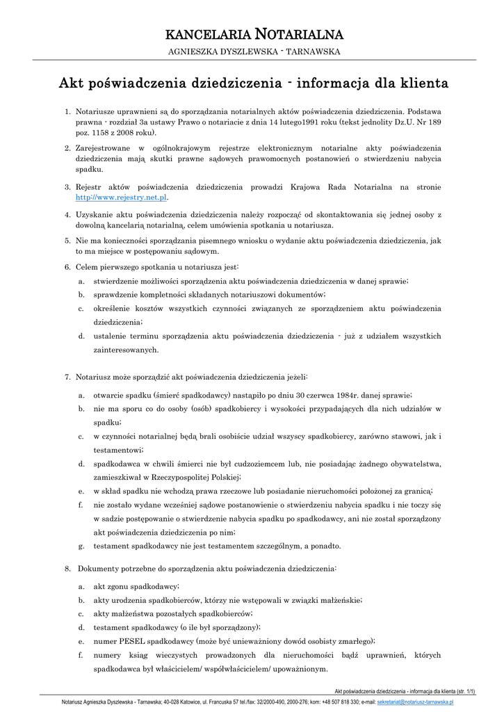 KANCELARIA NOTARIALNA AGNIESZKA DYSZLEWSKA - TARNAWSKA Akt poświadczenia dziedziczenia - informacja dla klienta 1. Notariusze uprawnieni są do sporządzania notarialnych aktów poświadczenia dziedziczenia. Podstawa prawna - rozdział 3a ustawy Prawo o notariacie z dnia 14 lutego1991 roku (tekst jednolity Dz.U. Nr 189 poz. 1158 z 2008 roku). 2. Zarejestrowane w ogólnokrajowym rejestrze elektronicznym notarialne akty poświadczenia dziedziczenia mają skutki prawne sądowych prawomocnych postanowień o stwierdzeniu nabycia spadku. 3. Rejestr aktów poświadczenia http://www.rejestry.net.pl. dziedziczenia prowadzi Krajowa Rada Notarialna na stronie 4. Uzyskanie aktu poświadczenia dziedziczenia należy rozpocząć od skontaktowania się jednej osoby z dowolną kancelarią notarialną, celem umówienia spotkania u notariusza. 5. Nie ma konieczności sporządzania pisemnego wniosku o wydanie aktu poświadczenia dziedziczenia, jak to ma miejsce w postępowaniu sądowym. 6. Celem pierwszego spotkania u notariusza jest: a. stwierdzenie możliwości sporządzenia aktu poświadczenia dziedziczenia w danej sprawie; b. sprawdzenie kompletności składanych notariuszowi dokumentów; c. określenie kosztów wszystkich czynności związanych ze sporządzeniem aktu poświadczenia dziedziczenia; d. ustalenie terminu sporządzenia aktu poświadczenia dziedziczenia - już z udziałem wszystkich zainteresowanych. 7. Notariusz może sporządzić akt poświadczenia dziedziczenia jeżeli: a. otwarcie spadku (śmierć spadkodawcy) nastąpiło po dniu 30 czerwca 1984r. danej sprawie; b. nie ma sporu co do osoby (osób) spadkobiercy i wysokości przypadających dla nich udziałów w spadku; c. w czynności notarialnej będą brali osobiście udział wszyscy spadkobiercy, zarówno stawowi, jak i testamentowi; d. spadkodawca w chwili śmierci nie był cudzoziemcem lub, nie posiadając żadnego obywatelstwa, zamieszkiwał w Rzeczypospolitej Polskiej; e. w skład spadku nie wchodzą prawa rzeczowe lub posiadanie nieruchomości położonej za granicą; f. nie zostało wydane wcześniej sądowe postanowienie o stwierdzeniu nabycia spadku i nie toczy się w sadzie postępowanie o stwierdzenie nabycia spadku po spadkodawcy, ani nie został sporządzony akt poświadczenia dziedziczenia po nim; g. testament spadkodawcy nie jest testamentem szczególnym, a ponadto. 8. Dokumenty potrzebne do sporządzenia aktu poświadczenia dziedziczenia: a. akt zgonu spadkodawcy; b. akty urodzenia spadkobierców, którzy nie wstępowali w związki małżeńskie; c. akty małżeństwa pozostałych spadkobierców; d. testament spadkodawcy (o ile był sporządzony); e. numer PESEL spadkodawcy (może być unieważniony dowód osobisty zmarłego); f. numery ksiąg wieczystych prowadzonych dla nieruchomości bądź uprawnień, których spadkodawca był właścicielem/ współwłaścicielem/ upoważnionym. Akt poświadczenia dziedziczenia - informacja dla klienta (str. 1/1) Notariusz Agnieszka Dyszlewska - Tarnawska; 40-028 Katowice, ul. Francuska 57 tel./fax: 32/2000-490, 2000-276; kom: +48 507 818 330; e-mail: [email protected]