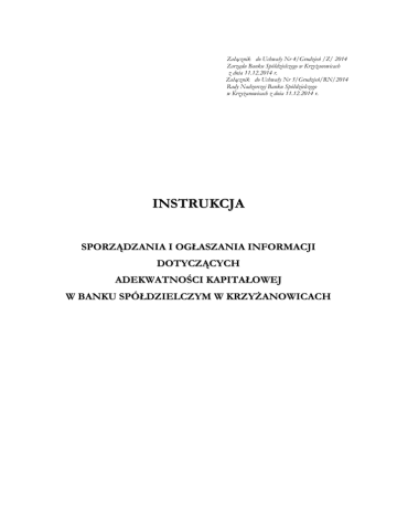Załącznik do Uchwały Nr 4/Grudzień /Z/ 2014 Zarządu Banku Spółdzielczego w Krzyżanowicach z dnia 11.12.2014 r. Załącznik do Uchwały Nr 3/Grudzień/RN/2014 Rady Nadzorczej Banku Spółdzielczego w Krzyżanowicach z dnia 11.12.2014 r. INSTRUKCJA SPORZĄDZANIA I OGŁASZANIA INFORMACJI DOTYCZĄCYCH ADEKWATNOŚCI KAPITAŁOWEJ W BANKU SPÓŁDZIELCZYM W KRZYŻANOWICACH Spis treści 1. Postanowienia ogólne .........................................................................................................3 2. Zakres ogłaszanych informacji ...........................................................................................4 3. Częstotliwość ogłaszania informacji ……...........................................................................5 4. Forma i miejsce ogłaszania informacji…………………………………………………… 6 5. Zasady zapewniania członkom i klientom Banku właściwego dostępu do informacji…… 6 6. Zasady zatwierdzania i weryfikacji ogłaszanych informacji………………………………..6 7. Zasady weryfikacji Polityki informacyjnej………………………………………………….7 8. Przepisy końcowe i przejściowe…………………………………………………………...7 Załącznik 1: Polityka informacyjna Załącznik 2 : Zestawienie zakresu informacji podlegających ujawnieniom wraz z przypisaniem komórek odpowiedzialnych za ich przygotowanie Załącznik 3: Zasady dostępu do Polityki informacyjnej 1. Postanowienia ogólne § 1. 1. Bank prowadzi przejrzystą politykę informacyjną, uwzględniającą potrzeby informacyjne członków Banku oraz klientów. 2. Niniejsza Instrukcja zawiera zakres i metody ujawniania informacji o charakterze jakościowym i ilościowym dotyczących adekwatności kapitałowej w Banku, zgodnie z art. 111a Prawa bankowego oraz Uchwałą Nr 259/2011 Komisji Nadzoru Finansowego (KNF) z dnia 4 października 2011 roku (z późn. zm.) w sprawie szczegółowych zasad i sposobu ogłaszania przez banki informacji o charakterze jakościowym i ilościowym dotyczących adekwatności kapitałowej oraz zakresu informacji podlegających ogłaszaniu, zwana dalej „uchwałą KNF w sprawie ujawniania przez banki informacji(..)” . 3. Niniejsza Instrukcja określa: 1) zakres ogłaszanych zgodnie z wymogami prawa informacji; 2) określenie częstotliwości dokonywania ogłaszania informacji; 3) formy i miejsca ogłaszania informacji; 4) sposób zapewnienia klientom i członkom banku właściwego dostępu do informacji; 5) zasady zatwierdzania i weryfikowania informacji podlegających zgodnie z Instrukcją ogłaszaniu, 6) okresy przejściowe. §2 1. Niniejsza Instrukcja określa w szczególności: 1) Wytyczne dotyczące zasad i metod ujawniania informacji o charakterze jakościowym i ilościowym. 2) Zakres zadań i odpowiedzialności w procesie ujawniania informacji, o których mowa w ust.1. 2. Niniejsza Instrukcja stanowi regulację Banku przyjętą w celu: 1) wykonania postanowień Rozporządzenia Parlamentu Europejskiego i Rady (UE) nr 575/2013 z dnia 26 czerwca 2013 r. w sprawie wymogów ostrożnościowych dla instytucji kredytowych i firm inwestycyjnych; 2) spełnienia wymogów art. 111 oraz 111a Ustawy Prawo bankowe; 3) spełnienia wymogów § 31 Zasad Ładu Korporacyjnego dla instytucji nadzorowanych, wydanych Uchwałą nr 218/2014 Komisji Nadzoru Finansowego (Dz. Urz. KNF z 2014 roku, poz. 17). 3. Polityka wprowadza zestaw wymagań informacyjno-sprawozdawczych, które umożliwią uczestnikom rynku ocenę działalności Banku poprzez ocenę: metod szacowania kapitału, metod narażenia Banku na ryzyka, technik stosowanych przez Bank w celu identyfikacji, pomiaru, monitorowania i kontroli poszczególnych rodzajów ryzyka, a tym samym ocenę adekwatności kapitałowej Banku. §3 Podstawą do opracowania Instrukcji są zapisy: 1) postanowień prawa, w tym: Ustawy Prawo bankowe, Rozporządzenia (UE) nr 575/2013 i innych rozporządzeń wykonawczych; 2) rekomendacji nadzorczych wydanych przez KNF lub Europejski Urząd Nadzoru Bankowego dotyczących dokonywania ujawnień informacji; 3) „Zasad Ładu Korporacyjnego dla instytucji nadzorowanych” wydanych przez Komisję Nadzoru Finansowego; 4) Statutu Banku. Użyte w Instrukcji określenia oznaczają: §4 3 1) Bank – Bank Spółdzielczy w Krzyżanowicach; 2) Rozporządzenie – Rozporządzenie Parlamentu Europejskiego i Rady (UE) nr 575/2013 z dnia 26 czerwca 2013 r. w sprawie wymogów ostrożnościowych dla instytucji kredytowych i firm inwestycyjnych 2. Zakres ogłaszanych informacji § 5. 1. Bank ujawnia informacje o charakterze ilościowym i jakościowym dotyczące adekwatności kapitałowej oraz informacje podlegające ogłaszaniu, szczegółowo określone w części ósmej, tytule II Rozporządzenia. 2. Informacje o charakterze jakościowym podlegające ogłaszaniu obejmują w szczególności: 1) informacje ogólne o Banku; 2) cele, strategie i opis procesów zarządzania poszczególnymi rodzajami ryzyka; 3) przyjęte przez Bank rozwiązania organizacyjne w procesie zarządzania poszczególnymi rodzajami ryzyka; 4) zatwierdzone przez Zarząd oświadczenie na temat adekwatności ustaleń dotyczących zarządzania ryzykiem w Banku, dające pewność, ze stosowane systemy zarządzania ryzykiem są odpowiednie z punktu widzenia profilu i strategii Banku, wymagane przez art. 453, ust. 1, lit. e; 5) opis systemów raportowania i pomiaru poszczególnych rodzajów ryzyk; 6) ilość stanowisk dyrektorskich (wg definicji Rozporządzenia) pełnionych przez członków Zarządu oraz Rady Nadzorczej, zasady powoływania i oceny kwalifikacji, doświadczenia i reputacji członków Zarządu oraz Rady Nadzorczej, zasady przepływu informacji dotyczącej ryzyka kierowanej do Zarządu oraz Rady Nadzorczej Banku –w zakresie art. 435 ust. 2 Rozporządzenia; 7) fundusze własne, zgodnie z art. 436 Rozporządzenia, a także Rozporządzenia wykonawczeg