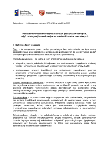 Załącznik nr 11 do Regulaminu konkursu RPO WiM na lata 2014-2020 Podstawowe warunki odbywania staŜy, praktyk zawodowych, zajęć reintegracji zawodowej oraz szkoleń i kursów zawodowych I. Definicje form wsparcia StaŜ - to nabywanie przez osoby pozostające bez zatrudnienia (w tym osoby zarejestrowane jako bezrobotne) umiejętności praktycznych do wykonywania zadań w miejscu pracy bez nawiązania stosunku pracy z pracodawcą. Praktyka zawodowa – to jedna z form praktycznej nauki zawodu będąca: • integralną częścią szkolenia, której celem jest zastosowanie i pogłębianie zdobytej wiedzy i umiejętności zawodowych w rzeczywistych warunkach pracy, bądź: • zdobywaniem nowych kwalifikacji lub umiejętności zawodowych poprzez praktyczne wykonywanie zadań zawodowych na stanowisku pracy, według ustalonego programu, uzgodnionego pomiędzy pracodawcą a osobą odbywającą praktykę. Zajęcia reintegracji zawodowej - to forma wsparcia, dzięki której osoba wykluczona lub zagroŜona wykluczeniem społecznym ma moŜliwość powrotu na rynek pracy poprzez praktyczne wykonywanie zadań zawodowych na stanowisku pracy według ustalonego programu uzgodnionego pomiędzy beneficjentem, pracodawcą i uczestnikiem projektu. Szkolenia/kurs - to pozaszkolne zajęcia mające na celu podniesienie, uzupełnienie lub zmianę kwalifikacji zawodowych, potrzebnych do wykonywania pracy, w tym umiejętności poszukiwania zatrudnienia. Integralną częścią szkolenia moŜe być praktyka zawodowa, której celem jest zastosowanie i pogłębienie wiedzy i umiejętności zawodowych zdobytych podczas szkolenia/kursu w rzeczywistych warunkach zawodowych. Szkolenia/kursy otwarte - to szkolenia/kursy o ustalonej z góry dacie, miejscu, programie lub ramach merytorycznych, grupie docelowej, celach szkoleniowych i cenie, będące zazwyczaj szkoleniami „miękkimi”, psychologicznymi, językowymi, prawnymi czy kursami zawodowymi, na które jest prowadzony przez firmę szkoleniową otwarty nabór uczestników. II. Warunki udzielania poszczególnych form wsparcia tj. staŜy/praktyk zawodowych/zajęć reintegracji zawodowej Instrument w postaci staŜu / praktyk zawodowych / zajęć reintegracji zawodowej u pracodawcy, naleŜy realizować na analogicznych zasadach, jak ma to miejsce w przypadku staŜu, o którym mowa w art. 53 ust. 1-7a ustawy z dnia 20 kwietnia 2004 r. o promocji zatrudnienia i instytucjach rynku pracy (tekst jednolity: Dz. U. z 2015 r. poz. 149, z późn. zm). 1. Wsparcie w postaci staŜy i praktyk zawodowych realizowane w ramach projektów jest zgodne z zaleceniem Rady Unii Europejskiej z dnia 10 marca 2014 r. w sprawie ram jakości staŜy (Dziennik Urzędowy Unii Europejskiej C 88 z 27.03.2014, str. 1) oraz z Polskimi Ramami Jakości Praktyk i StaŜy, jak równieŜ spełnia podstawowe wymogi dające wysoki standard staŜu/praktyki zawodowej poprzez zapewnienie, iŜ: a) staŜ/praktyka zawodowa odbywa się na podstawie umowy, której stroną jest co najmniej staŜysta/praktykant oraz podmiot przyjmujący na staŜ/praktykę zawodową. Umowa zawiera podstawowe warunki przebiegu staŜu/praktyki zawodowej, w tym cele edukacyjne, okres trwania staŜu/praktyki zawodowej, wysokość przewidywanego stypendium, miejsce wykonywania prac, zakres obowiązków oraz dane opiekuna staŜu/praktyki zawodowej; b) zadania w ramach staŜu/praktyki zawodowej są wykonywane zgodnie z programem, który jest przygotowany przez podmiot przyjmujący na staŜ/praktykę zawodową we współpracy z organizatorem staŜu/praktyki zawodowej i przedkładany do podpisu staŜysty/praktykanta. Program staŜu/praktyki zawodowej jest opracowywany indywidualnie, z uwzględnieniem potrzeb i potencjału staŜysty/praktykanta; c) staŜysta/praktykant wykonuje swoje obowiązki pod nadzorem opiekuna staŜu/praktyki zawodowej, wyznaczonego na etapie przygotowań do realizacji programu staŜu/praktyki zawodowej. Opiekun wprowadza staŜystę/praktykanta w zakres obowiązków oraz zapoznaje z zasadami i procedurami obowiązującymi w organizacji, w której odbywa staŜ/praktykę zawodową, a takŜe monitoruje realizację przydzielonego w programie staŜu/praktyki zawodowej zakresu obowiązków i celów edukacyjnozawodowych. Opiekun udziela takŜe informacji zwrotnej staŜyście/praktykantowi na temat osiąganych wyników i stopnia realizacji zadań. Na jednego opiekuna staŜu/praktyki zawodowej nie moŜe przypadać więcej niŜ 3 staŜystów/praktykantów. Opiekun staŜysty/praktykanta jest wyznaczany po stronie podmiotu przyjmującego na staŜ/praktykę zawodową; d) po zakończeniu staŜu/praktyki zawodowej jest opracowywana ocena, uwzględniająca osiągnięte rezultaty oraz efekty staŜu/praktyki zawodowej. str. 2 Ocena jest opracowywana przez podmiot przyjmujący na staŜ/praktykę zawodową w formie pisemnej. 2. StaŜ/praktyka zawodowa trwa nie krócej niŜ 3 miesiące i nie dłuŜej niŜ 6 miesięcy kalendarzowych. 3. W okresie odbywania staŜu/praktyki zawodowej staŜyście/praktykantowi przysługuje miesięczne stypendium w wysokości nie większej niŜ kwota minimalnego wynagrodzenia za pracę ustalanego na podstawie przepisów o minimalnym wynagrodzeniu za pracę, naliczane proporcjonalnie do liczby godzin staŜu/praktyki zawodowej zrealizowanych przez staŜystę/praktykanta. 4. Wnioskodawca, za przysługujące stypendium staŜyście, opłaca składki na ubezpieczenia emerytalne, rentowe oraz wypadkowe. Kwotę stypendium wypłacanego osobie odbywającej staŜ, naleŜy rozumieć jako: a) niepomniejszoną o zaliczkę na podatek dochodowy od osób fizycznych, z uwagi na objęcie kwoty stypendium zwolnieniem - gdyŜ zgodnie z art. 21 ust. 1 pkt. 136 i 137 ustawy z dnia 26 lipca 1991 r. o podatku dochodowym od osób fizycznych, zwolnione z poboru podatku dochodowego są płatności na realizację projektów w ramach programów finansowanych z udziałem środków europejskich, otrzymane z Banku Gospodarstwa Krajowego, z wyłąc