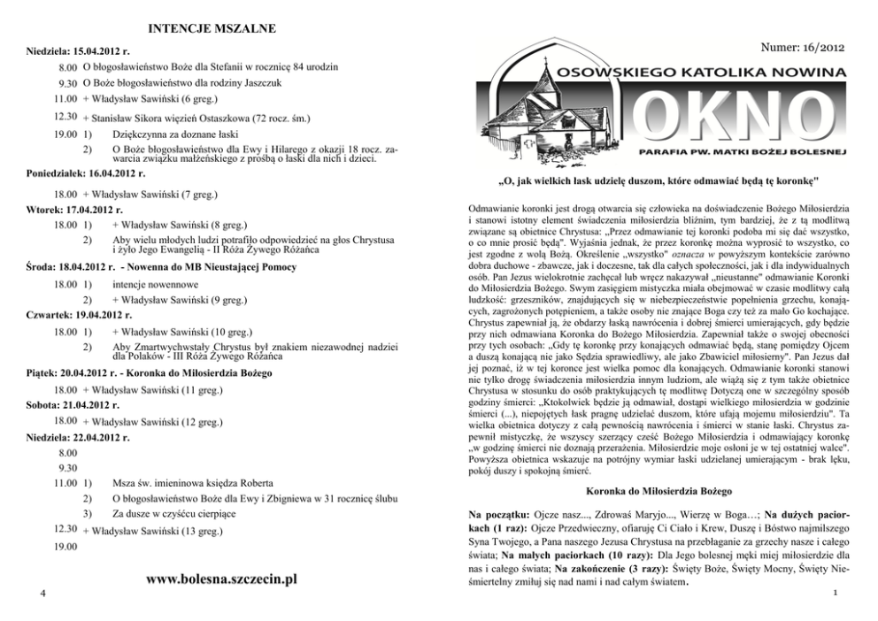 INTENCJE MSZALNE Numer: 16/2012 Niedziela: 15.04.2012 r. 8.00 O błogosławieństwo Boże dla Stefanii w rocznicę 84 urodzin 9.30 O Boże błogosławieństwo dla rodziny Jaszczuk 11.00 + Władysław Sawiński (6 greg.) 12.30 + Stanisław Sikora więzień Ostaszkowa (72 rocz. śm.) 19.00 1) 2) Dziękczynna za doznane łaski O Boże błogosławieństwo dla Ewy i Hilarego z okazji 18 rocz. zawarcia związku małżeńskiego z prośbą o łaski dla nich i dzieci. Poniedziałek: 16.04.2012 r. „O, jak wielkich łask udzielę duszom, które odmawiać będą tę koronkę" 18.00 + Władysław Sawiński (7 greg.) Wtorek: 17.04.2012 r. 18.00 1) + Władysław Sawiński (8 greg.) 2) Aby wielu młodych ludzi potrafiło odpowiedzieć na głos Chrystusa i żyło Jego Ewangelią - II Róża Żywego Różańca Środa: 18.04.2012 r. - Nowenna do MB Nieustającej Pomocy 18.00 1) intencje nowennowe 2) + Władysław Sawiński (9 greg.) Czwartek: 19.04.2012 r. 18.00 1) 2) + Władysław Sawiński (10 greg.) Aby Zmartwychwstały Chrystus był znakiem niezawodnej nadziei dla Polaków - III Róża Żywego Różańca Piątek: 20.04.2012 r. - Koronka do Miłosierdzia Bożego 18.00 + Władysław Sawiński (11 greg.) Sobota: 21.04.2012 r. 18.00 + Władysław Sawiński (12 greg.) Niedziela: 22.04.2012 r. 8.00 9.30 11.00 1) Msza św. imieninowa księdza Roberta 2) O błogosławieństwo Boże dla Ewy i Zbigniewa w 31 rocznicę ślubu 3) Za dusze w czyśćcu cierpiące 12.30 + Władysław Sawiński (13 greg.) 19.00 4 www.bolesna.szczecin.pl Odmawianie koronki jest drogą otwarcia się człowieka na doświadczenie Bożego Miłosierdzia i stanowi istotny element świadczenia miłosierdzia bliźnim, tym bardziej, że z tą modlitwą związane są obietnice Chrystusa: „Przez odmawianie tej koronki podoba mi się dać wszystko, o co mnie prosić będą". Wyjaśnia jednak, że przez koronkę można wyprosić to wszystko, co jest zgodne z wolą Bożą. Określenie „wszystko" oznacza w powyższym kontekście zarówno dobra duchowe - zbawcze, jak i doczesne, tak dla całych społeczności, jak i dla indywidualnych osób. Pan Jezus wielokrotnie zachęcał lub wręcz nakazywał „nieustanne" odmawianie Koronki do Miłosierdzia Bożego. Swym zasięgiem mistyczka miała obejmować w czasie modlitwy całą ludzkość: grzeszników, znajdujących się w niebezpieczeństwie popełnienia grzechu, konających, zagrożonych potępieniem, a także osoby nie znające Boga czy też za mało Go kochające. Chrystus zapewniał ją, że obdarzy łaską nawrócenia i dobrej śmierci umierających, gdy będzie przy nich odmawiana Koronka do Bożego Miłosierdzia. Zapewniał także o swojej obecności przy tych osobach: „Gdy tę koronkę przy konających odmawiać będą, stanę pomiędzy Ojcem a duszą konającą nie jako Sędzia sprawiedliwy, ale jako Zbawiciel miłosierny". Pan Jezus dał jej poznać, iż w tej koronce jest wielka pomoc dla konających. Odmawianie koronki stanowi nie tylko drogę świadczenia miłosierdzia innym ludziom, ale wiążą się z tym także obietnice Chrystusa w stosunku do osób praktykujących tę modlitwę Dotyczą one w szczególny sposób godziny śmierci: „Ktokolwiek będzie ją odmawiał, dostąpi wielkiego miłosierdzia w godzinie śmierci (...), niepojętych łask pragnę udzielać duszom, które ufają mojemu miłosierdziu". Ta wielka obietnica dotyczy z całą pewnością nawrócenia i śmierci w stanie łaski. Chrystus zapewnił mistyczkę, że wszyscy szerzący cześć Bożego Miłosierdzia i odmawiający koronkę „w godzinę śmierci nie doznają przerażenia. Miłosierdzie moje osłoni je w tej ostatniej walce". Powyższa obietnica wskazuje na potrójny wymiar łaski udzielanej umierającym - brak lęku, pokój duszy i spokojną śmierć. Koronka do Miłosierdzia Bożego Na początku: Ojcze nasz..., Zdrowaś Maryjo..., Wierzę w Boga…; Na dużych paciorkach (1 raz): Ojcze Przedwieczny, ofiaruję Ci Ciało i Krew, Duszę i Bóstwo najmilszego Syna Twojego, a Pana naszego Jezusa Chrystusa na przebłaganie za grzechy nasze i całego świata; Na małych paciorkach (10 razy): Dla Jego bolesnej męki miej miłosierdzie dla nas i całego świata; Na zakończenie (3 razy): Święty Boże, Święty Mocny, Święty Nieśmiertelny zmiłuj się nad nami i nad całym światem. 1 Liturgia słowa - Niedziela Miłosierdzia Bożego I czytanie (Dz 4,32-35) Jeden duch i jedno serce ożywiały wszystkich wierzących. Żaden nie nazywał swoim tego, co posiadał, ale wszystko mieli wspólne. Apostołowie z wielką mocą świadczyli o zmartwychwstaniu Pana Jezusa, a wszyscy oni mieli wielką łaskę. Nikt z nich nie cierpiał niedostatku, bo właściciele pól albo domów sprzedawali je i przynosili pieniądze /uzyskane/ ze sprzedaży, i składali je u stóp Apostołów. Każdemu też rozdzielano według potrzeby. II czytanie (1 J 5,1-6) Każdy, kto wierzy, że Jezus jest Mesjaszem, z Boga się narodził, i każdy miłujący Tego, który dał życie, miłuje również tego, który życie od Niego otrzymał. Po tym poznajemy, że miłujemy dzieci Boże, gdy miłujemy Boga i wypełniamy Jego przykazania, albowiem miłość względem Boga polega na spełnianiu Jego przykazań, a przykazania Jego nie są ciężkie. Wszystko bowiem, co z Boga zrodzone, zwycięża świat; tym właśnie zwycięstwem, które zwyciężyło świat, jest nasza wiara. A kto zwycięża świat, jeśli nie ten, kto wierzy, że Jezus jest Synem Bożym? Jezus Chrystus jest tym, który przyszedł przez wodę i krew, i Ducha, nie tylko w wodzie, lecz w wodzie i we krwi. Duch daje świadectwo, bo jest prawdą. Ewangelia (J 20,19-31) Było to wieczorem owego pierwszego dnia tygodnia, tam gdzie przebywali uczniowie, gdy drzwi były zamknięte z obawy przed Żydami, przyszedł Jezus, stanął pośrodku i rzekł do nich: Pokój wam! A to powiedziawszy, pokazał im ręce i bok. Uradowali się zatem uczniowie ujrzawszy Pana. A Jezus znowu rzekł do nich
