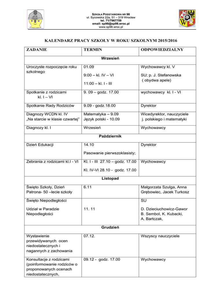 SZKOŁA PODSTAWOWA NR 98 ul. Sycowska 22a, 51 – 319 Wrocław tel. 71/7967759 email: [email protected] www.sp98.wroc.pl KALENDARZ PRACY SZKOŁY W ROKU SZKOLNYM 2015/2016 ZADANIE TERMIN ODPOWIEDZIALNY Wrzesień Uroczyste rozpoczęcie roku szkolnego 01.09 Wychowawcy kl. V 9:00 – kl. IV – VI SU; p. J. Stefanowska ( obydwa apele) 11:00 – kl. I - III Spotkanie z rodzicami kl. I – VI 9. 09 – godz. 17.00 wychowawcy kl. I - VI Spotkanie Rady Rodziców 9.09 - godz.18.00 Dyrektor Diagnozy WCDN kl. IV „Na starcie w klasie czwartej” Matematyka – 9.09 Język polski - 10.09 Wicedyrektor, nauczyciele j. polskiego i matematyki Diagnozy kl. I Wrzesień Wychowawcy Październik Dzień Edukacji 14.10 Dyrektor Pasowanie pierwszoklasisty; Zebrania z rodzicami kl.I - VI Kl. I - III 27.10 – godz. 17.00 Wychowawcy Kl. IV-VI 28.10 - godz. 17.00 Listopad Święto Szkoły, Dzień Patrona- 50 –lecie szkoły Małgorzata Szulga, Anna Grębowiec, Jacek Turkosz 6.11 Święto Niepodległości Udział w Paradzie Niepodległości SU 11. 11 D. Dzieciuchowicz-Gawor B. Sembol, K. Kubacki, A. Bartczak, Grudzień Wystawienie przewidywanych ocen niedostatecznych i nagannych z zachowania 07.12. Wszyscy nauczyciele Konsultacje z rodzicami (poinformowanie rodziców o proponowanych ocenach niedostatecznych, 09.12 - godz. 17.00 Wychowawcy zachowaniu ng + podpis) Poinformowanie rodziców nieobecnych na zebraniu o przewidywanych ocenach niedostatecznych i nagannych z zachowania do 10.12 Wychowawcy Wigilie klasowe 16.12 kl. IV - VI Wych. klas IV - VI 19.12 kl. I - III Wych. klas I - III Próbny sprawdzian szóstoklasisty 17.12 Zespół ds. diagnoz, nauczyciele przedmiotowcy Zimowa przerwa świąteczna 23 - 31.12 Styczeń Dzień wolny od zajęć 2.01 Dyżury nauczycieli Wystawienie ocen przewidywanych ( wszystkie przedmioty) i ocen z zachowania 4.01. do godz. 15:00 Nauczyciele, wychowawcy Wystawienie ocen semestralnych 22.01 – do godz. 14:00 Wszyscy nauczyciele Zebrania z rodzicami Kl. I - III 26.01 – godz. 17.00 Wychowawcy Uwaga : oceny mogą ulec zmianie Kl. IV-VI 27.01 - godz. 17.00 Apel podsumowujący I semestr 29.01 SU, wychowawcy Diagnozy WCDN kl. V „Na półmetku w klasie piątej” Matematyka j. polski Wicedyrektor, nauczyciele przedmiotowi Luty Ferie zimowe 1.02 - 14.02 Zespół ds. promocji szkoły Drzwi Otwarte Marzec Rekolekcje J. Szczuplak, A. Winiarczyk Konsultacje z rodzicami 11.03 - godz. 17.00 Wiosenna przerwa 24 - 29.03 Wychowawcy, nauczyciele świąteczna Kwiecień Sprawdzian szóstoklasisty 05.04 Dyrektor, zespół nauczycieli ds. przebiegu sprawdzianu Zebrania z rodzicami 12.04 – kl.I – III, godz. 17.00 Wychowawcy 13.04 – kl.IV–VI, godz. 17.00 Światowy Dzień Ziemi 22.04 p. B. Kunkowska Diagnozy klas I - V 25 – 29.04 Wicedyrektor, nauczyciele przedmiotowi Maj Wystawienie przewidywanych ocen niedostatecznych i nagannych z zachowania 09.05 Wszyscy nauczyciele Konsultacje z rodzicami (poinformowanie rodziców o proponowanych ocenach niedostatecznych, zachowaniu ng + podpis) 11.05 Wychowawcy Poinformowanie rodziców nieobecnych na zebraniu o przewidywanych ocenach niedostatecznych i nagannych z zachowania do 12.05 Wychowawcy Wystawienie ocen przewidywanych ( wszystkie przedmioty) i ocen z zachowania 20.05. do godz. 15:00 Nauczyciele, wychowawcy Uwaga : oceny mogą ulec zmianie Wycieczki szkolne, zielone szkoły do 29.05 Diagnozy kl. III Maj Wychowawcy Czerwiec Festyn Rodzinny 4.06 p. J. Solarska, B. Baczewski Wystawienie ocen końcoworocznych do 10.06 do godz.14.00 Nauczyciele przedmiotowi Składanie podań o egzamin sprawdzający do 13.06 do godz. 14.00 Uczniowie, rodzice Egzaminy sprawdzające 15.06 Komisja Ogłoszenie SZP nauczania i podręczników obowiązujących w roku szkolnym 2016/2017 15.06 Dyrektor Diagnoza umiejętności z zakresu j. angielskiego służąca podziałowi na grupy umiejętności 16.06 B.Szarypo, J.Turkosz, M.Bartuś, K.Kubacki Ostateczny termin złożenia podań o egzamin klasyfikacyjny do 16.06 do godz.12.00 Rodzice Szkoła Inaczej 20 – 23.06 Kiermasz podręczników 21.06 Zakończenie roku szkolnego 24.06 p. K. Kubacki, J. Turkosz