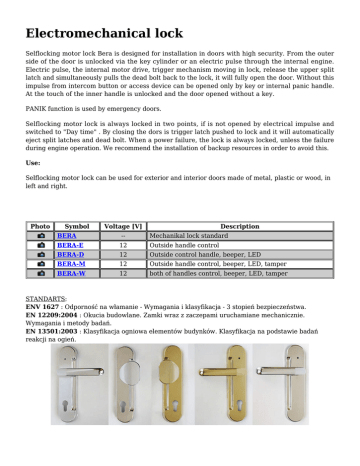 Electromechanical lock Selflocking motor lock Bera is designed for installation in doors with high security. From the outer side of the door is unlocked via the key cylinder or an electric pulse through the internal engine. Electric pulse, the internal motor drive, trigger mechanism moving in lock, release the upper split latch and simultaneously pulls the dead bolt back to the lock, it will fully open the door. Without this impulse from intercom button or access device can be opened only by key or internal panic handle. At the touch of the inner handle is unlocked and the door opened without a key. PANIK function is used by emergency doors. Selflocking motor lock is always locked in two points, if is not opened by electrical impulse and switched to "Day time" . By closing the dors is trigger latch pushed to lock and it will automatically eject split latches and dead bolt. When a power failure, the lock is always locked, unless the failure during engine operation. We recommend the installation of backup resources in order to avoid this. Use: Selflocking motor lock can be used for exterior and interior doors made of metal, plastic or wood, in left and right. Photo Symbol Voltage [V] Description BERA -- Mechanikal lock standard BERA-E 12 Outside handle control BERA-D 12 Outside control handle, beeper, LED BERA-M 12 Outside handle control, beeper, LED, tamper BERA-W 12 both of handles control, beeper, LED, tamper STANDARTS: ENV 1627 : Odporność na włamanie - Wymagania i klasyfikacja - 3 stopień bezpieczeństwa. EN 12209:2004 : Okucia budowlane. Zamki wraz z zaczepami uruchamiane mechanicznie. Wymagania i metody badań. EN 13501:2003 : Klasyfikacja ogniowa elementów budynków. Klasyfikacja na podstawie badań reakcji na ogień. .