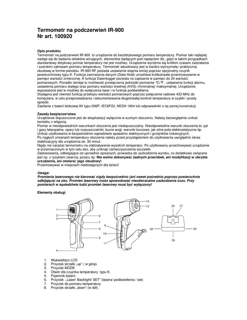 Termometr na podczerwień IR-900 Nr art. 100920 Opis produktu Termometr na podczerwień IR-900 to urządzenie do bezdotykowego pomiaru temperatury. Pomiar taki najlepiej nadaje się do badania obiektów wirujących, elementów będących pod napięciem itd., gdyż w takich przypadkach standardowy dotykowy pomiar temperatury nie jest możliwy. Urządzenie wyróżnia się krótkim czasem zadziałania i szerokim zakresem pomiaru temperatury. Termometr wbudowany jest w bardzo wytrzymałą i praktyczną obudowę w formie pistoletu. IR-900 RF posiada ustawienie stopnia emisji poprzez opcjonalny czujnik powierzchniowy typu K. Funkcja zamrażania danych (Data Hold) umożliwia krótkotrwałe przechowywanie w pamięci wartości zmierzonej. A funkcja Datenlogger pozwala na zapisanie w pamięci do 20 wartości pomiarowych. Ponadto istnieje tu możliwość przełączenia jednostki pomiarów °C/°F , ustawienia funkcji alarmu, ustawienia pomiaru stałego oraz pomiaru wartości średniej (AVG) /minimalnej/ maksymalnej. Urządzenie wyposażone jest w możliwy do wyłączenia laser i w funkcje podświetlania. Dostępna jest również funkcja przekazu wartości pomiarowych poprzez połączenie radiowe 433 MHz do komputera, w celu przeprowadzania i dokumentowania długotrwałej kontroli temperatury w szybki i prosty sposób. Zasilanie z baterii blokowej 9V typu 006P, IEC6F22, NEDA 1604 lub odpowiedniki o tej samej konstrukcji. Zasady bezpieczeństwa Urządzenie dopuszczone jest do eksploatacji wyłącznie w suchym otoczeniu. Należy bezwzględnie unikać kontaktu z wilgocią. Pomiar w nieodpowiednich warunkach otoczenia jest niedopuszczalny. Nieodpowiednie warunki otoczenia to: pył i gazy łatwopalne, opary lub rozpuszczalniki, burze wzgl. warunki burzowe, jak silne pola elektrostatyczne itp. Unikać użytkowania w bezpośrednim sąsiedztwie spawalnic elektrycznych i grzejników indukcyjnych. Po nagłych zmianach temperatury otoczenia należy przed przystąpieniem do użytkowania uwzględnić okres stabilizacyjny dla urządzenia ok. 30 minut. Nigdy nie narażać termometru na oddziaływanie wysokich temperatur. Po użytkowaniu przechowywać urządzenie w przeznaczonym w tym celu etui, aby uniknąć zanieczyszczenia soczewki. Zastosowania, odbiegające od uprzednio opisanych, prowadza do uszkodzenia wyrobu, co dodatkowo związane jest np. z ryzykiem zwarcia, pożaru itp. Nie wolno dokonywać żadnych przeróbek, ani modyfikacji w obrębie urządzenia, ani otwierać jego obudowy! Przechowywać w miejscach niedostępnych dla dzieci! Uwaga: Promienia laserowego nie kierować nigdy bezpośrednio (ani nawet pośrednio poprzez powierzchnie odbijające) na oko. Promień laserowy może spowodować nieodwracalne uszkodzenia oczu. Przy pomiarach w sąsiedztwie ludzi promień laserowy musi być wyłączony! Elementy obsługi 1. 2. 3. 4. 5. 6. 7. 8. Wyświetlacz LCD Przycisk strzałki „up” ( w górę). Przycisk MODE Otwór dla czujnika temperatury typu K. Pojemnik baterii. Przycisk „Laser/ Backlight/ SET” (lasera/ podświetlenia / set) Przycisk do pomiaru temperatury Przycisk strzałki „down” (w dół). 9. 10. 11. 12. 13. 14. 15. 16. 17. 18. 19. 20. 21. 22. 23. 24. 25. 26. 27. 28. 29. 30. Przycisk przełączania °C/°F Przełącznik pomiaru stałego Przełącznik włączania/wyłączania alarmu. Wejście dla czujnika podczerwieni Otwór wylotowy promienia laserowego Współczynnik pomiaru Wskaźnik funkcji DATA HOLD Automatyczny pomiar stopnia emisji. Wskaźnik stopnia emisji Wskaźnik wartości zmierzonej temperatury Wskaźnik funkcyjny drugiego wyświetlacza Drugi wyświetlacz Wskaźnik lasera i pomiaru stałego Wskaźnik °C/ °F. Wskaźnik zużycia baterii Symbole alarmu Hi / LOW Symbol USB do aktywacji przekazu radiowego. Przycisk ON (włączania). Kontrola LED „ON” Analogowe wyjście 1mV/st.C. Gwint statywu. Wejście 12 V dla zasilacza 31. Zasada działania Termometr na podczerwień mierzy temperaturę powierzchniową obiektu. Czujnik urządzenia rejestruje ustalone odbite i przepuszczone promieniowanie cieplne obiektu i przetwarza te informacje na wartość temperatury. Pomiar nie może odbywać się przez powierzchnie transparentne np. szkło. Ponieważ w tym przypadku następuje pomiar temperatury powierzchni szkła. Uruchomienie i obsługa Wstawianie baterii Przed przystąpieniem do pomiaru, konieczne jest zainstalowanie nowej baterii blokowej 9 V. Pomiar temperatury Skierować otwór czujnika podczerwieni (12) na obiekt, którego temperatura ma być zmierzona i nacisnąć przycisk pomiaru temperatury (7). Na wyświetlaczu widoczny będzie napis „SCAN” (14). Należy upewnić się, czy plamka miernicza nie przekracza swym rozmiarem mierzonego obiektu. Zmierzona aktualnie wartość temperatury (18) pojawi się na wyświetlaczu LCD. W celu zlokalizowania najgorętszych miejsc obiektu należy nakierować IR-900 na punkt poza wymagana strefa, a następnie przytrzymując wciśnięty przycisk pomiaru temperatury (7) i ruchami zygzakowymi odszukać najgorętsze miejsce. Po zwolnieniu przycisku pomiaru temperatury (7) zmierzona ostatnio wartość (18) wyświetlana będzie jeszcze przez około 7 sekund. W tym czasie na wyświetlaczu widoczny będzie napis „HOLD” (15). Po upływie 7 sekund nastąpi samoczynne wyłączenie urządzenia, co pozwala zredukować zużycie baterii. Funkcje przycisku MODE (3) Naciskając na przycisk MODE (3) można na drugim wyświetlaczu (20) dokonywać wyboru miedzy funkcjami mierniczymi „MIN”(wyświetlanie tylko minimalnej wartości temperatury podczas pomiaru), „MAX” (wyświetlanie tylko maksymalnej wartości temperatury podczas pomiaru), „DIF (różnicy pomiędzy najwyższą i najniższą wartością temperatury) i „AVG” (średniej wartości). Zarejestrowaną wartość temperatury można, po wyłączeniu IR-900 RF, ponownie wywołać poprzez naciśnięcie przycisku MODE (3). Przy każdym nowym pomiarze wartości MAX/ MIN/ DIF i AVG zostaną przepisa
