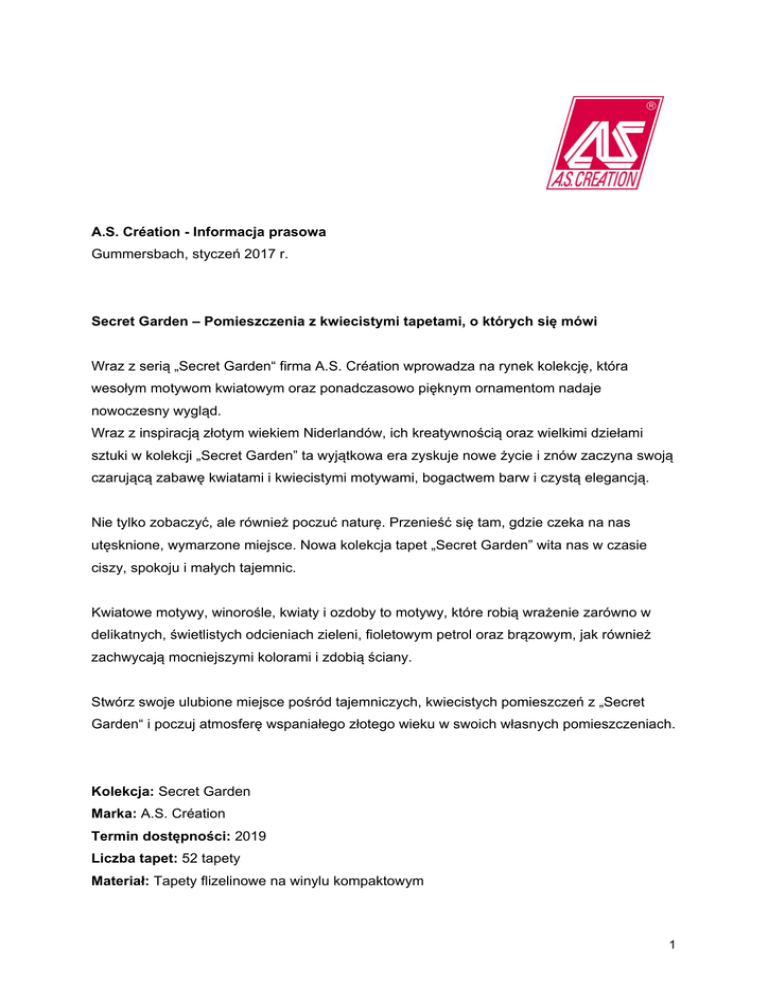 A.S. Création - Informacja prasowa Gummersbach, styczeń 2017 r. Secret Garden – Pomieszczenia z kwiecistymi tapetami, o których się mówi Wraz z serią „Secret Garden“ firma A.S. Création wprowadza na rynek kolekcję, która wesołym motywom kwiatowym oraz ponadczasowo pięknym ornamentom nadaje nowoczesny wygląd. Wraz z inspiracją złotym wiekiem Niderlandów, ich kreatywnością oraz wielkimi dziełami sztuki w kolekcji „Secret Garden” ta wyjątkowa era zyskuje nowe życie i znów zaczyna swoją czarującą zabawę kwiatami i kwiecistymi motywami, bogactwem barw i czystą elegancją. Nie tylko zobaczyć, ale również poczuć naturę. Przenieść się tam, gdzie czeka na nas utęsknione, wymarzone miejsce. Nowa kolekcja tapet „Secret Garden” wita nas w czasie ciszy, spokoju i małych tajemnic. Kwiatowe motywy, winorośle, kwiaty i ozdoby to motywy, które robią wrażenie zarówno w delikatnych, świetlistych odcieniach zieleni, fioletowym petrol oraz brązowym, jak również zachwycają mocniejszymi kolorami i zdobią ściany. Stwórz swoje ulubione miejsce pośród tajemniczych, kwiecistych pomieszczeń z „Secret Garden“ i poczuj atmosferę wspaniałego złotego wieku w swoich własnych pomieszczeniach. Kolekcja: Secret Garden Marka: A.S. Création Termin dostępności: 2019 Liczba tapet: 52 tapety Materiał: Tapety flizelinowe na winylu kompaktowym 1