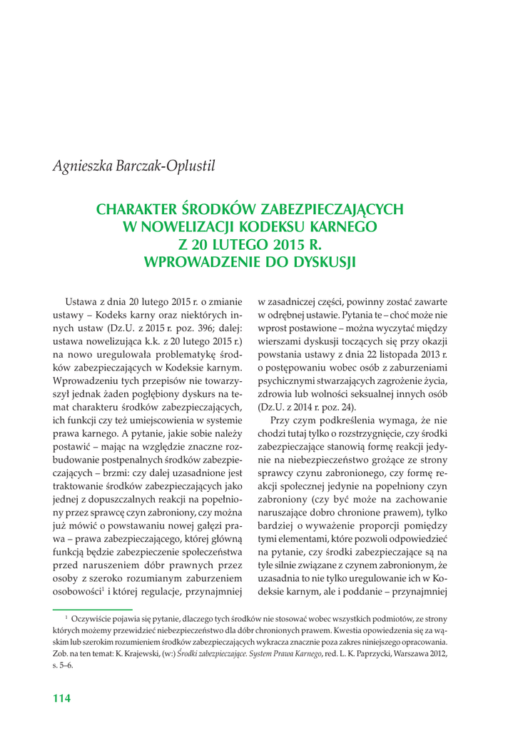 Agnieszka Barczak-Oplustil Charakter środków zabezpieczających w nowelizacji Kodeksu karnego z 20 lutego 2015 r. Wprowadzenie do dyskusji Ustawa z dnia 20 lutego 2015 r. o zmianie ustawy – Kodeks karny oraz niektórych innych ustaw (Dz.U. z 2015 r. poz. 396; dalej: ustawa nowelizująca k.k. z 20 lutego 2015 r.) na nowo uregulowała problematykę środków zabezpieczających w Kodeksie karnym. Wprowadzeniu tych przepisów nie towarzyszył jednak żaden pogłębiony dyskurs na temat charakteru środków zabezpieczających, ich funkcji czy też umiejscowienia w systemie prawa karnego. A pytanie, jakie sobie należy postawić – mając na względzie znaczne rozbudowanie postpenalnych środków zabezpieczających – brzmi: czy dalej uzasadnione jest traktowanie środków zabezpieczających jako jednej z dopuszczalnych reakcji na popełniony przez sprawcę czyn zabroniony, czy można już mówić o powstawaniu nowej gałęzi prawa – prawa zabezpieczającego, której główną funkcją będzie zabezpieczenie społeczeństwa przed naruszeniem dóbr prawnych przez osoby z szeroko rozumianym zaburzeniem osobowości1 i której regulacje, przynajmniej w zasadniczej części, powinny zostać zawarte w odrębnej ustawie. Pytania te – choć może nie wprost postawione – można wyczytać między wierszami dyskusji toczących się przy okazji powstania ustawy z dnia 22 listopada 2013 r. o postępowaniu wobec osób z zaburzeniami psychicznymi stwarzających zagrożenie życia, zdrowia lub wolności seksualnej innych osób (Dz.U. z 2014 r. poz. 24). Przy czym podkreślenia wymaga, że nie chodzi tutaj tylko o rozstrzygnięcie, czy środki zabezpieczające stanowią formę reakcji jedynie na niebezpieczeństwo grożące ze strony sprawcy czynu zabronionego, czy formę reakcji społecznej jedynie na popełniony czyn zabroniony (czy być może na zachowanie naruszające dobro chronione prawem), tylko bardziej o wyważenie proporcji pomiędzy tymi elementami, które pozwoli odpowiedzieć na pytanie, czy środki zabezpieczające są na tyle silnie związane z czynem zabronionym, że uzasadnia to nie tylko uregulowanie ich w Kodeksie karnym, ale i poddanie – przynajmniej 1 Oczywiście pojawia się pytanie, dlaczego tych środków nie stosować wobec wszystkich podmiotów, ze strony których możemy przewidzieć niebezpieczeństwo dla dóbr chronionych prawem. Kwestia opowiedzenia się za wąskim lub szerokim rozumieniem środków zabezpieczających wykracza znacznie poza zakres niniejszego opracowania. Zob. na ten temat: K. Krajewski, (w:) Środki zabezpieczające. System Prawa Karnego, red. L. K. Paprzycki, Warszawa 2012, s. 5–6. 114 7–8/2015 w części – gwarancjom charakterystycznym dla kar. Już w tym momencie można stwierdzić, że nowe regulacje dotyczące środków zabezpieczających zawarte w ustawie nowelizującej z 20 lutego 2015 r., jak też unormowania ustawy o sprawcach niebezpiecznych, pozwalają postawić tezę o konieczności ponownego przedyskutowania tzw. dwutorowości polskiego Kodeksu karnego. Ustawa nowelizująca z 20 lutego 2015 r. wprowadza nowe środki zabezpieczające do Kodeksu karnego w postaci elektronicznej kontroli miejsca pobytu (art. 93a § 1 pkt 1 k.k.), terapii (art. 93a § 1 pkt 2 k.k.), jak też terapii uzależnień (art. 93a § 1 pkt 3 k.k.)2. W dalszym ciągu środkiem zabezpieczającym, jaki można orzec wobec sprawcy, jest pobyt w zakładzie psychiatrycznym (art. 93a § 1 pkt 4 k.k.). Zgodnie zaś z art. 93a § 2 k.k., jeżeli ustawa tak stanowi, tytułem środka zabezpieczającego można orzec nakaz i zakazy określone w art. 39 pkt 2–3 § 2 k.k. Wszystkie środki zabezpieczające orzekane są na czas nieokreślony; gdy ich dalsze stosowanie nie jest konieczne, sąd ma obowiązek uchylić orzeczony środek zabezpieczający (art. 93b § 2 k.k.). Istotniejsze w aspekcie postawionego w pracy pytania jest jednak ustalenie, wobec kogo – po nowelizacji k.k. – można orzec środki zabezpieczające. Okazuje się bowiem, że ustawodawca znacznie rozszerzył zakres tych podmiotów. Aktualnie środki zabezpieczające można orzec nie tylko wobec sprawcy, co do którego umorzono postępowanie o czyn zabroniony popełniony w stanie niepoczytalności określonej w art. 31 § 1 (art. 93c pkt 1 k.k.)3, ale także wobec sprawcy skazanego za przestępstwo popełnione w stanie ograniczonej poczytalności, określonej w art. 31 § 2 k.k. (art. 93c pkt 2 k.k.), jak też skazanego za prze- Charakter środków zabezpieczających... stępstwo określone w art. 148, art. 156, art. 197, art. 198, art. 199 § 2 lub art. 200 § 1, popełnione w związku z zaburzeniem preferencji seksualnych (art. 93c pkt 3 k.k.). Dyskusja tocząca się kilka lat temu na temat sprawców, których niebezpieczeństwo wiąże się z szeroko rozumianym zaburzeniem osobowości, skutkowała zapewne ustaleniem osobnej grupy podmiotów, wobec których można orzec środek zabezpieczający, jaką stanowią sprawcy skazani na karę pozbawienia wolności bez warunkowego jej zawieszenia za umyślne przestępstwo określone w rozdziale XIX, XXIII, XXV lub XXVI, popełnione w związku z zaburzeniem osobowości o takim charakterze lub nasileniu, że zachodzi co najmniej wysokie prawdopodobieństwo popełnienia czynu zabronionego z użyciem przemocy lub groźbą jej użycia (art. 93c pkt 4 k.k.). Ponadto – podobnie jak miało to miejsce na gruncie poprzednio obowiązującego stanu prawnego, jednak w dużo szerszym zakresie – środki zabezpieczające stosować można wobec sprawcy w razie skazania za przestępstwo popełnione w związku z uzależnieniem od alkoholu, środka odurzającego lub innego podobnie działającego środka, przy czym bez znaczenia jest zarówno społeczna szkodliwość popełnionego przestępstwa, jak też wymierzona za nie kara (art. 93c pkt 5 k.k.). Na gruncie nowelizacji k.k. z 20 lutego 2015 r. obowiązuje zasada, że każdy środek zabezpieczający można stosować wobec ka