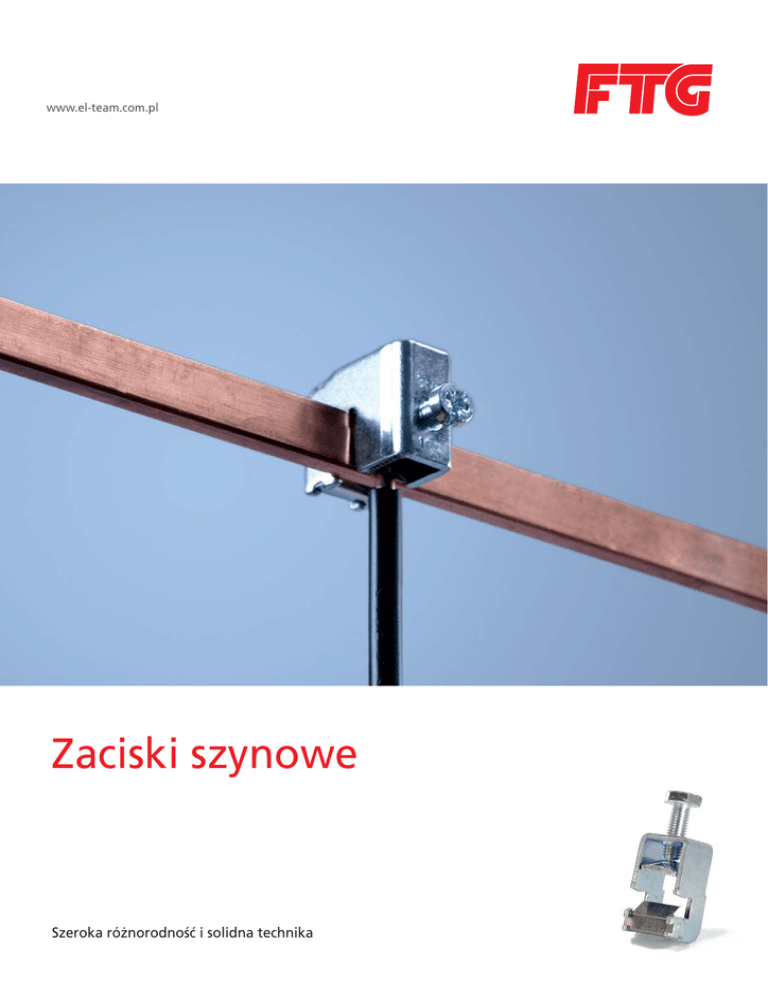 www.ftg-germany.de www.el-team.com.pl Zaciski szynowe Bow terminals Szeroka różnorodność i solidna technika Great variety with solid technique Pewna Steadyklasyka classic Well established classic. one of producent the leadingsystemów manufacturer Ustalony standard. Jako As wiodący rozdziału zasilania, FTG oferuje szeroką gamę innowacyjnych of power busbar systems FTG offers an extensive range of zacisków szynowych. well established and innovative bow terminals. Zaciski szynowe rozwiązanie, potrzebne Bow terminals aretoadoskonałe favorable alternative, if itgdy is important jest proste, lecz niezawodne połączenie. to install simple yet reliable connections. Zaciski szynowe FTG mogą łączyć przewody o przekrojach Conductors with sizes of 1.5 to 185mm² can be connected od 1,5 do 185 mm2. with FTG bow terminals. For flat copper of 3, 5 and 10 mm thickness there are terminals available which loaded Dostarczamy zaciski do szyn miedzianych 3, 5can i 10bemm, up to 500 A.pracować pod obciążeniem do 500A. które mogą 1 Przewody być podpinane zarówno od góry jaktop i od or dołu. Feeding mogą the conductors can be made from also from below. 2 1. Nowe zaciski BKN mają zastosowanie również z okrą- głymi Zaciskami FTG można podłączyć 1. The newprzewodami. BKN terminals in an application with round wszystkie rodzaje przewodów i kabli. conductors. Solid or stranded and rigid wires can be connected to all FTG terminals. 2. Przewody aluminiowe, dzięki zaciskom BKN, mogą być łączone również z miedzią ocynkowaną. 2. Aluminum conductors can even be connected with galvanized copper conductors by means of the BKN 3. Klasyczne zaciski BKN mają zastosowanie również z terminals. This becomes Szczególnie possible by an in-house developed szynoprzewodami. w tym przypadku to special pressure plate. interesujące i pewne połączenie. 3. The classical BKN terminal for applications with flexible lamella conductors. Especially for flexible connections, it is an interesting and solid connection. 3 Zacisk BKN do szyny miedzianej Bow terminals BKN suitable for 3îDWFRSSHUPP mm Zaciskterminals BKN do szyny miedzianej Bow BKS suitable for 5 mm îDWFRSSHUPP Design Wielkość Zakres Clamping range II max, max.,UUmax max. Typ śruby screw Connection Design Wielkość Zakres range Clamping II max, max.,UUmax max. Typ śruby screw Connection 16 mm² 1.5 - 16 mm² 180 A | 1000 V AC/DC PZ 2 # BKN1603 Wielkość Design Zakres range Clamping II max, max.,UUmax max. Typ śruby screw Connection Design Wielkość Zakres range Clamping II max, max.,UUmax max. Typ śruby screw Connection Design Wielkość Zakres range Clamping II max, max.,UUmax max. Typ śruby screw Connection Zacisk BKGS doBKGS szynysuitable miedzianej Bow terminals for flat copper for szyn busbars 3 × 10 | 5 × 5 | 6 × 6 mm dla Design 6 mm² Wielkość Zakres Clamping range 1.5 - 6 mm² II max, max.,UUmax max. 80 A | 1000 V AC/DC Typ śruby screw Connection PZ 2 # BKGS0603 Design 16 mm² Wielkość Zakres Clamping range 1.5 - 16 mm² II max, max.,UUmax max. 180 A | 1000 V AC/DC Typ śruby screw Connection PZ 2 # BKGS1603 dla for szyn busbars 3 × 12 | 5 × 5 | 6 × 6 mm Design 35 mm² Wielkość Zakres Clamping range 1.5 - 35 mm² II max, max.,UUmax max. 270 A | 1000 V AC/DC Typ śruby screw Connection PZ 2 # BKGS3503 Design 35mm² Wielkość Zakres Clamping range 1.5 - 35 mm² II max, max.,UUmax max. 270 A | 1000 V AC/DC Typ śruby screw Connection SW 5 # BKGS3503i Design Wielkość Zakres range Clamping II max, max.,UUmax max. Typ śruby screw Connection Design Wielkość Zakres range Clamping II max, max.,UUmax max. Typ śruby screw Connection 16 mm² 1.5 - 16 mm² 180 A | 1000 V AC/DC PZ 2 # BKS1605 35 mm² 1.5 - 35 mm² 270 A | 1000 V AC/DC SW 13 | PZ 3 # BKS3505 50 mm² 1.5 - 50 mm² 315 A | 1000 V AC/DC SW 13 | PZ 3 # BKS5005 70 mm² 16.0 - 70 mm² 400 A | 1000 V AC/DC SW 13 | PZ 3 # BKS7005 120 mm² 16.0 - 120 mm² 440 A | 1000 V AC/DC SW 17 | PZ 3 # BKS12005 185 mm² 16.0 - 185 mm² 500 A | 1000 V AC/DC SW 17 | PZ 3 # BKS18505 Przegląd zacisków szynowych Product overview bow terminals Zacisk BKN do szyny miedzianej Bow terminals BKN suitable for 5îDWFRSSHUPP mm Zaciskterminals BKN do szyny miedzianej Bow BKS suitable for 10 mm îDWFRSSHUPP Zaciskterminals BKN do szyny miedzianej Bow BKN suitable for 10 mm îDWFRSSHUPP Design Wielkość Zakres Clamping range II max, max.,UUmax max. Typ śruby screw Connection Design Wielkość Zakres range Clamping II max, max.,UUmax max. Typ śruby screw Connection Design Wielkość Zakres range Clamping II max, max.,UUmax max. Typ śruby screw Connection Design Wielkość Zakres Clamping range I Imax, max.,UUmax max. Typ śruby screw Connection Design Wielkość Zakres Clamping range II max, max.,UUmax max. Typ śruby screw Connection Design Wielkość Zakres Clamping range II max, max.,UUmax max. Typ śruby screw Connection Design Wielkość Zakres Clamping range I Imax, max.,UUmax max. Typ śruby screw Connection 16 mm² 1.5 - 16 mm² 180 A | 1000 V AC/DC PZ 2 # BKN1605 35 mm² 4 - 35 mm² 270 A | 1000 V AC/DC PZ 3 # BKN3505 70 mm² 16 - 70 mm² 400 A | 1000 V AC/DC SW 13 | PZ 3 # BKN7005 120 mm² 16 - 120 mm² 440 A | 1000 V AC/DC SW 17 | PZ 3 # BKSN12005 185 mm² 50 - 185 mm² 500 A | 1000 V AC/DC SW 17 | PZ 3 # BKSN18505 Design Wielkość Zakres range Clamping II max, max.,UUmax max. Typ śruby screw Connection Design Wielkość Zakres range Clamping II max, max.,UUmax max. Typ śruby screw Connection Design Wielkość Zakres range Clamping II max, max.,UUmax max. Typ śruby screw Connection Design Wielkość Zakres range Clamping II max, max.,UUmax max. Typ śruby screw Connection Design Wielkość Zakres range Clamping II max, max.,UUmax max. Typ śruby screw Connection 16 mm² 1.5 - 16 mm² 180 A | 1000 V AC/DC PZ 2 # BKS1610 35 mm² 4 - 35 mm² 270 A | 1000 V AC/DC SW 13 | PZ 3 # BKS3510 50 mm² 1.5 - 50 mm² 315 A | 1000 V AC/DC SW 13 | PZ 3 # BKS5010 70 mm² 16