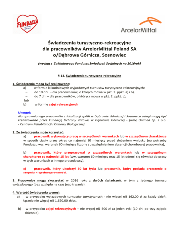Świadczenia turystyczno-rekreacyjne dla pracowników ArcelorMittal Poland SA o/Dąbrowa Górnicza, Sosnowiec (wyciąg z Zakładowego Funduszu Świadczeń Socjalnych na 2016rok) § 13. Świadczenia turystyczno-rekreacyjne 1. Świadczenia mogą być realizowane: a) w formie kilkudniowych wyjazdowych turnusów turystyczno-rekreacyjnych: − do 10 dni – dla pracowników, o których mowa w pkt. 2. ppkt. a) i b), − do 7 dni – dla pracowników, o których mowa w pkt. 2. ppkt. c), lub b) w formie zajęć rekreacyjnych Uwaga!: dla uprawnionego pracownika z lokalizacji spółki w Dąbrowie Górniczej i Sosnowcu usługi mogą być zrealizowane przez Fundację Ochrony Zdrowia w Dąbrowie Górniczej - firmę Unimed Sp. z o.o. - Centrum Rehabilitacji i Odnowy Biologicznej. 2. Ze świadczenia może korzystać: a) pracownik wykonujący pracę w szczególnych warunkach lub w szczególnym charakterze w sposób ciągły przez okres co najmniej 60 miesięcy przed złożeniem wniosku (na potrzeby Funduszu ww. warunek 60 miesięcy liczony z uwzględnieniem absencji chorobowej pracownika), b) pracownik, który przepracował w szczególnych warunkach lub w szczególnym charakterze co najmniej 15 lat (ww. warunek 60 miesięcy oraz 15 lat odnosi się również do pracy w tych warunkach u innego pracodawcy), c) pracownik, który ukończył 50 lat życia lub pracownik, który posiada orzeczenie o stopniu niepełnosprawności. 3. Pracownicy mogą skorzystać w 2016 roku z dwóch świadczeń, w tym z jednego turnusu wyjazdowego (bez względu na czas jego trwania). 4. Wartość świadczenia wynosi: a) w przypadku wyjazdowych turnusów turystycznych - nie więcej niż 162,00 zł za każdy dzień, łącznie nie więcej niż 1.620,00 zł/os, b) w przypadku zajęć rekreacyjnych – nie więcej niż 500 zł za jeden cykl (10 dni po trzy zajęcia dziennie). Informacje dodatkowe • • • • • • • • • • • • Uprawniony pracownik ArcelorMittal Poland S.A. zgłasza się osobiście do B.P. PARTNER BPO – budynek Polikliniki lub do pracownika BP PARTNER BPO w o/Sosnowiec w celu pobrania/złożenia wniosku dot. zajęć rekreacyjnych i weryfikacji uprawnień. Pracownik zgłasza się osobiście z dokumentami tj. wnioskiem o zrealizowanie zajęć rekreacyjnych oraz z ewentualną dokumentacją schorzeń do UNIMEDU – REJESTRACJA Dąbrowa Górnicza, Al. J. Piłsudskiego 92 tel. 32 792 88 81 w celu wizyty lekarskiej, a następnie ustalenia rodzajów i terminu zajęć. Godziny otwarcia: 7.00 – 18.00. Pracownik wraca do BP PARTNER BPO w celu uregulowania odpłatności w kasie za zajęcia (cena za zajęcia – dofinansowanie z ZFŚŚ = odpłatność uprawnionego pracownika). Uwaga !!! Warunkiem rozpoczęcia zajęć jest uregulowanie odpłatności. Dofinasowanie zgodnie z TABELĄ NR 3a lub 3b – dopłaty z ZFŚS do świadczeń turystyczno rekreacyjnych. Warunkiem otrzymania dofinansowania jest złożenie dokumentu „Informacja o dochodach w rodzinie” na potrzeby ZFŚŚ ArcelorMittal Poland S.A. Pracownik, który przepracował w szczególnych warunkach lub w szczególnym charakterze, co najmniej 15 lat, składając wniosek na drugie świadczenie w 2016 r. jest zwolniony obowiązku dołączania zaświadczenia potwierdzającego przepracowanie 15 lat. W 2016 roku pracownicy mogą skorzystać z dwóch świadczeń w tym z jednego turnusu wyjazdowego Cena za zajęcia rekreacyjne nie może przekraczać 500 zł – 10 dni po 3 zabiegi. W przypadku braku realizacji całości usługi z winy pracownika, który zgłosił się na konsultację, rozpoczął zajęcia i przestał na nie chodzić (nie posiada L-4, nie został dodatkowo w pracy) – świadczenie będzie płatne tak jak przy pełnej realizacji. Zajęcia rekreacyjne będą się odbywały poza godzinami pracy w ramach czasu wolnego pracownika, aby nie kolidowały z obowiązkami zawodowymi. Spółka UNIMED przewiduje możliwość zmiany godzin wykonywania zajęć dostosowanych do indywidualnych potrzeb klienta. Wnioski o skierowanie na świadczenie rekreacyjne przyjmowane są do dnia 7 grudnia 2016!!! Rozpoczęcie realizacji zabiegów nie później niż 30 dni kalendarzowych od daty złożenia wniosku! Przy czym zakończenie zabiegów nie później niż do dnia 31 grudnia 2016 r. TABELA NR 3a - DLA PRACOWNIKÓW WYKONUJĄCYCH PRACĘ W SZCZEGÓLNYCH WARUNKACH LUB W SZCZEGÓLNYM CHARAKTERZE LP. Wysokość dochodu na osobę w rodzinie (w złotych) % dopłata do świadczenia dla pracownika z ZFŚS 1. 2. 3. 4. 5. do 1000,00 1000,01 – 2000,00 2000,01 – 3000,00 3000,01 – 5000,00 Powyżej 5000,00 99% 90% 80% 70% 30% TABELA NR 3b - DLA PRACOWNIKÓW, KTÓRZY UKOŃCZYLI 50 LAT ŻYCIA, KTÓRZY POSIADAJĄ ORZECZENIE O NIEPEŁNOSPRAWNOŚCI LP. 1. 2. 3. 4. 5. Wysokość dochodu na osobę w rodzinie (w złotych) do 1000,00 1000,01 – 2000,00 2000,01 – 3000,00 3000,01 – 5000,00 Powyżej 5000,00 % dopłata do świadczenia dla pracownika z ZFŚS 85% 70% 55% 30% 0% www.unimed.dabrowa.pl Katalog zabiegów Elektrostymulacja, tonoliza Jonoforeza Galwanizacja, diadynamik Interdyn, tens, prądy Kotza, prądy Trauberta Laser Lampa Sollux Ultradźwięki Fonoforeza Pole magnetyczne Gorące okłady Aquavibron – jedna okolica (10 min) Kąpiel wirowa duża Kąpiel wirowa mała Masaż podwodny + perełki Masaż klasyczny – odcinek C Masaż klasyczny – obręcz barkowa Masaż klasyczny – odcinek TH Masaż klasyczny – odcinek LS Masaż klasyczny – cały kręgosłup Masaż klasyczny – kończyna górna Masaż klasyczny – kończyna dolna Masaż klasyczny – twarz Krioterapia Ćwiczenia indywidualne bloczkowe Ćwiczenia indywidualne inne (20 min) Wyciąg kręgosłupa szyjnego Wyciąg kręgosłupa lędźwiowego Drenaż limfatyczny – masaż aparatem LYMPHA TRON Okłady borowinowe Siłownia x 1 Cena jednego zabiegu w zł. Cena za 10 zabiegów w zł. 8,00 8,00 8,00 8,00 9,00 7,00 8,00 10,00 10,00 8,00 10,00 15,00 7,00 21,00 14,00 16,00 16,00 16,00 24,00 16,00 19,00 13,00 11,00