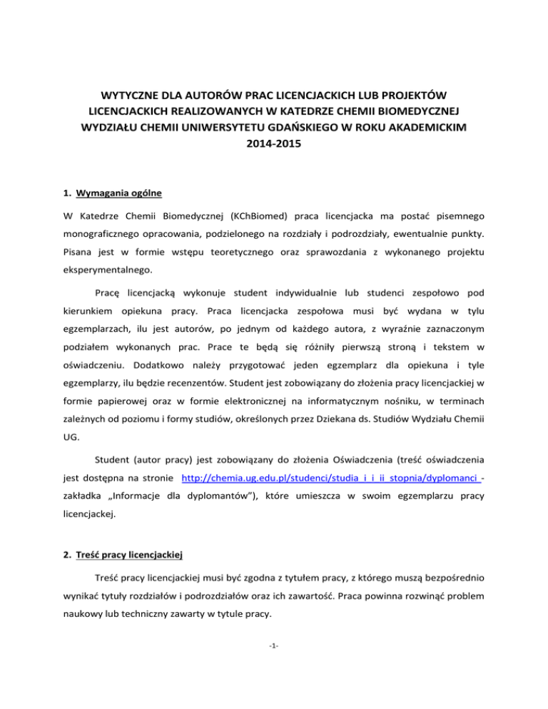 WYTYCZNE DLA AUTORÓW PRAC LICENCJACKICH LUB PROJEKTÓW LICENCJACKICH REALIZOWANYCH W KATEDRZE CHEMII BIOMEDYCZNEJ WYDZIAŁU CHEMII UNIWERSYTETU GDAŃSKIEGO W ROKU AKADEMICKIM 2014-2015 1. Wymagania ogólne W Katedrze Chemii Biomedycznej (KChBiomed) praca licencjacka ma postać pisemnego monograficznego opracowania, podzielonego na rozdziały i podrozdziały, ewentualnie punkty. Pisana jest w formie wstępu teoretycznego oraz sprawozdania z wykonanego projektu eksperymentalnego. Pracę licencjacką wykonuje student indywidualnie lub studenci zespołowo pod kierunkiem opiekuna pracy. Praca licencjacka zespołowa musi być wydana w tylu egzemplarzach, ilu jest autorów, po jednym od każdego autora, z wyraźnie zaznaczonym podziałem wykonanych prac. Prace te będą się różniły pierwszą stroną i tekstem w oświadczeniu. Dodatkowo należy przygotować jeden egzemplarz dla opiekuna i tyle egzemplarzy, ilu będzie recenzentów. Student jest zobowiązany do złożenia pracy licencjackiej w formie papierowej oraz w formie elektronicznej na informatycznym nośniku, w terminach zależnych od poziomu i formy studiów, określonych przez Dziekana ds. Studiów Wydziału Chemii UG. Student (autor pracy) jest zobowiązany do złożenia Oświadczenia (treść oświadczenia jest dostępna na stronie http://chemia.ug.edu.pl/studenci/studia_i_i_ii_stopnia/dyplomanci zakładka „Informacje dla dyplomantów”), które umieszcza w swoim egzemplarzu pracy licencjackej. 2. Treść pracy licencjackiej Treść pracy licencjackiej musi być zgodna z tytułem pracy, z którego muszą bezpośrednio wynikać tytuły rozdziałów i podrozdziałów oraz ich zawartość. Praca powinna rozwinąć problem naukowy lub techniczny zawarty w tytule pracy. -1- Praca składa się z dwóch (głównych) części: a. Teoretycznej – przeglądu literaturowego na zadany temat b. Eksperymentalnej (praktycznej) – sprawozdania z pracy wykonanej w laboratorium Obie części muszą być spięte w jedną całość, wydrukowane i oprawione (zbindowane) zgodnie z ogólnymi wytycznymi obowiązującymi na Wydziale Chemii UG dostępnymi na stronie http://chemia.ug.edu.pl/studenci/studia_i_i_ii_stopnia/dyplomanci - zakładka „Informacje dla dyplomantów” Praca licencjacka nie może nosić znamion plagiatu. aAutor pracy, po uzyskaniu akceptacji opiekuna, przekazuje wersję elektroniczną pracy, o treści identycznej z wersją papierową, do weryfikacji przez system anty-plagiatowy. 3. Objętość pracy dyplomowej Typowa praca dyplomowa licencjacka w KChBiomed zawiera około 20 stron tekstu oraz dodatki (nie licząc strony tytułowej, spisu treści, spisu rysunków i tabel itp.) 4. Techniczne zasady pisania prac dyplomowych Podczas opracowywania pracy dyplomowej należy przyjąć następujące ustalenia: • zalecana czcionka Times New Roman (konsekwentnie stosowana w całej pracy), • rozmiar czcionki: tytuły rozdziałów 16 pkt, tytuły podrozdziałów 14 pkt i tekst 12 pkt, • marginesy dla wydruku jednostronnego: wewnętrzny 3,5 cm, zewnętrzny 2,5 cm, górny i dolny 2,5 cm; • marginesy dla wydruku dwustronnego – do archiwum: lustrzane • interlinia 1,5 wiersza, • odstępy w pracy 12 pt przed i 12 pt po dla tytułów, podtytułów, akapitów, • numerowanie stron automatyczne bez numeru strony na stronie tytułowej, w prawym dolnym rogu strony, • tekst justowany obustronnie. -2- 5. Recenzje prac dyplomowych Prace będą recenzowane zgodnie z Regulaminem Studiów Uniwersytetu Gdańskiego W KChBiomed zaleca się wybór recenzenta z innej Katedry. Recenzent nie może pochodzić z tej samej jednostki (pracowni) co promotor. 6. Archiwizacja prac dyplomowych Prace będą archiwizowane w ogólnopolskim repozytorium pisemnych prac dyplomowych (podstawa prawna: Ustawa o Szkolnictwie Wyższym, art. 167b). 7. ZŁOŻENIE PRACY DYPLOMOWEJ Student zobowiązany jest do złożenia pracy dyplomowej najpóźniej na 14 dni przed planowanym terminem egzaminu dyplomowego – TERMIN NIEPRZEKRACZALNY!!!! Ostateczny termin złożenia pracy dyplomowej to: do końca września danego roku akademickiego. Jeśli w ostatecznym terminie student nie złoży pracy dyplomowej, bądź nie uzyska zgody Dziekana na przesunięcie terminu złożenia pracy dyplomowej, wówczas stosuje się Regulamin Studiów Uniwersytetu Gdańskiego. Katedra Chemii Biomedycznej Gdańsk, 19.05.2015 r. -3-