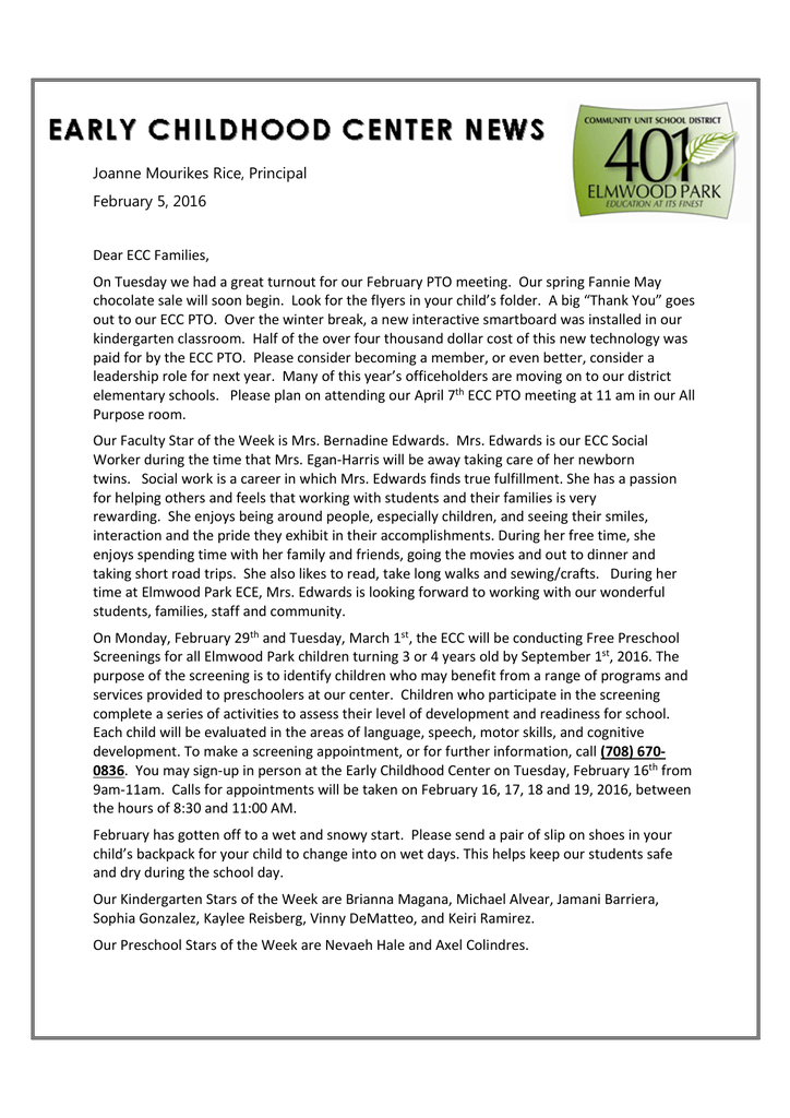 Joanne Mourikes Rice, Principal February 5, 2016 Dear ECC Families, On Tuesday we had a great turnout for our February PTO meeting. Our spring Fannie May chocolate sale will soon begin. Look for the flyers in your child’s folder. A big “Thank You” goes out to our ECC PTO. Over the winter break, a new interactive smartboard was installed in our kindergarten classroom. Half of the over four thousand dollar cost of this new technology was paid for by the ECC PTO. Please consider becoming a member, or even better, consider a leadership role for next year. Many of this year’s officeholders are moving on to our district elementary schools. Please plan on attending our April 7th ECC PTO meeting at 11 am in our All Purpose room. Our Faculty Star of the Week is Mrs. Bernadine Edwards. Mrs. Edwards is our ECC Social Worker during the time that Mrs. Egan-Harris will be away taking care of her newborn twins. Social work is a career in which Mrs. Edwards finds true fulfillment. She has a passion for helping others and feels that working with students and their families is very rewarding. She enjoys being around people, especially children, and seeing their smiles, interaction and the pride they exhibit in their accomplishments. During her free time, she enjoys spending time with her family and friends, going the movies and out to dinner and taking short road trips. She also likes to read, take long walks and sewing/crafts. During her time at Elmwood Park ECE, Mrs. Edwards is looking forward to working with our wonderful students, families, staff and community. On Monday, February 29th and Tuesday, March 1st, the ECC will be conducting Free Preschool Screenings for all Elmwood Park children turning 3 or 4 years old by September 1st, 2016. The purpose of the screening is to identify children who may benefit from a range of programs and services provided to preschoolers at our center. Children who participate in the screening complete a series of activities to assess their level of development and readiness for school. Each child will be evaluated in the areas of language, speech, motor skills, and cognitive development. To make a screening appointment, or for further information, call (708) 6700836. You may sign-up in person at the Early Childhood Center on Tuesday, February 16th from 9am-11am. Calls for appointments will be taken on February 16, 17, 18 and 19, 2016, between the hours of 8:30 and 11:00 AM. February has gotten off to a wet and snowy start. Please send a pair of slip on shoes in your child’s backpack for your child to change into on wet days. This helps keep our students safe and dry during the school day. Our Kindergarten Stars of the Week are Brianna Magana, Michael Alvear, Jamani Barriera, Sophia Gonzalez, Kaylee Reisberg, Vinny DeMatteo, and Keiri Ramirez. Our Preschool Stars of the Week are Nevaeh Hale and Axel Colindres. Joanne Mourikes Rice, Directora Estimadas Familias del Centro ECC, El martes tuvimos una gran concurrencia para nuestra reunión de la PTO de febrero. Muy pronto se estará dando comienzo a nuestra venta de primavera de chocolates de Fannie May. Busque la hoja que se estará enviando a casa en la carpeta de su niño/a. Muchísimas gracias a nuestra PTO del Centro ECC. Durante el receso de invierno, una pizarra interactiva inteligente fue instalada en nuestro salón de clase de kindergarten. La mitad de los cuatro mil dólares del costo de esta nueva tecnología fue cubierta por nuestra PTO del Centro ECC. Por favor considere el hacerse miembro, o tal vez, considere el papel de ser un líder para el próximo año. Varios de los oficiales de este año se estarán moviendo a las escuelas elementales del distrito. Por favor haga planes para asistir a nuestra reunión de la PTO del centro ECC de abril a las 11 am en el cuarto Multiusos. Nuestro personal Estrella de la semana es la Señora Bernadine Edwards. La Señora Edwards es la Trabajadora Social ECC que estará cubriendo a la Señora Egan-Harris mientras ella este atendiendo de sus gemelos recién nacidos. El trabajo de Trabajadora Social es una carrera en el cual la Señora Edwards encuentra gran satisfacción. Ella le apasiona el ayudar a otros y siente que el trabajar con los estudiantes y sus familias es muy gratificante. Ella disfruta de estar con las personas, especialmente de los niñitos y de ver sus sonrisas, interacción y el orgullo que ellos expresan por sus logros. Durante su tiempo libre, ella disfruta de pasar tiempo con su familia y amigos, ir al cine, ir a cenar y tomar paseos cortos por carretera. A ella le gusta también leer, tomar caminatas largas y de coser/hacer manualidades. Mientras esté trabajando aquí en el Centro ECC de Elmwood Park, la señora Edwards está deseosa de trabajar con nuestros maravillosos estudiantes, familias, trabajadores y la comunidad. El lunes 29 de febrero y martes 1ro de marzo el Centro ECC estará conduciendo La Prueba de Detección Preescolar Gratis, para todos los niños residentes de Elmwood Park, que tendrán de 3 o 4 años de edad para el 1ro de septiembre del 2016. El propósito de esta prueba es el poder identificar a los niños que podrán beneficiarse de una gran variedad de programas y servicios que se ofrecen a los preescolares en nuestro centro. Los niños que participen de esta prueba estarán completando una serie de actividades para asesorar su nivel de desarrollo y preparación para la escuela. Cada niño será evaluado en el área de lenguaje, habla, habilidad motora y desarrollo cognitivo. Para hacer una cita para las pruebas o para obtener cualquier información, llame al (708) 670-0836. Usted también podrá registrarse en persona viniendo al Centro de Educación Temprana, el martes 16 de febrero de 9am-11am. Las llamadas para las citas se estarán tomando el 16, 17, 18 y 19 de febrero del 2016, entre las horas de 8:30 y 11:00 AM. El mes de febrero ha tenido un comienzo de nieve y humedad. Por favor no se olvide de enviar un par de z