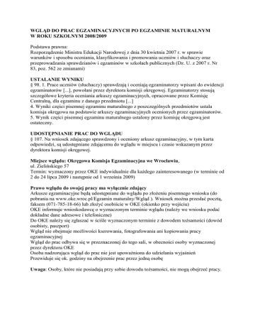 WGLĄD DO PRAC EGZAMINACYJNYCH PO EGZAMINIE MATURALNYM W ROKU SZKOLNYM 2008/2009 Podstawa prawna: Rozporządzenie Ministra Edukacji Narodowej z dnia 30 kwietnia 2007 r. w sprawie warunków i sposobu oceniania, klasyfikowania i promowania uczniów i słuchaczy oraz przeprowadzania sprawdzianów i egzaminów w szkołach publicznych (Dz. U. z 2007 r. Nr 83, poz. 562 ze zmianami) USTALANIE WYNIKU § 98. 1. Prace uczniów (słuchaczy) sprawdzają i oceniają egzaminatorzy wpisani do ewidencji egzaminatorów [...], powołani przez dyrektora komisji okręgowej. Egzaminatorzy stosują szczegółowe kryteria oceniania arkuszy egzaminacyjnych, opracowane przez Komisję Centralną, dla egzaminu z danego przedmiotu [...] 4. Wyniki części pisemnej egzaminu maturalnego z poszczególnych przedmiotów ustala komisja okręgowa na podstawie arkuszy egzaminacyjnych ocenionych przez egzaminatorów. 5. Wynik części pisemnej egzaminu maturalnego ustalony przez komisję okręgową jest ostateczny. UDOSTĘPNIANIE PRAC DO WGLĄDU § 107. Na wniosek zdającego sprawdzony i oceniony arkusz egzaminacyjny, w tym karta odpowiedzi, są udostępniane zdającemu do wglądu w miejscu i czasie wskazanym przez dyrektora komisji okręgowej. Miejsce wglądu: Okręgowa Komisja Egzaminacyjna we Wrocławiu, ul. Zielińskiego 57 Termin: wyznaczony przez OKE indywidualnie dla każdego zainteresowanego (w terminie od 2 do 24 lipca 2009 i następnie od 1 września 2009) Prawo wglądu do swojej pracy ma wyłącznie zdający Arkusze egzaminacyjne będą udostępniane do wglądu po złożeniu pisemnego wniosku (do pobrania na www.oke.wroc.pl/Egzamin maturalny/Wgląd ). Wniosek można przesłać pocztą, faksem (071-785-18-66) lub złożyć osobiście w OKE (okienko przy wejściu) OKE informuje wnioskodawcę o wyznaczonym terminie wglądu (należy we wniosku podać dokładne dane adresowe i telefoniczne) Do OKE należy się zgłaszać w ściśle wyznaczonym terminie z dowodem tożsamości (dowód osobisty, paszport) Wgląd nie obejmuje możliwości kserowania, fotografowania ani kopiowania pracy egzaminacyjnej Wgląd do prac odbywa się w przeznaczonej do tego sali, w obecności osoby wyznaczonej przez dyrektora OKE Osoba nadzorująca wgląd do prac nie jest upoważniona do udzielania wyjaśnień Przewiduje się ok. godziny na obejrzenie prac przez jedną osobę Uwaga: Osoby, które nie posiadają przy sobie dowodu tożsamości, nie mogą obejrzeć pracy.