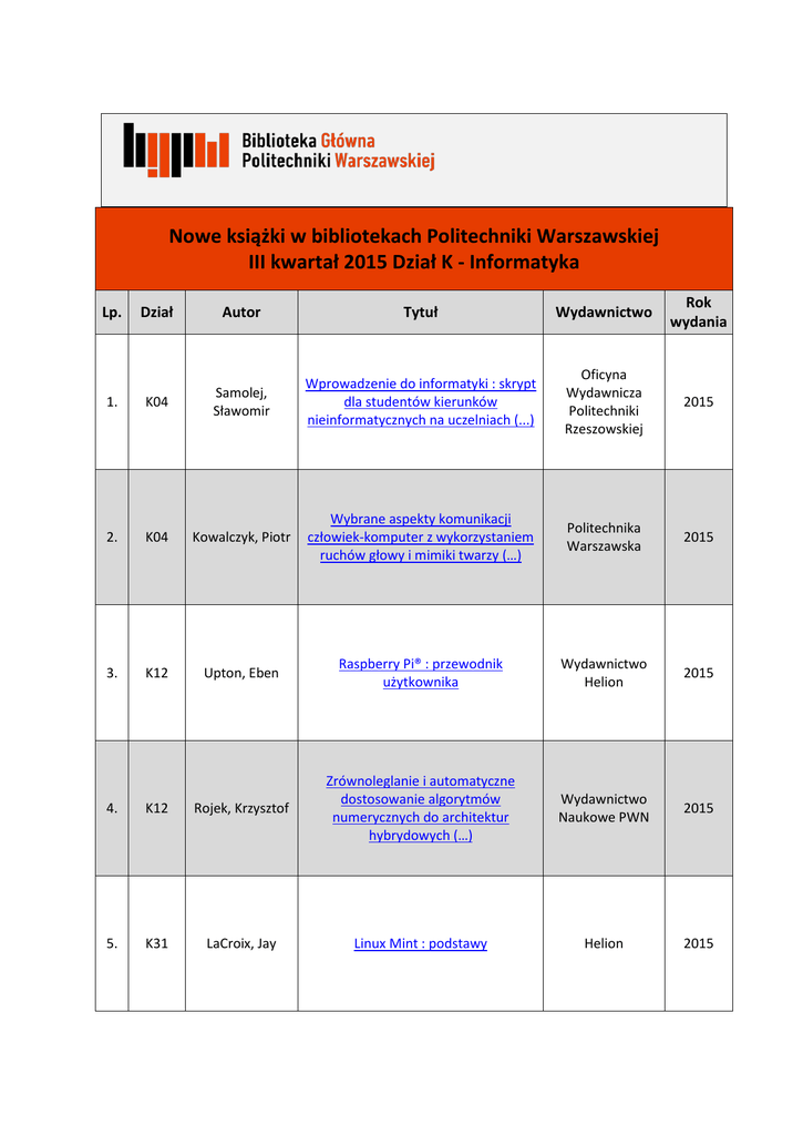 Nowe książki w bibliotekach Politechniki Warszawskiej III kwartał