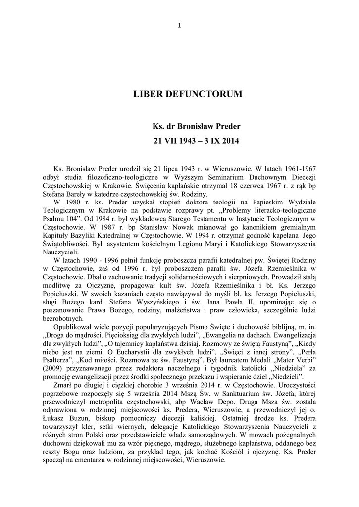 1 LIBER DEFUNCTORUM Ks. dr Bronisław Preder 21 VII 1943 – 3 IX 2014 Ks. Bronisław Preder urodził się 21 lipca 1943 r. w Wieruszowie. W latach 1961-1967 odbył studia filozoficzno-teologiczne w Wyższym Seminarium Duchownym Diecezji Częstochowskiej w Krakowie. Święcenia kapłańskie otrzymał 18 czerwca 1967 r. z rąk bp Stefana Bareły w katedrze częstochowskiej św. Rodziny. W 1980 r. ks. Preder uzyskał stopień doktora teologii na Papieskim Wydziale Teologicznym w Krakowie na podstawie rozprawy pt. „Problemy literacko-teologiczne Psalmu 104”. Od 1984 r. był wykładowcą Starego Testamentu w Instytucie Teologicznym w Częstochowie. W 1987 r. bp Stanisław Nowak mianował go kanonikiem gremialnym Kapituły Bazyliki Katedralnej w Częstochowie. W 1994 r. otrzymał godność kapelana Jego Świątobliwości. Był asystentem kościelnym Legionu Maryi i Katolickiego Stowarzyszenia Nauczycieli. W latach 1990 - 1996 pełnił funkcję proboszcza parafii katedralnej pw. Świętej Rodziny w Częstochowie, zaś od 1996 r. był proboszczem parafii św. Józefa Rzemieślnika w Częstochowie. Dbał o zachowanie tradycji solidarnościowych i sierpniowych. Prowadził stałą modlitwę za Ojczyznę, propagował kult św. Józefa Rzemieślnika i bł. Ks. Jerzego Popiełuszki. W swoich kazaniach często nawiązywał do myśli bł. ks. Jerzego Popiełuszki, sługi Bożego kard. Stefana Wyszyńskiego i św. Jana Pawła II, upominając się o poszanowanie Prawa Bożego, rodziny, małżeństwa i praw człowieka, szczególnie ludzi bezrobotnych. Opublikował wiele pozycji popularyzujących Pismo Święte i duchowość biblijną, m. in. „Droga do mądrości. Pięcioksiąg dla zwykłych ludzi”, „Ewangelia na dachach. Ewangelizacja dla zwykłych ludzi”, „O tajemnicy kapłaństwa dzisiaj. Rozmowy ze świętą Faustyną”, „Kiedy niebo jest na ziemi. O Eucharystii dla zwykłych ludzi”, „Święci z innej strony”, „Perła Psałterza”, „Kod miłości. Rozmowa ze św. Faustyną”. Był laureatem Medali „Mater Verbi” (2009) przyznawanego przez redaktora naczelnego i tygodnik katolicki „Niedziela” za promocję ewangelizacji przez środki społecznego przekazu i wspieranie dzieł „Niedzieli”. Zmarł po długiej i ciężkiej chorobie 3 września 2014 r. w Częstochowie. Uroczystości pogrzebowe rozpoczęły się 5 września 2014 Mszą Św. w Sanktuarium św. Józefa, której przewodniczył metropolita częstochowski, abp Wacław Depo. Druga Msza św. została odprawiona w rodzinnej miejscowości ks. Predera, Wieruszowie, a przewodniczył jej o. Łukasz Buzun, biskup pomocniczy diecezji kaliskiej. Ostatniej drodze ks. Predera towarzyszył kler, setki wiernych, delegacje Katolickiego Stowarzyszenia Nauczycieli z różnych stron Polski oraz przedstawiciele władz samorządowych. W mowach pożegnalnych duchowni dziękowali mu za wzór pięknego, mądrego, służebnego kapłaństwa, oddanego bez reszty Bogu oraz ludziom, za przykład tego, jak kochać Kościół i ojczyznę. Ks. Preder spoczął na cmentarzu w rodzinnej miejscowości, Wieruszowie. 2 Przy opracowaniu biogramu wykorzystano następujące materiały: 1. P. Ostański, Bibliografia biblistyki polskiej 1945-1999, t. 1-2, Uniwersytet im. Adama Mickiewicza – Wydział Teologiczny. Series Bibliographica 1, Poznań 2002. 2. P. Ostański, Bibliografia biblistyki polskiej 2000-2009, t. 3-4, Uniwersytet im. Adama Mickiewicza – Wydział Teologiczny. Series Bibliographica 2, Poznań 2010. 3. Ks. Mariusz Frukacz/Niedziela: http://www.niedziela.pl/artykul/11221/Zmarl-kspral-Bronislaw-Preder-kustosz (03.09.2014) 4. http://www.tugazeta.pl/1,ostatnia-droga-ks-predera,15245.html (06.09.2014) 5. http://czestochowskie24.pl/kosciol/uroczystosci-pogrzebowe-ks-pral-bronislawa- predera/ (06.09.2014) 3 Ks. dr Henryk Lempa (6 III 1940 – 12 maja 2015) Ks. dr Henryk Lempa urodził się 6 marca 1940 roku w Nowym Bieruniu (pow. Tychy). Studia teologiczne odbył w Seminarium Duchownym we Wrocławiu. 24 czerwca 1966 roku przyjął święcenia kapłańskie i rozpoczął roczną pracę jako wikariusz w parafii pw. św. Anny w Ząbkowicach Śląskich. Następnie wyjechał do Rzymu, gdzie studiował najpierw na Papieskim Instytucie Biblijnym, gdzie w 1970 roku uzyskał licencjat nauk biblijnych. Studia specjalistyczne kontynuował na Uniwersytecie Gregoriańskim, gdzie w latach 1972-73 był asystentem prof. G. Berniniego i prowadził seminarium naukowe ze Starego Testamentu. Po powrocie do diecezji został wikariuszem w parafii pw. św. Henryka we Wrocławiu. W 1977 roku uzyskał doktorat z biblistyki na Katolickim Uniwersytecie Lubelskim. Jako adiunkt na Papieskim Wydziale Teologicznym we Wrocławiu wykładał historię zbawienia, środowisko biblijne i egzegezę Nowego Testamentu oraz język grecki. Wykładał także w seminarium duchownym w Nysie oraz we wrocławskim Kolegium Katechetycznym. Był sędzią prosynodalnym, członkiem Stowarzyszenia Biblistów Polskich, uczestnikiem Międzynarodowych Kolokwiów Qumranologicznych. Czterotomowa Bibliografia Bibliografia biblistyki polskiej 1945-2009 autorstwa ks. Ostańskiego wymienia ok. 30 pozycji ks. dr Henryka Lempy, w tym Podstawowy słownik grecko-polski Nowego Testamentu (2001), artykuły naukowe oraz liczne recenzje. Msza św. żałobna za śp. ks. Henryka Lempę odbyła się 15 maja o godz. 12 w katedrze wrocławskiej, a przewodniczył jej metropolita wrocławski, abp Józef Kupny. Następnego dnia odbyła się Msza pogrzebowa w parafii pw. Najświętszego Serca Pana Jezusa w Bieruniu Nowym, gdzie na miejscowym cmentarzu spoczął ś.p. ks. Lempa. 1. P. Ostański, Bibliografia biblistyki polskiej 1945-1999, t. 1-2, Uniwersytet im. Adama Mickiewicza – Wydział Teologiczny. Series Bibliographica 1, Poznań 2002. 2. P. Ostański, Bibliografia biblistyki polskiej 2000-2009, t. 3-4, Uniwersytet im. Adama Mickiewicza – Wydział Teologiczny. Series Bibliographica 2, Poznań 2010. 3. (13.05.